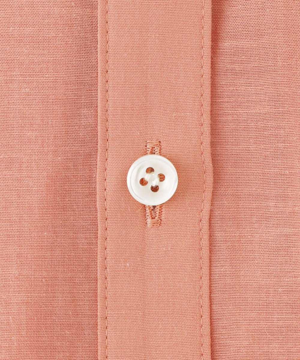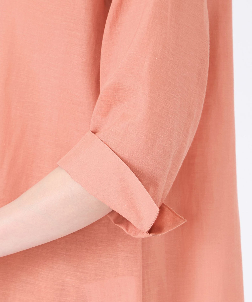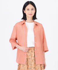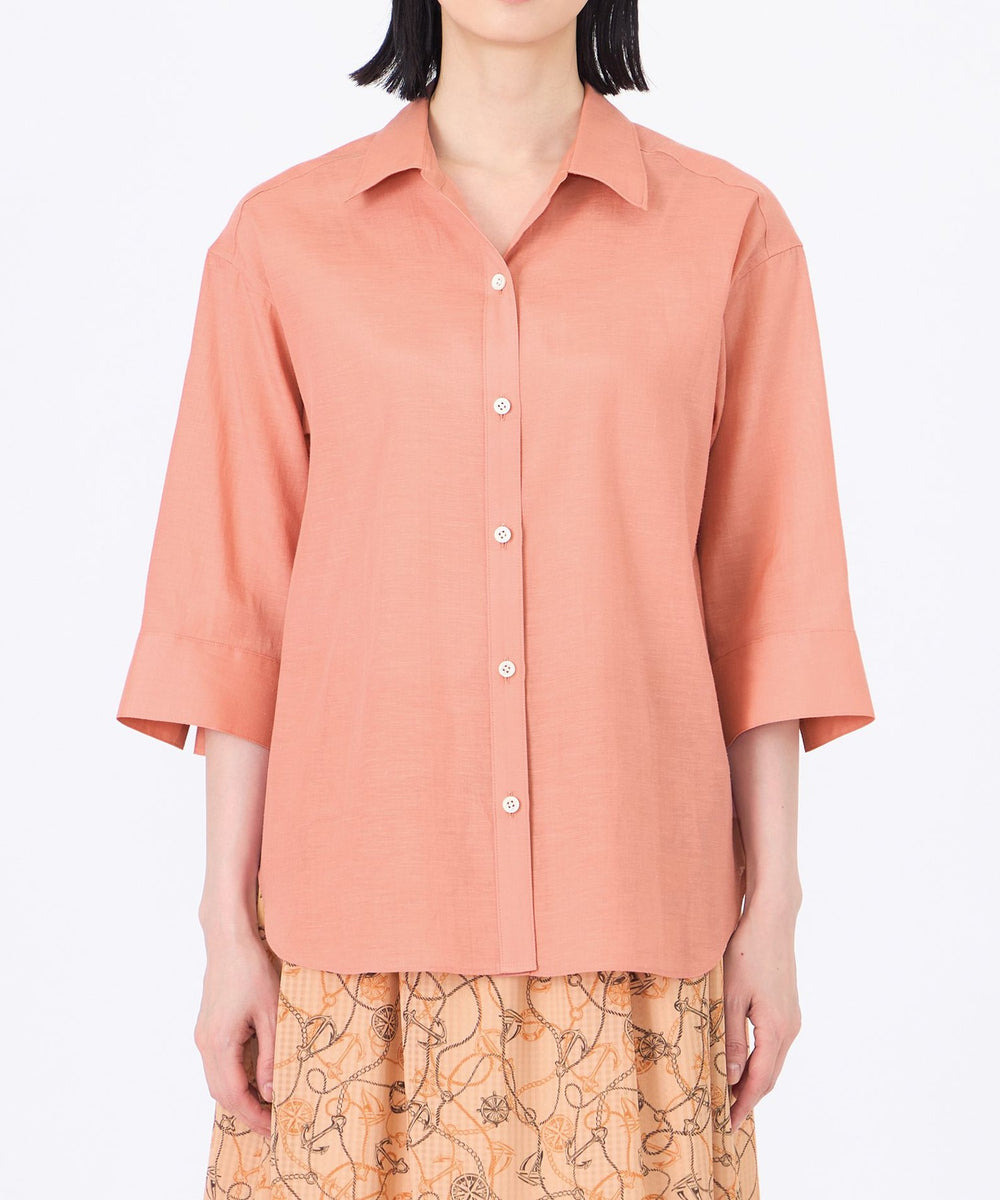襟にワイヤーが入った7分袖シャツです。首元に立体感を出せるデザインで、袖口のスリットにより袖丈の調整も可能です。一枚で着るのはもちろん、羽織りとしてもお使いいただける便利な一着です。