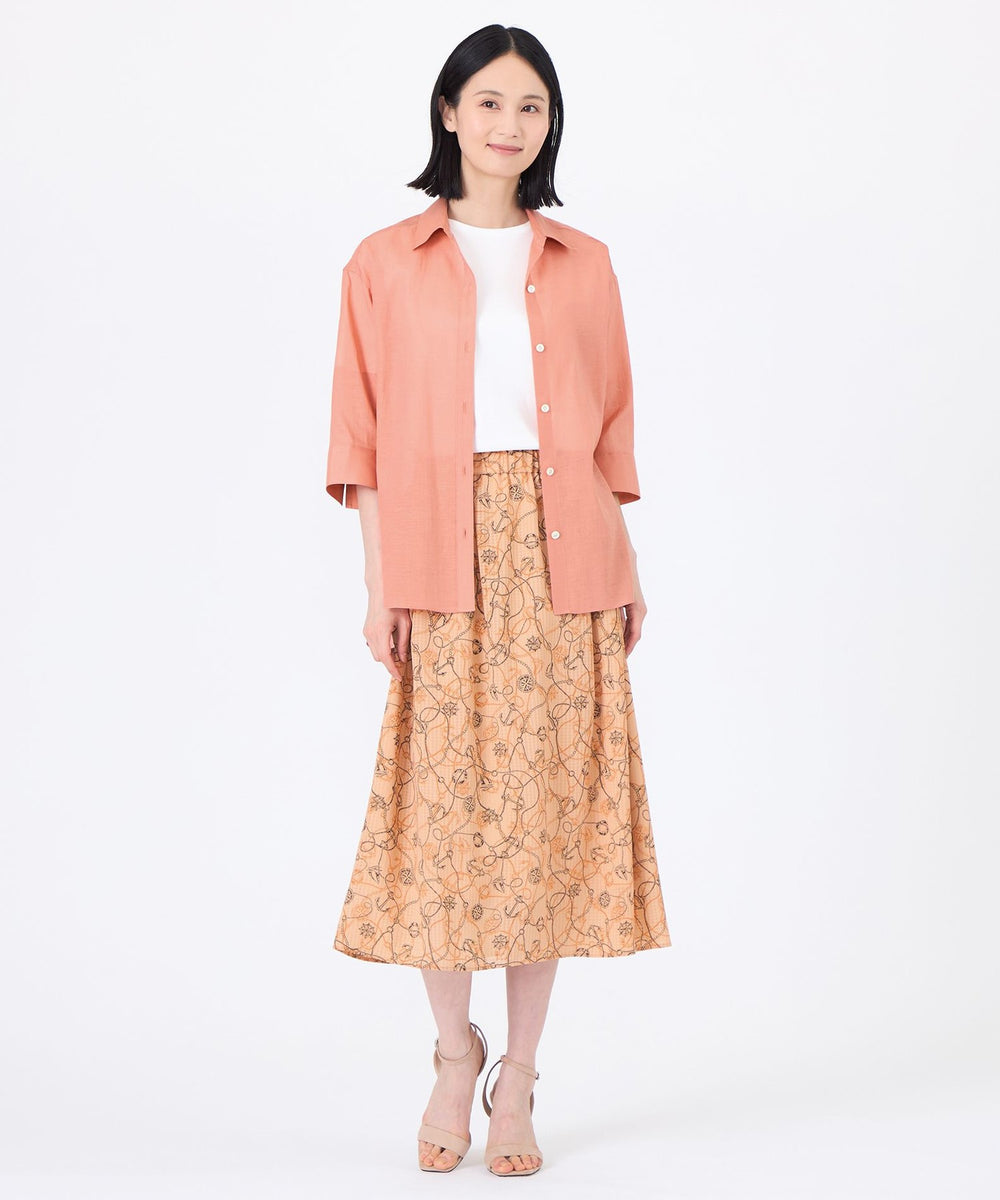 上品な光沢と天然素材のような爽やかな風合いを表現したローン素材です。リサイクル原料のポリエステルを使用し、接触冷感機能も備えているため、春夏の装いにおすすめです。