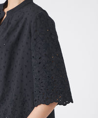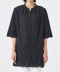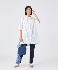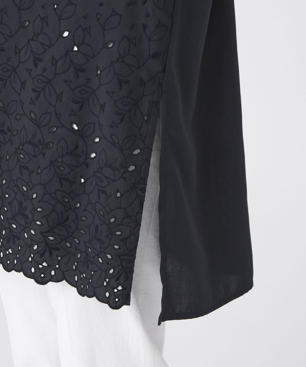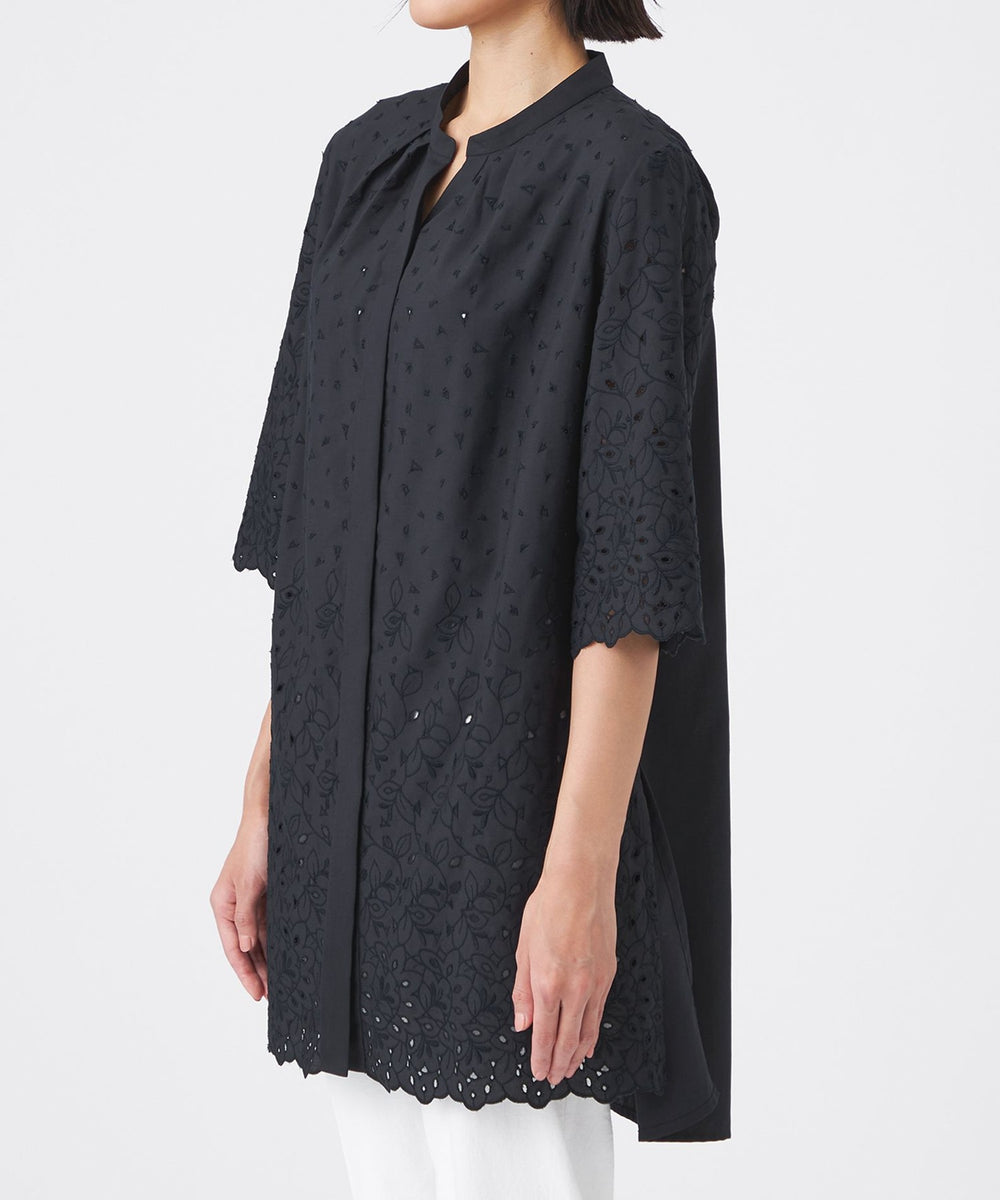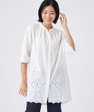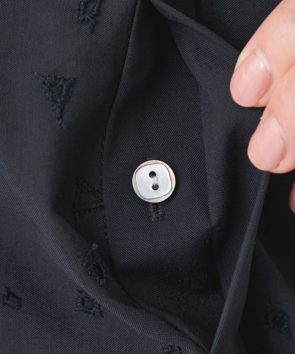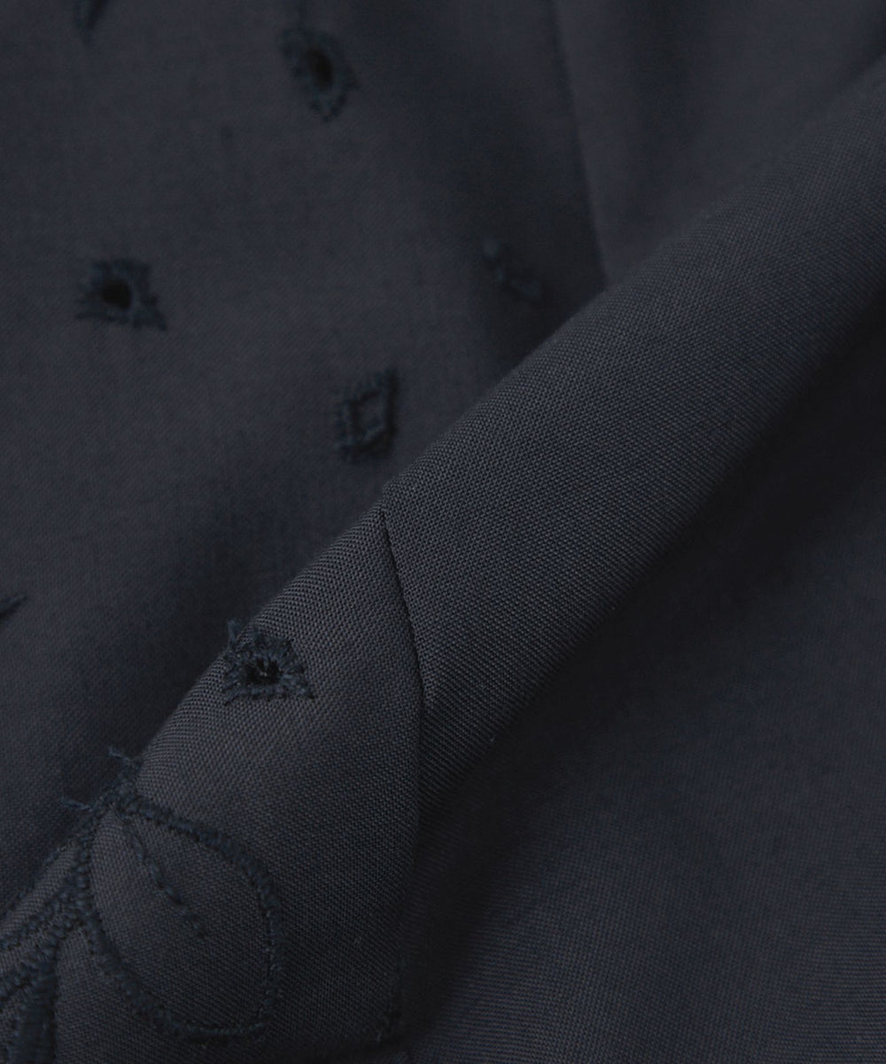 家庭洗濯可能なポリエステルタイプライターに、ボタニカルと幾何柄をミックスしたカットワーク刺繍を施しました。裾からグラデーションのように見えるデザインで、幾何柄を加えることで甘さを抑えたレース調に仕上げています。
