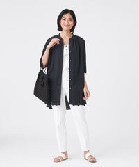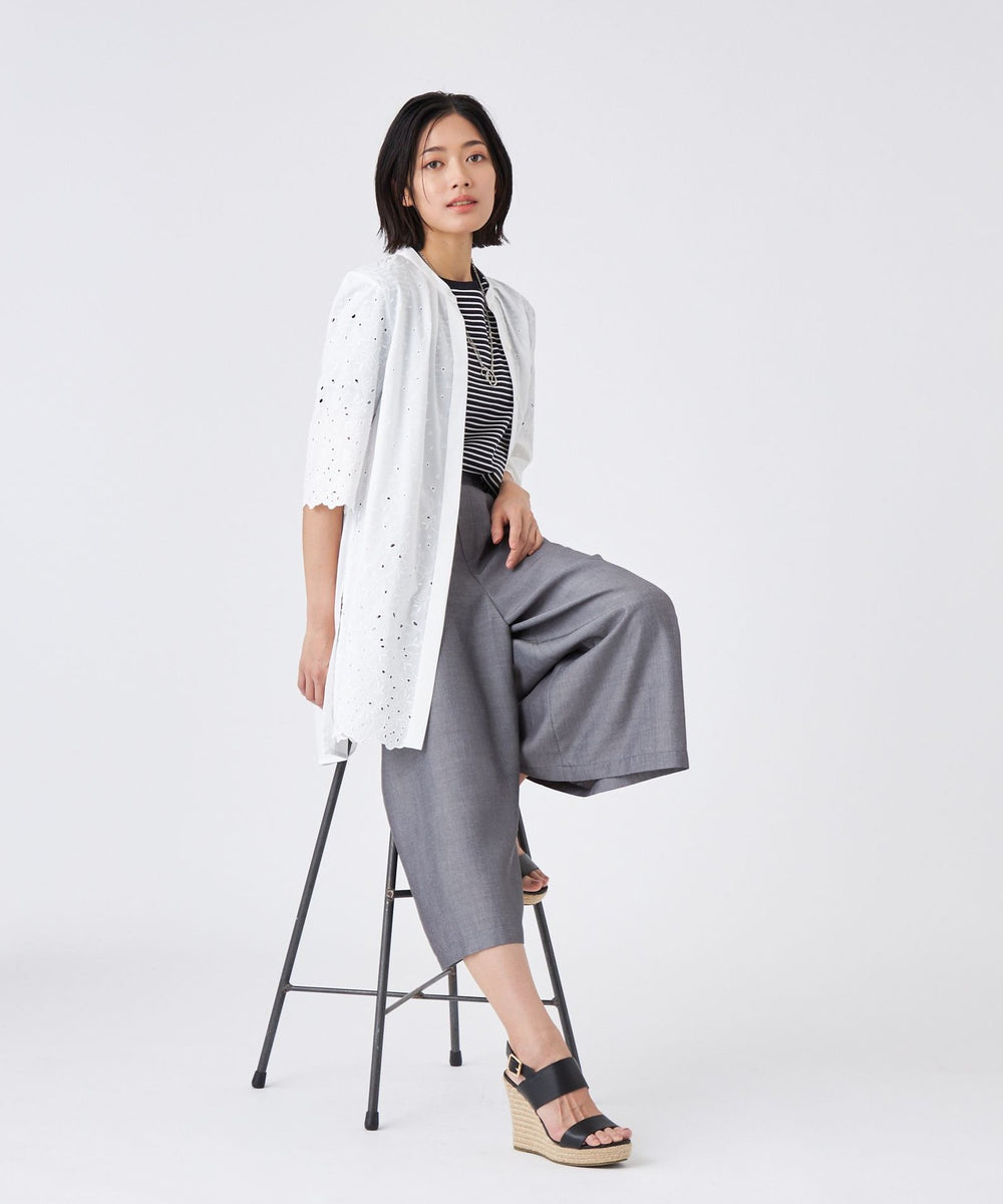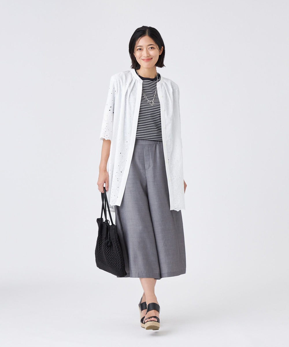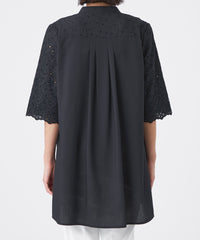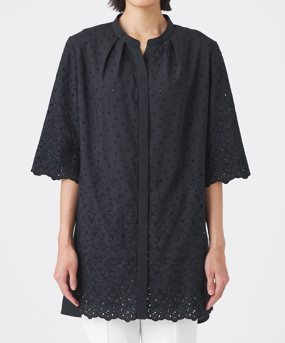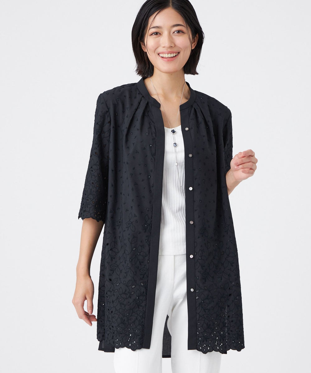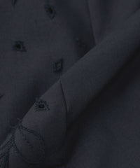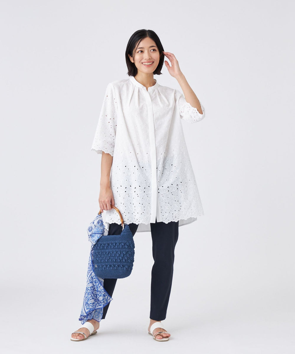 バンドカラーのキーネックにタックを入れ、ほどよい甘さをプラスしました。後ろ身頃は刺繍を施さず、甘くなりすぎないバランスに仕上げています。