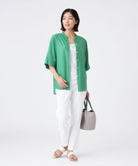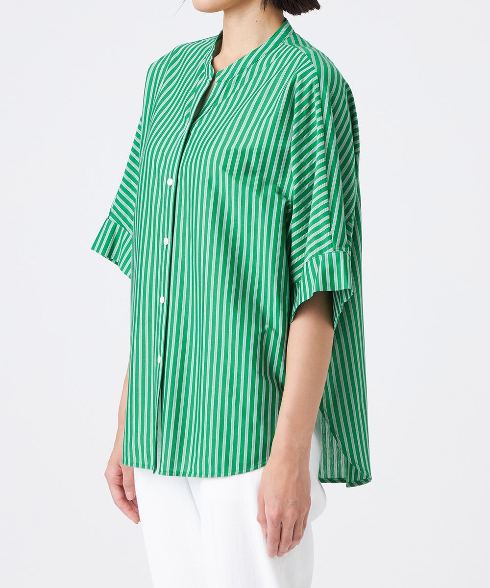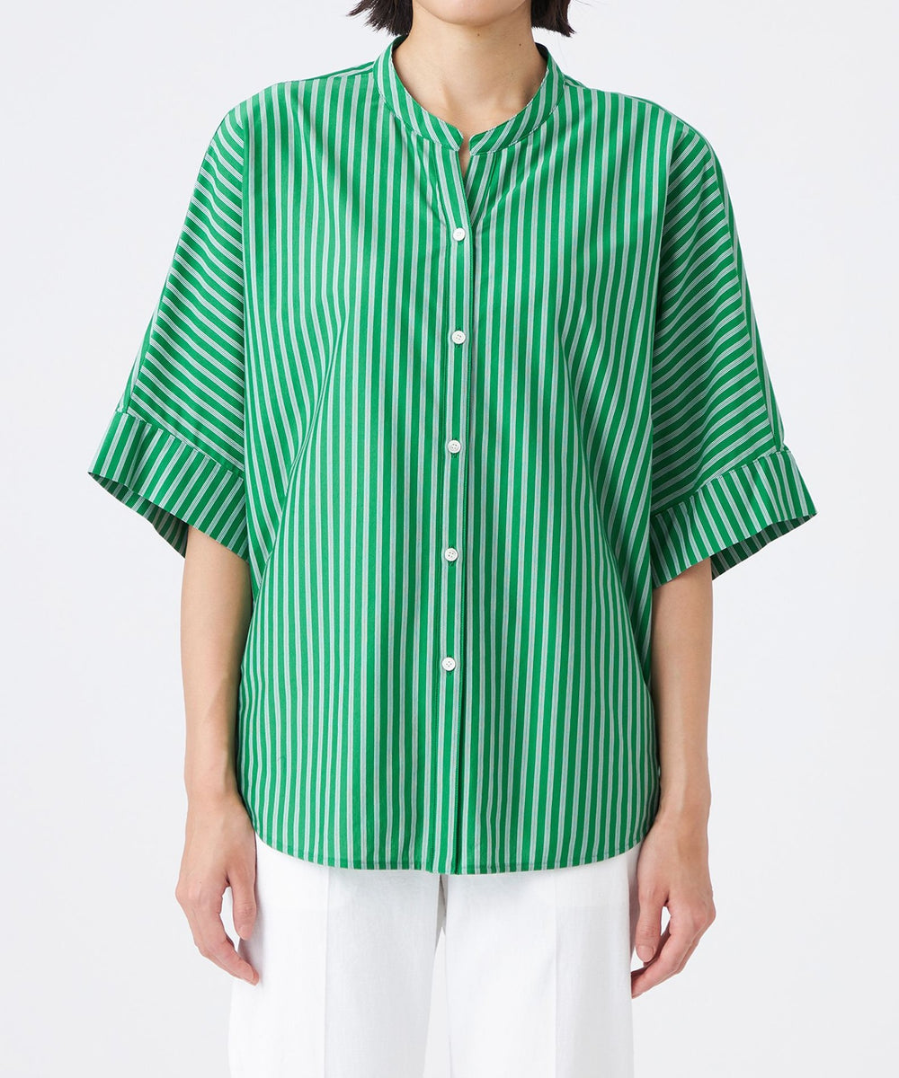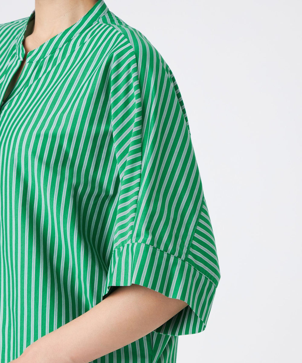 ドルマンスリーブが特徴のオーバーシルエットです。風通しが良く、夏でも快適な着心地です。バンドカラーのキーネックや前後差のある着丈が、抜け感のあるデザインを演出します。
