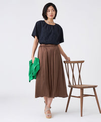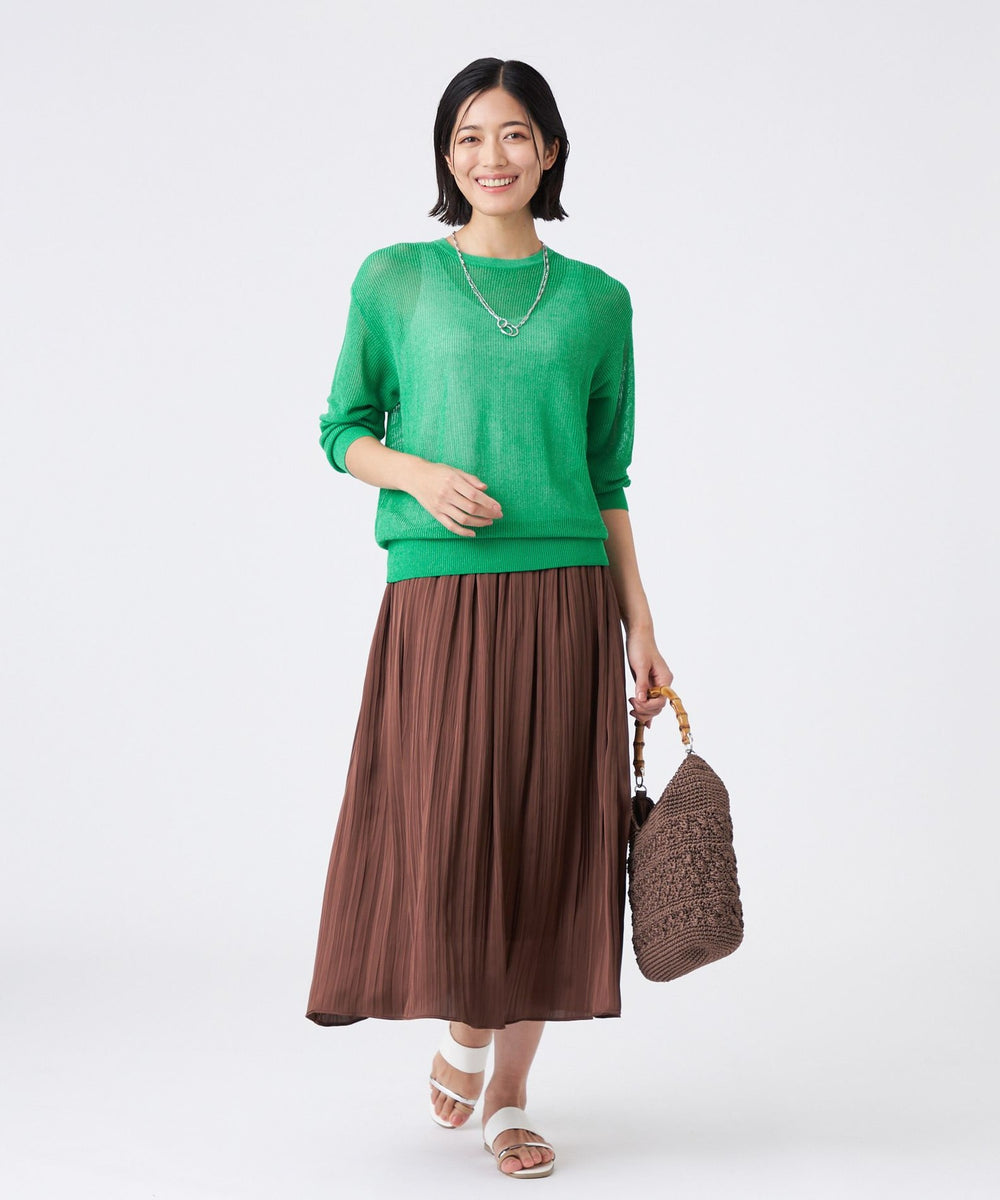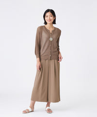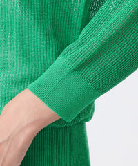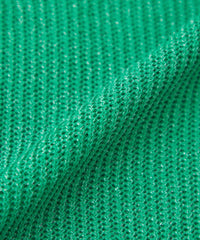 ドレープ感のあるレーヨンと柔らかな綿をブレンドした快適なコンフォートヤーンを使用しています。クリアなラメにスパークナイロンを重ねた極細糸を組み合わせることで、カジュアルすぎず柔らかさと華やかさを兼ね備えた仕上がりになっています。