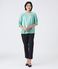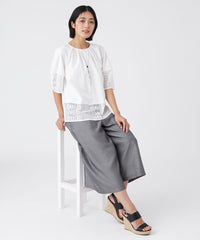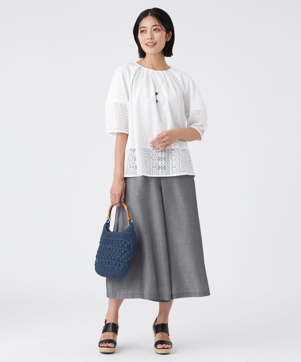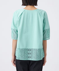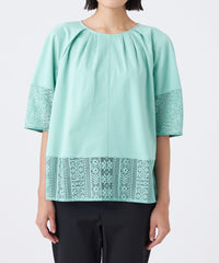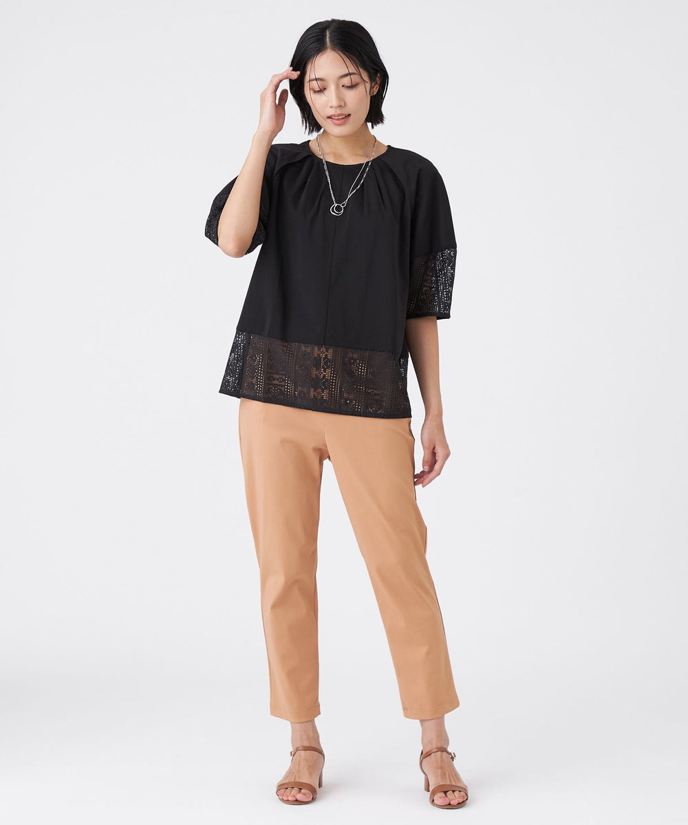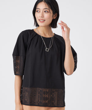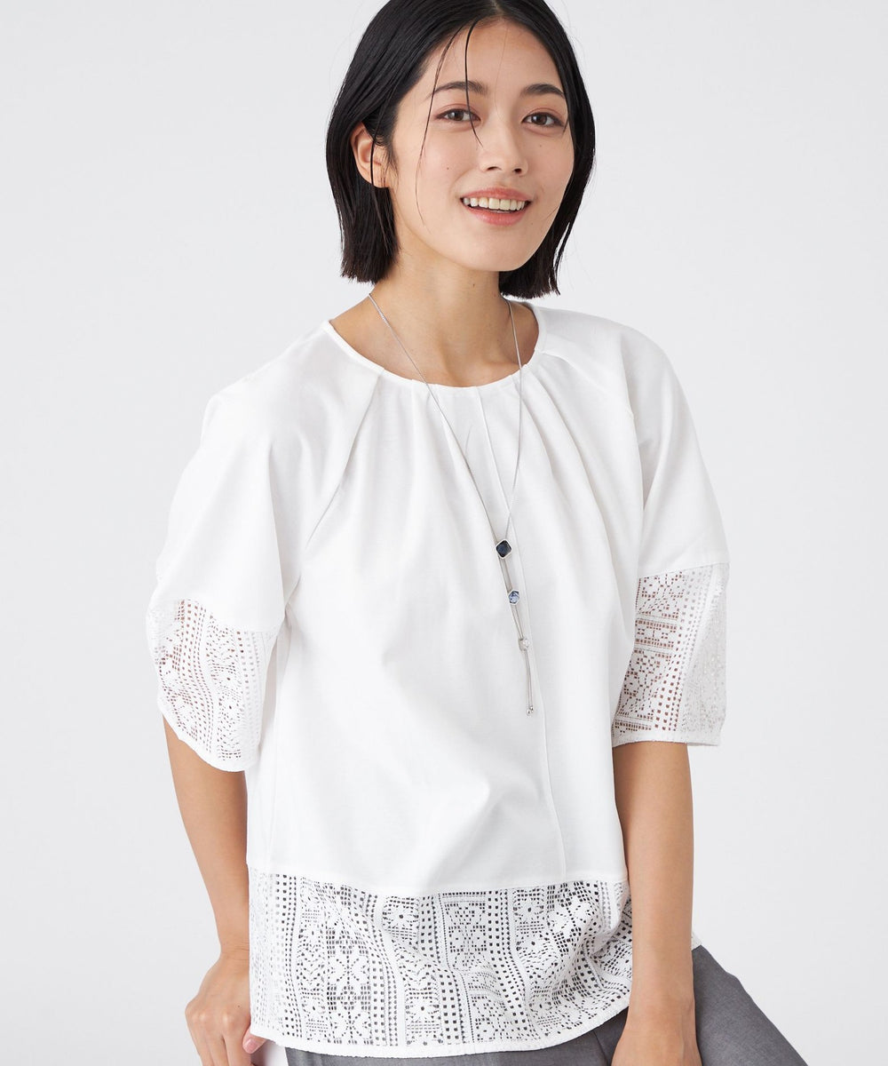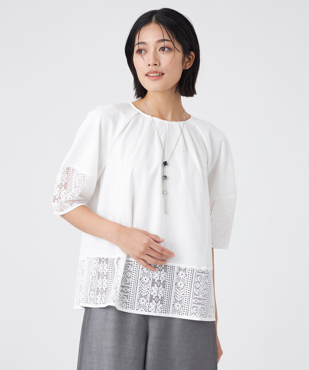 透け感のあるレース切り替えがアクセントになった、異素材ミックスのプルオーバーです。ふんわりとした袖のシルエットと、襟まわりに施したタックデザインが、立体的で構築的なフォルムを生み出しています。1枚で着映えし、夏のおしゃれを楽しめる嬉しいアイテムです。