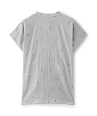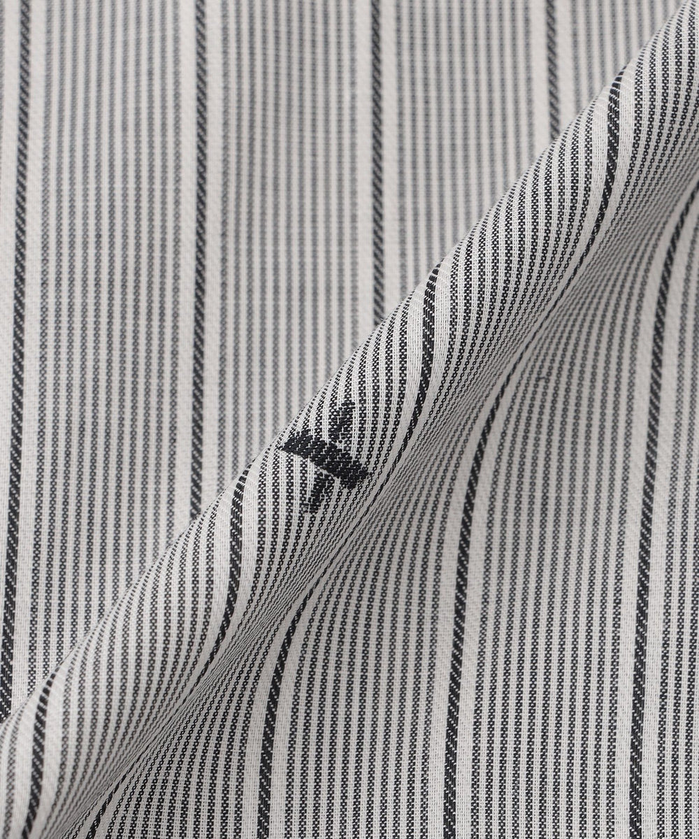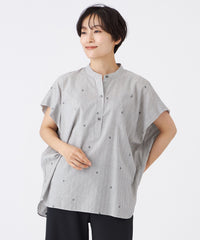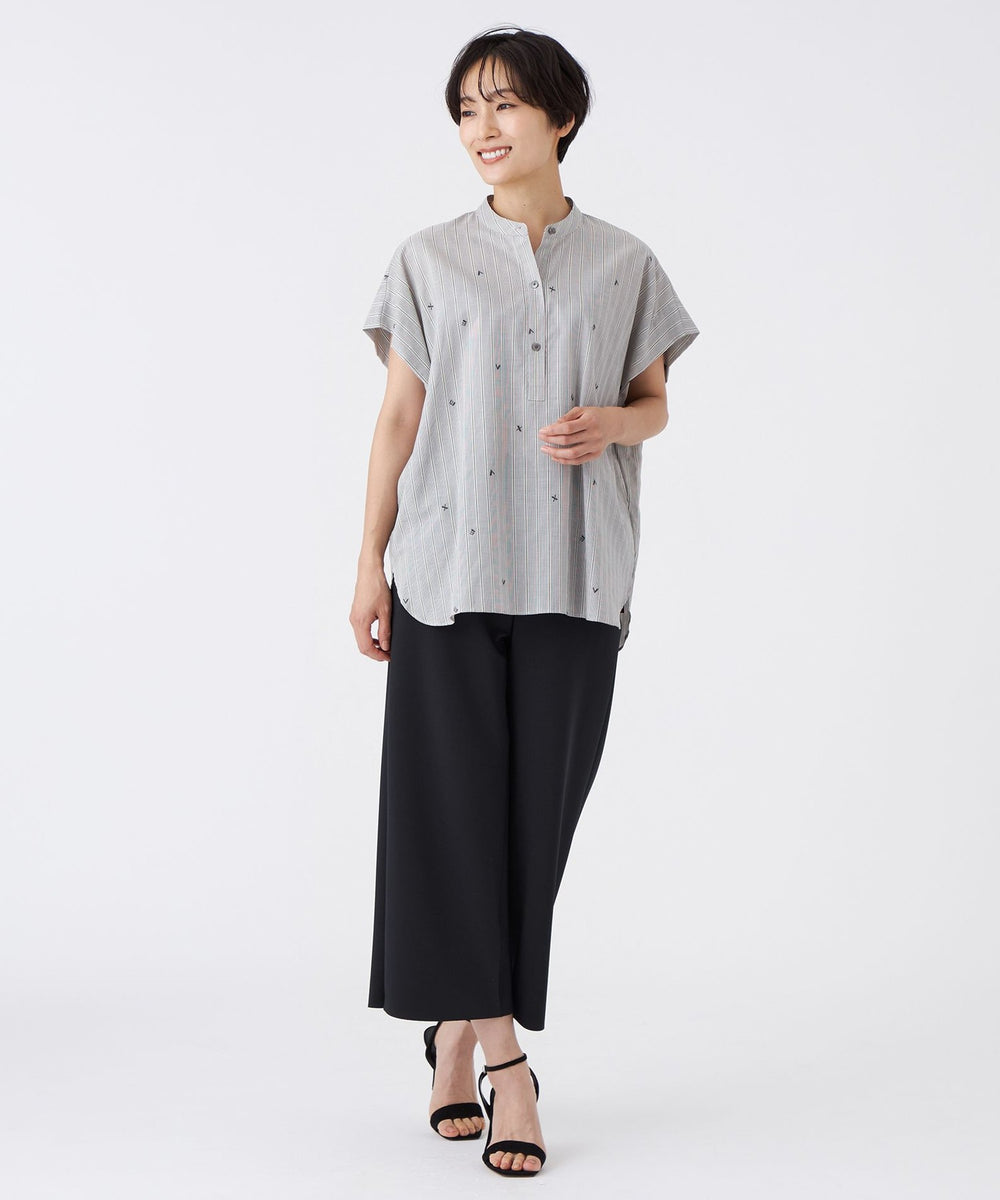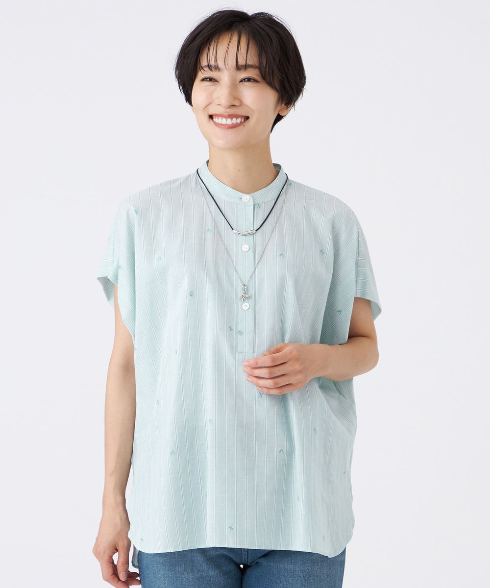 バンドカラーでフレンチスリーブのストライプジャカードブラウスです。かっこよさのあるボックスシルエットで、後ろに少し抜けてボリュームがたまるのが特徴です。袖口奥でタックを取っているのでアームホールが開きすぎず、フレンチスリーブでも安心感のある着心地です。ボトムを選ばず活躍するアイテムです。