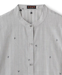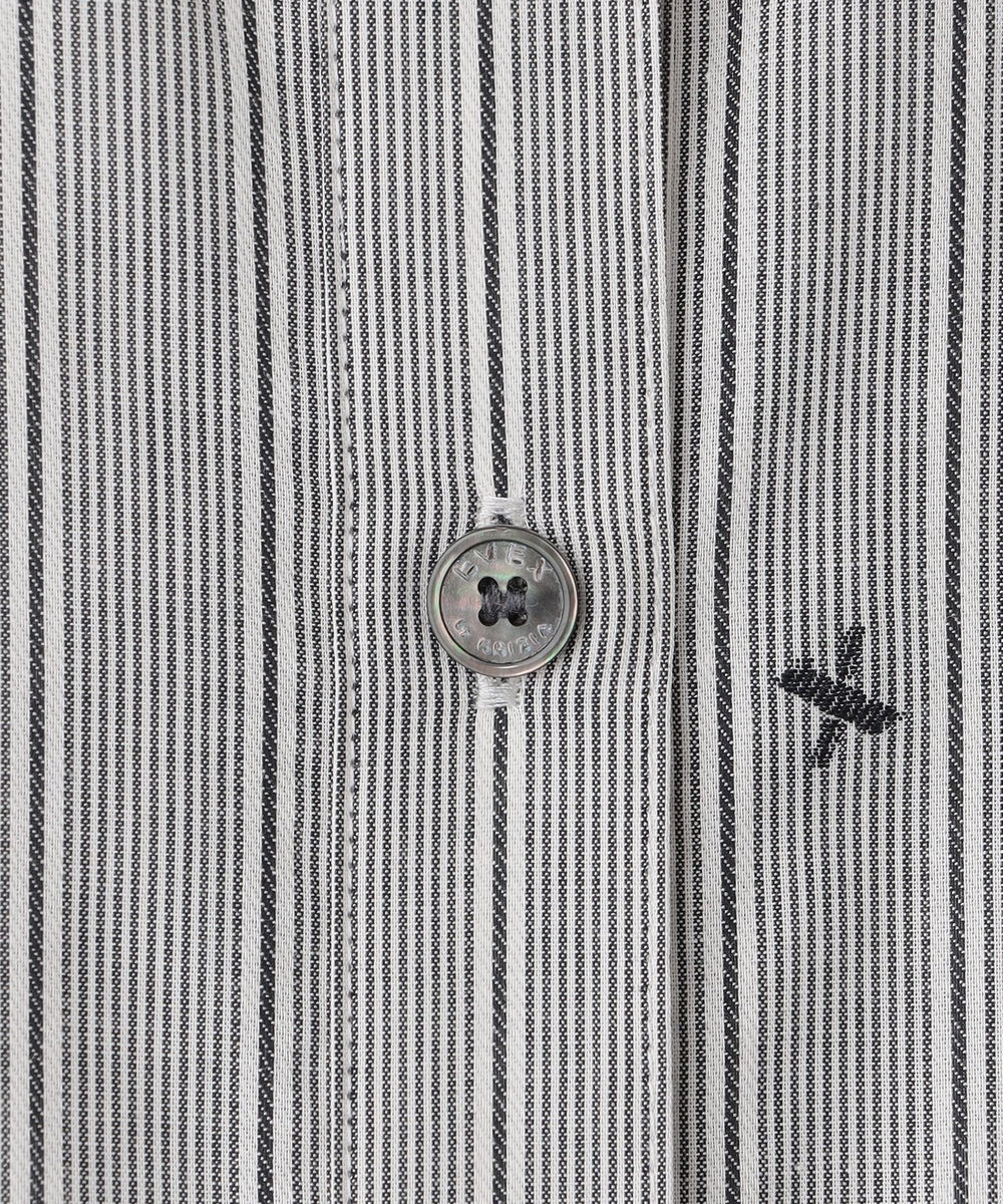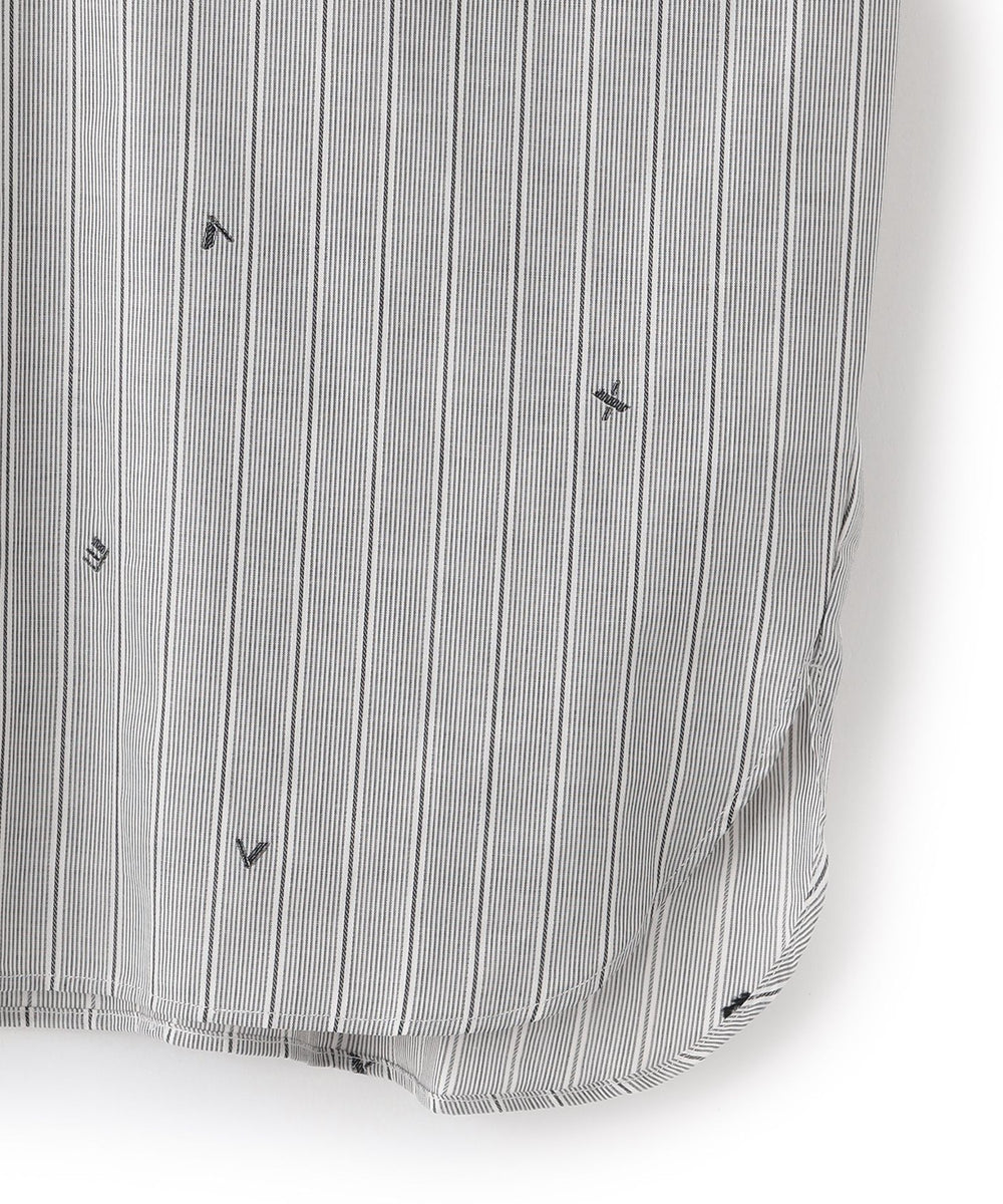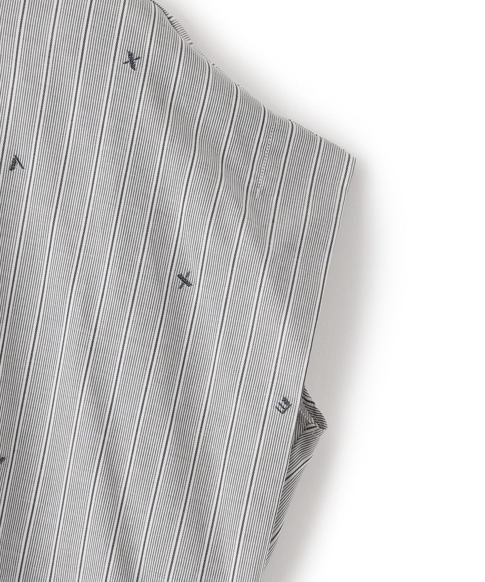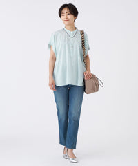 バンドカラーでフレンチスリーブのストライプジャカードブラウスです。かっこよさのあるボックスシルエットで、後ろに少し抜けてボリュームがたまるのが特徴です。袖口奥でタックを取っているのでアームホールが開きすぎず、フレンチスリーブでも安心感のある着心地です。ボトムを選ばず活躍するアイテムです。
