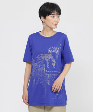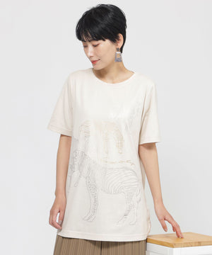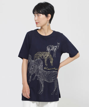 ゼブラ柄をガンメタリック、シルバー、ゴールドのカラーを用いて繊細に表現しています。遠近感のあるゼブラモチーフ、3種類のメタリックカラーで奥行き、立体感のあるプリントが、着こなしにアクセントをプラスします。程よくゆったりとして、体のラインを拾わないストレスフリーなシルエットもおすすめポイントです。