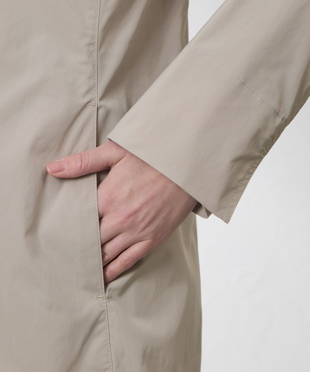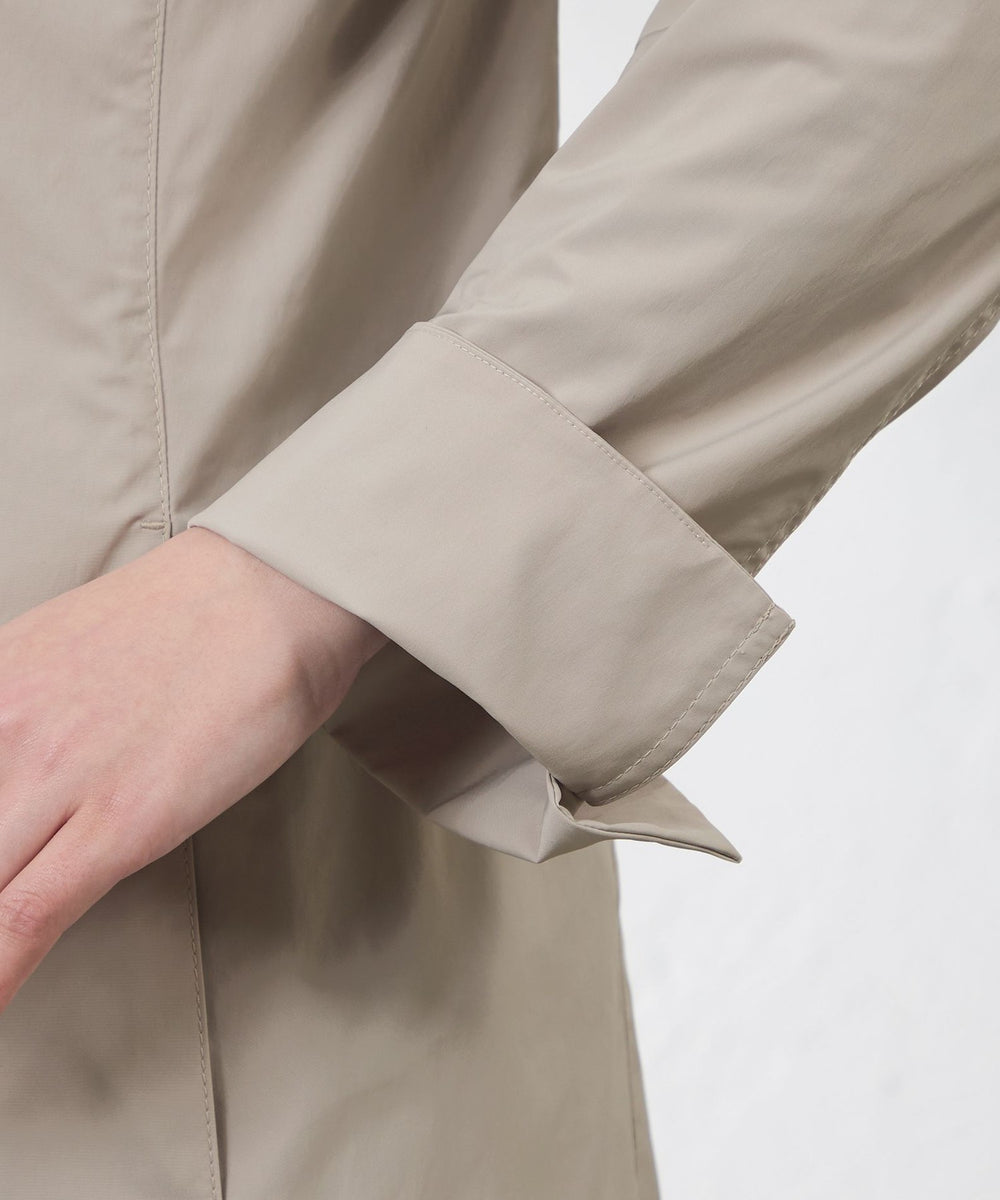 形状記憶の特性により、ステンカラーコートならではのきれいなシルエットをキープ。さらに、マットな光沢感が上品さを演出します。