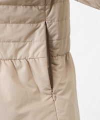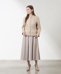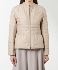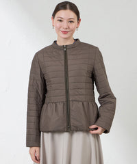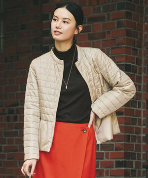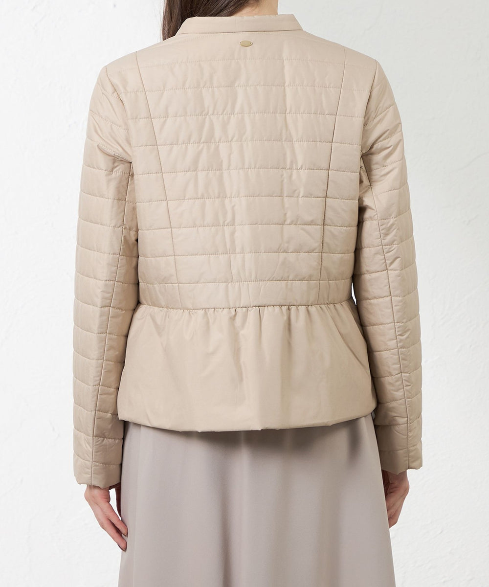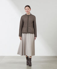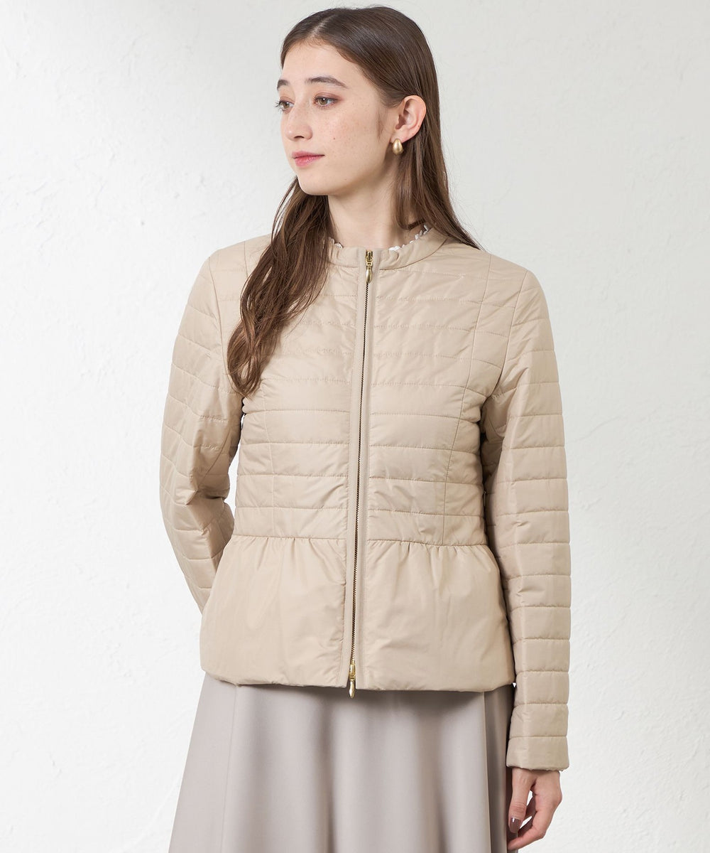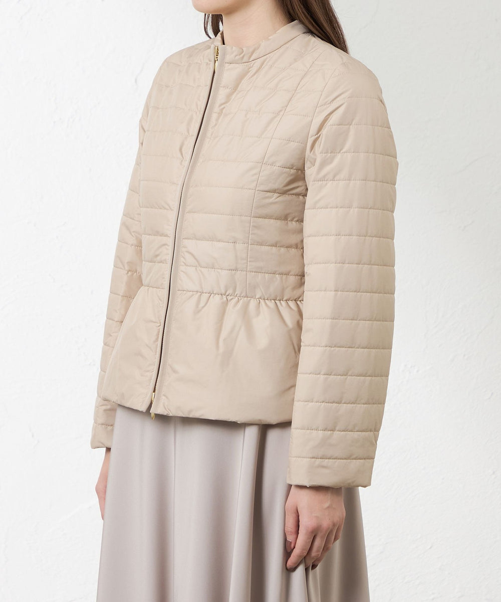 秋口から活躍し春先までお召しいただけるライトな中綿アウター。ボディラインをカバーしつつ膨らみすぎないようにこだわった、ウエストラインとペプラムラインの上品なシルエットがポイントです。逆開ファスナー仕様なので好みの開き加減で着用でき、合わせるボトムのバリエーションも広がります。同じ素材でミドル丈のコートタイプ(V5A06639)の展開もございます。