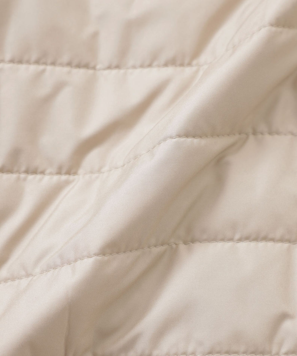 表地には上品な光沢感のある軽量な素材を使用。ソフトでしなやかな肌触りが特徴の織物です。中綿にはリサイクルポリエステルを50%使用。再生PETを使用することによって、生産に関して水の使用量削減、エネルギー使用量の削減、CO2排出量の削減効果があり、環境にやさしい素材となってます。