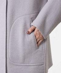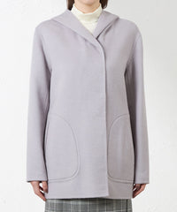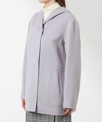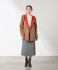 両面配色の紡毛リバーコート。片面に鮮やかな色を配し、フードからのぞくその配色がデザインポイントになっています。リバーシブル仕立てで、どちらの配色で着用しても着映えする主役級のコートです。