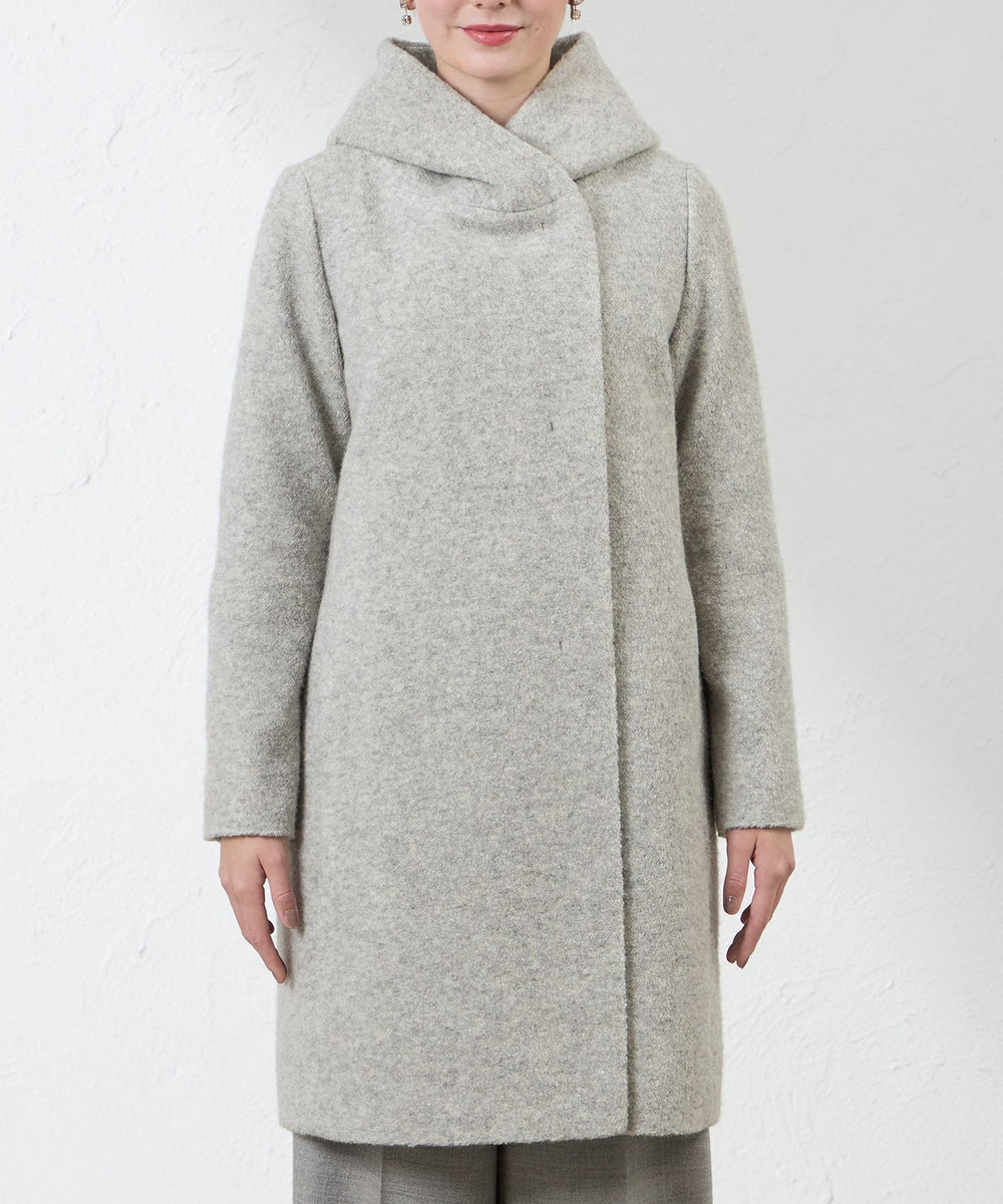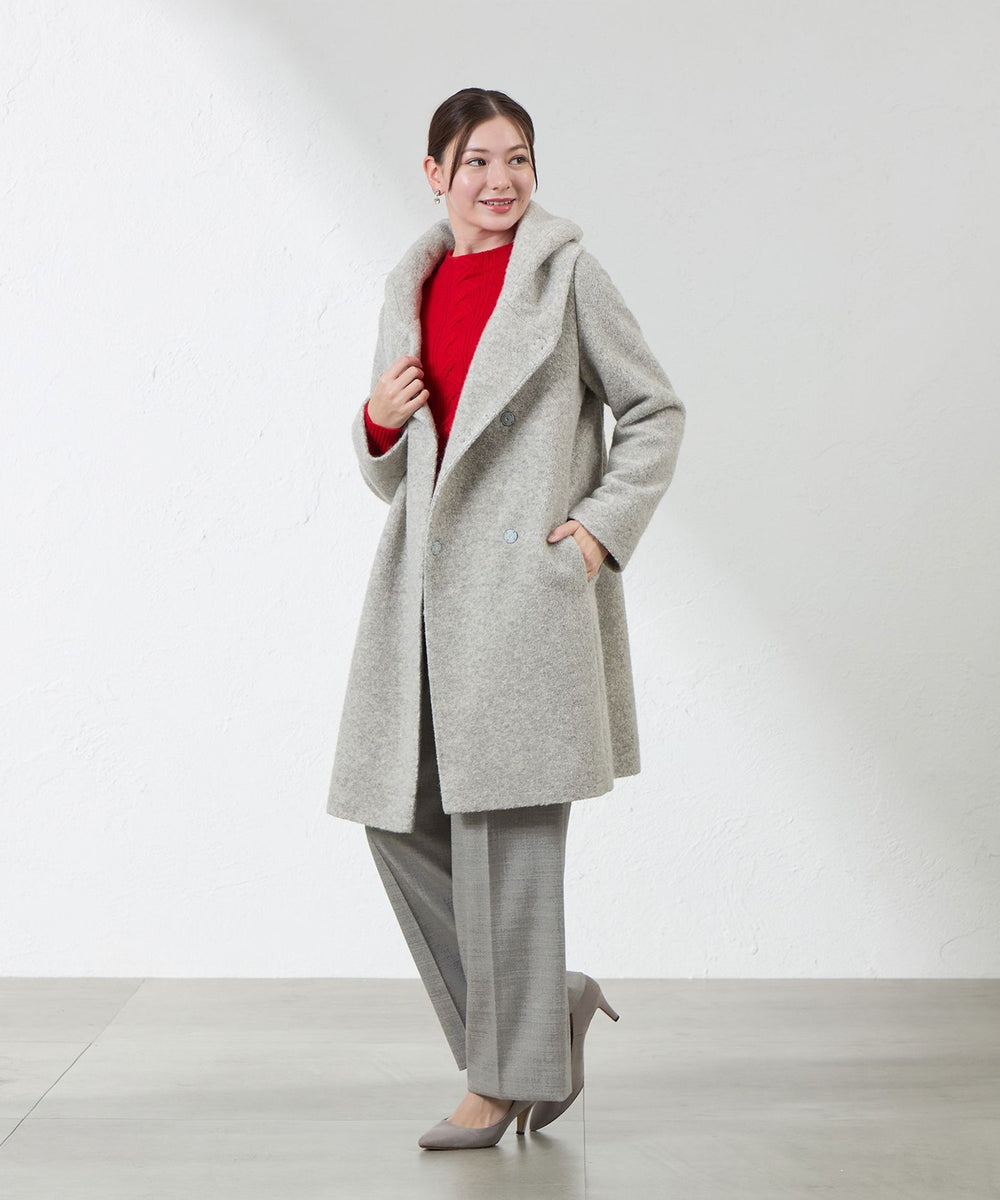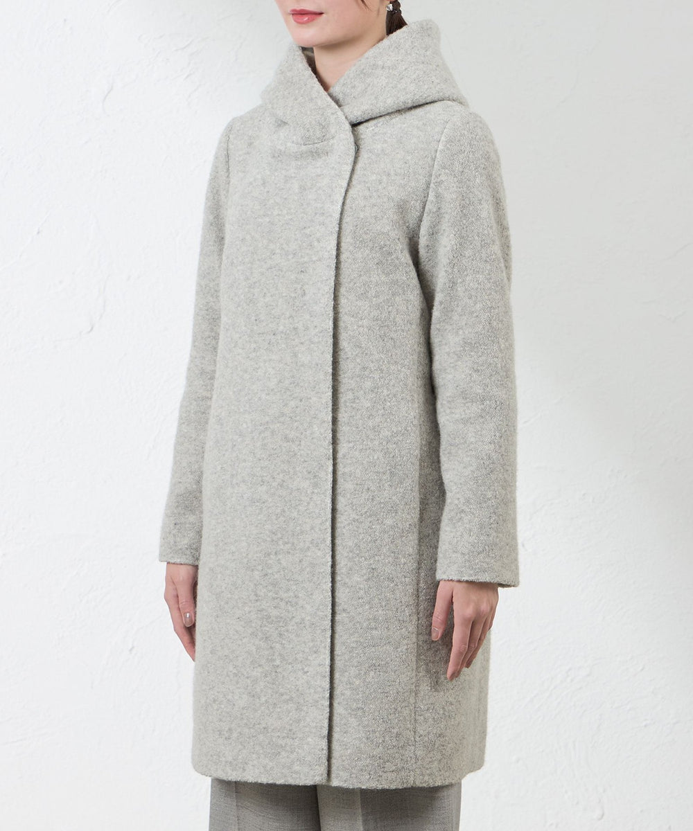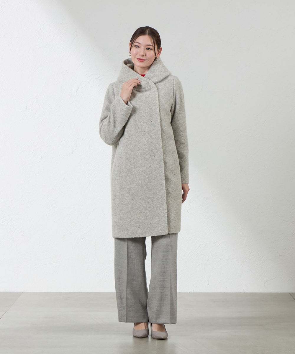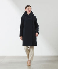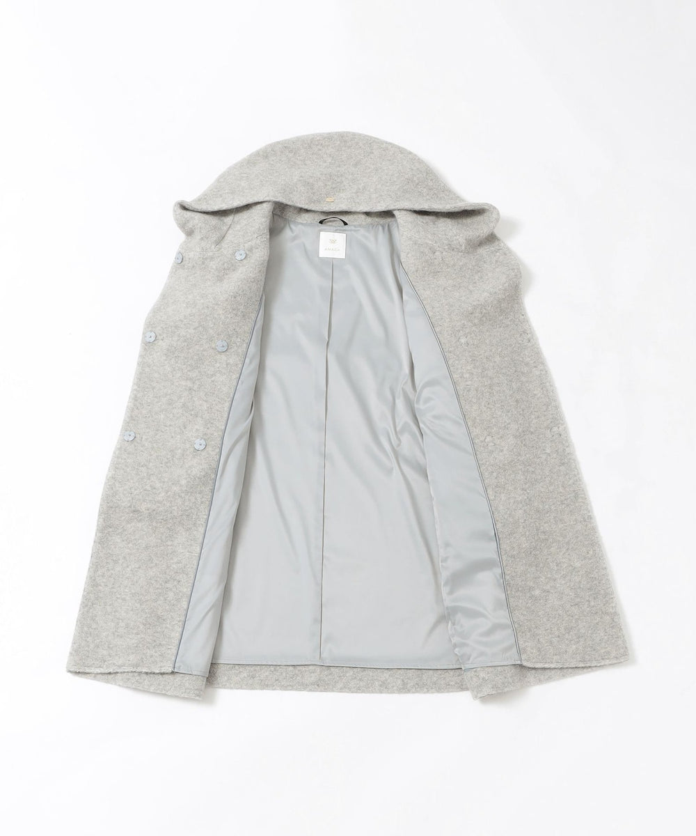 首元まで暖かいフードがついたダブルブレストのゆったりとしたラインは体を柔らかく包み込んでくれる贅沢な着心地が特徴。