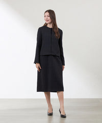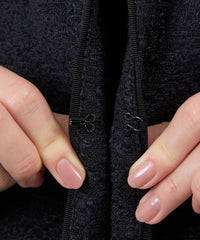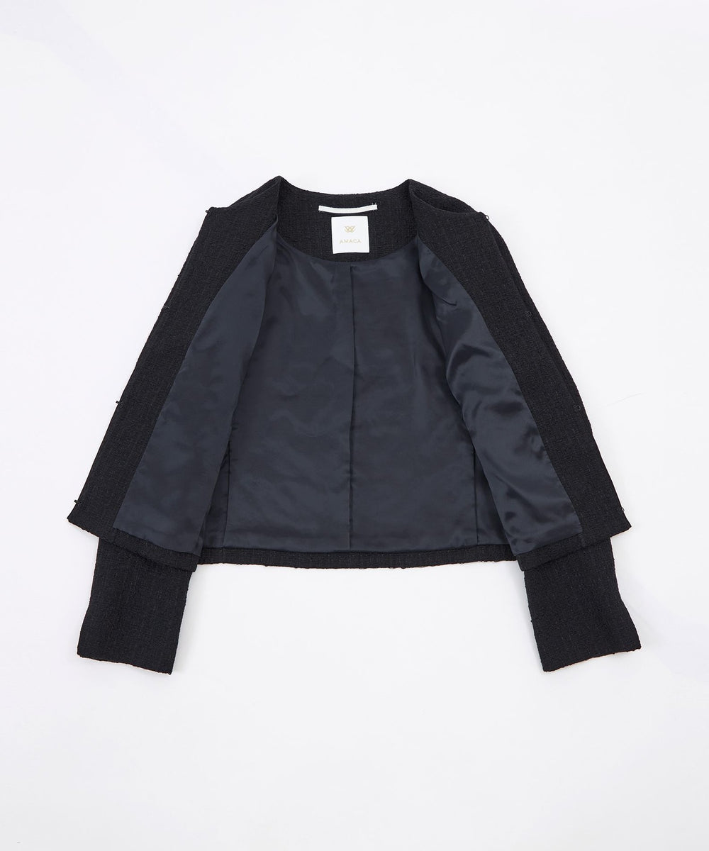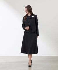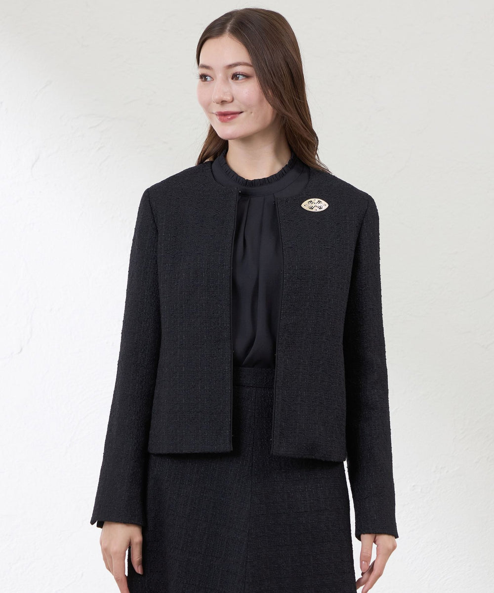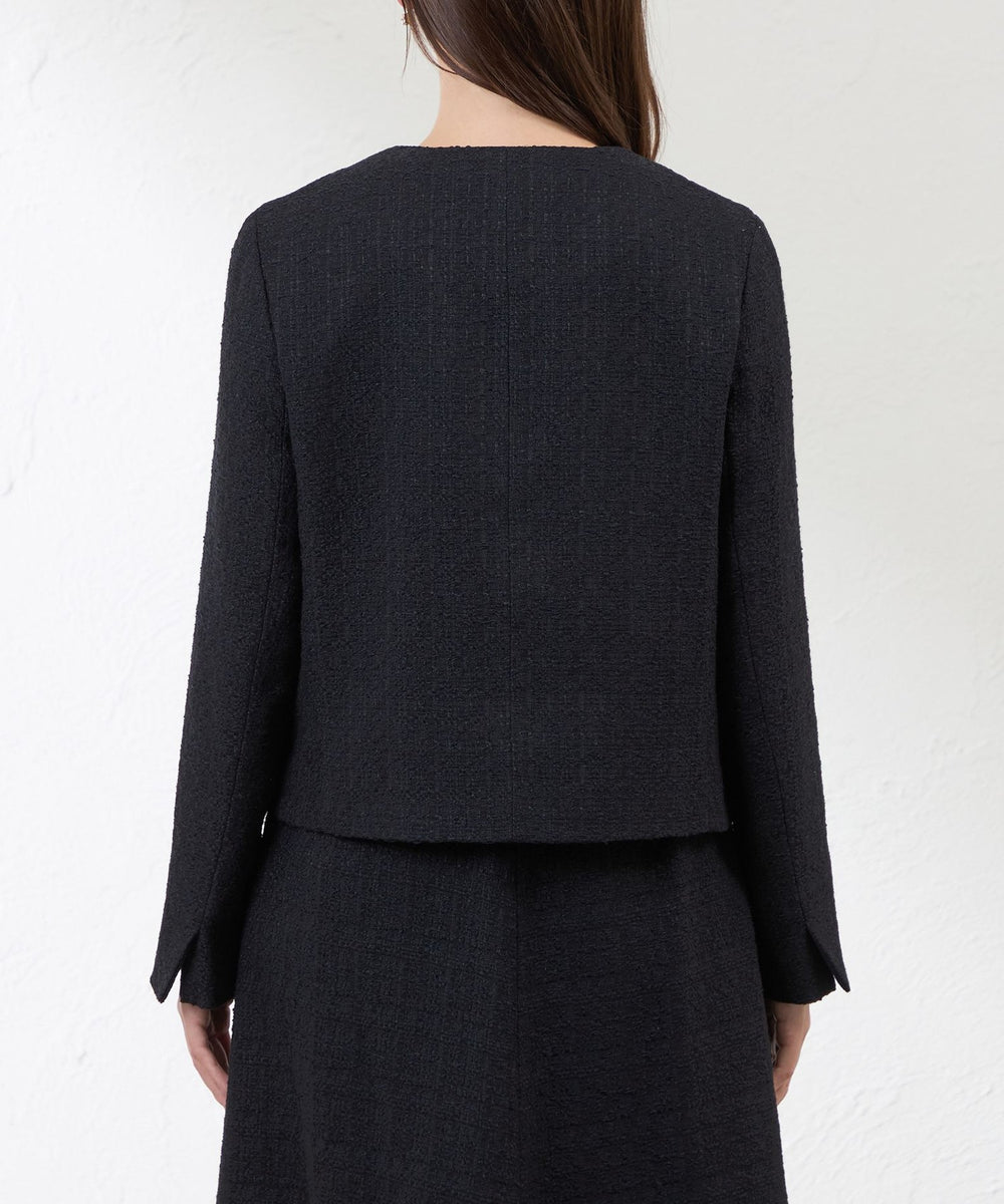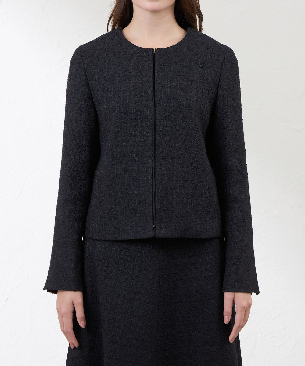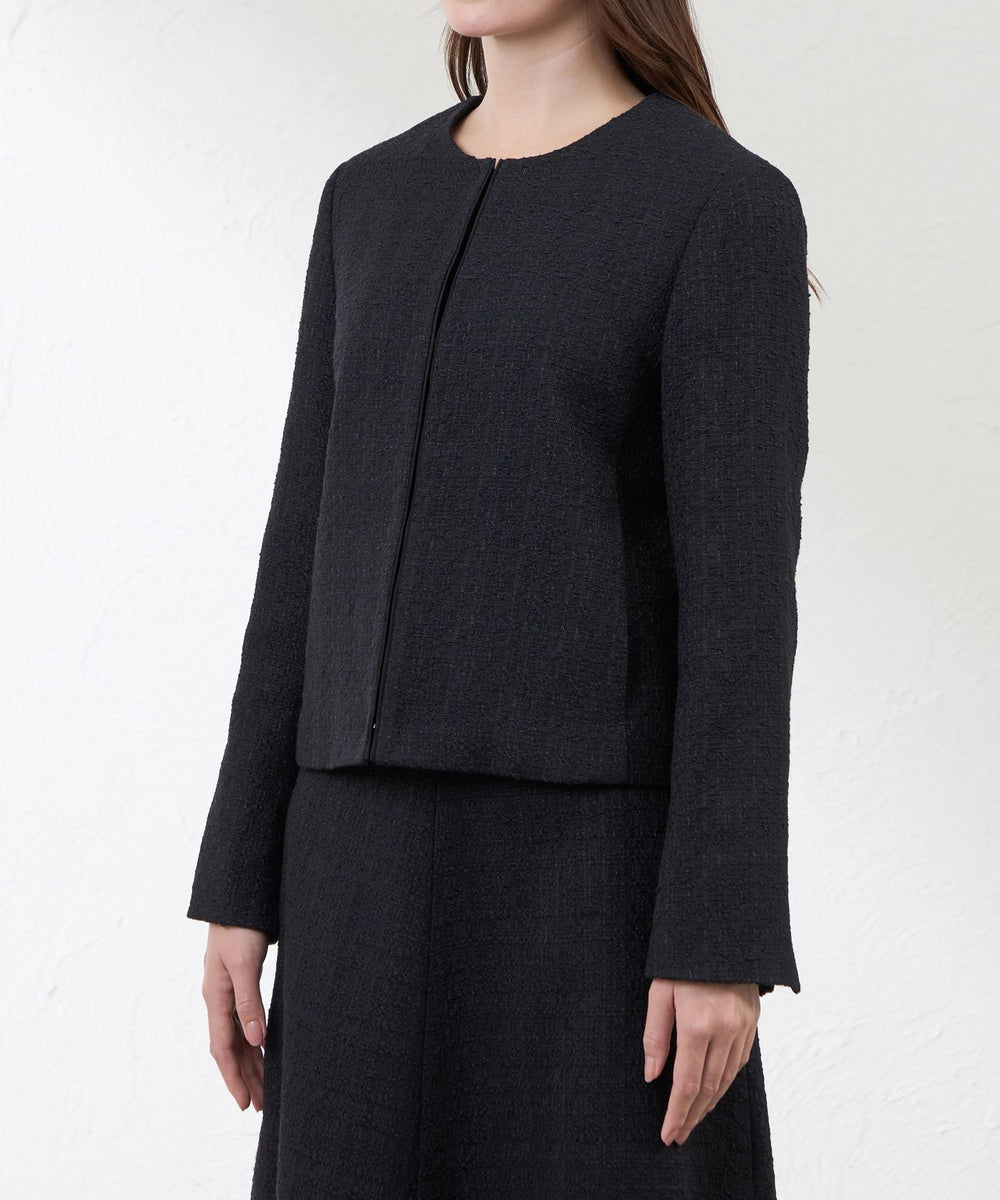 フロントにグログランリボンを施したシンプルなジャケットです。ホック留めのクルーネックジャケットなのでオケージョンにもデイリーユースにもお勧めです。