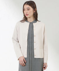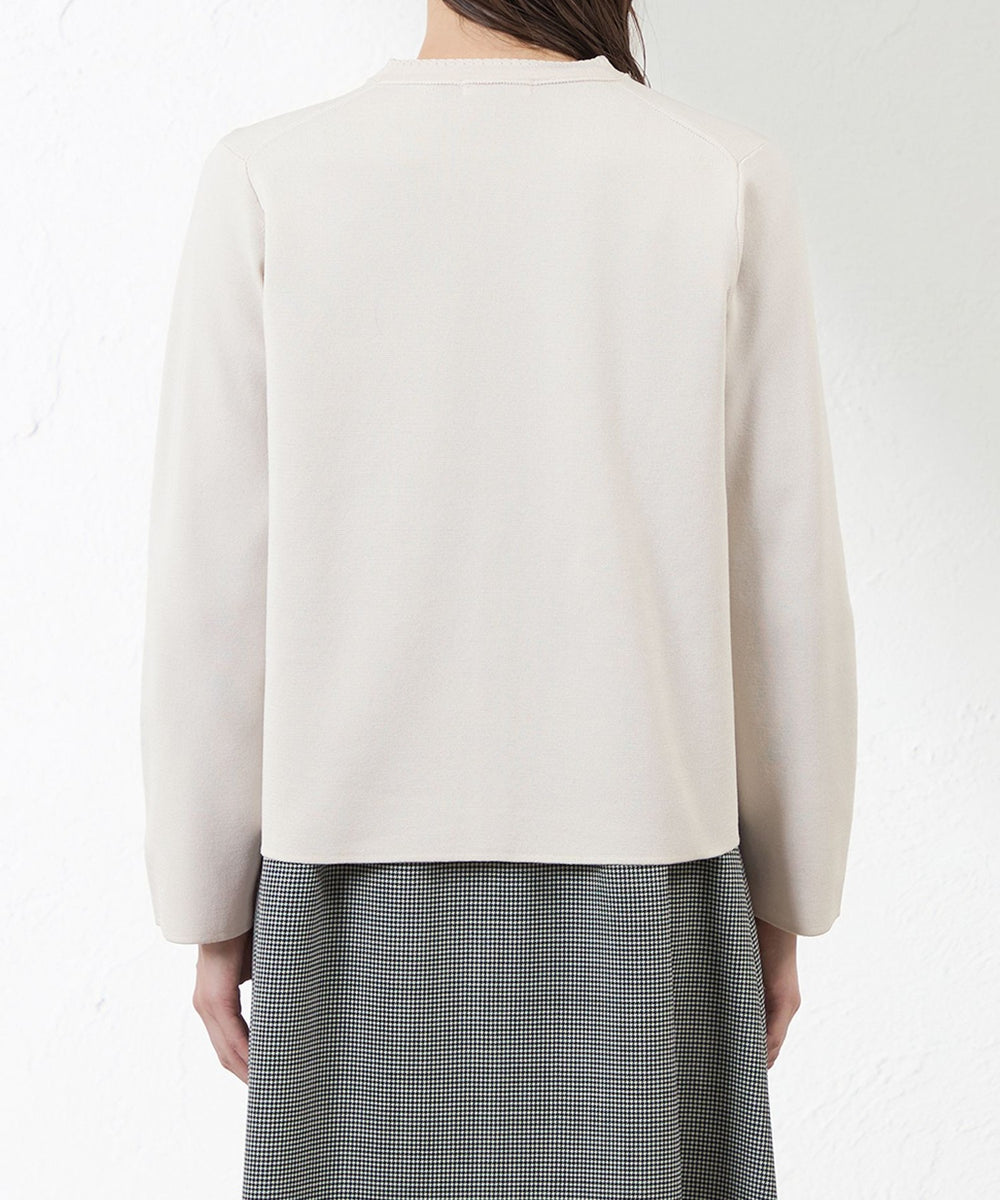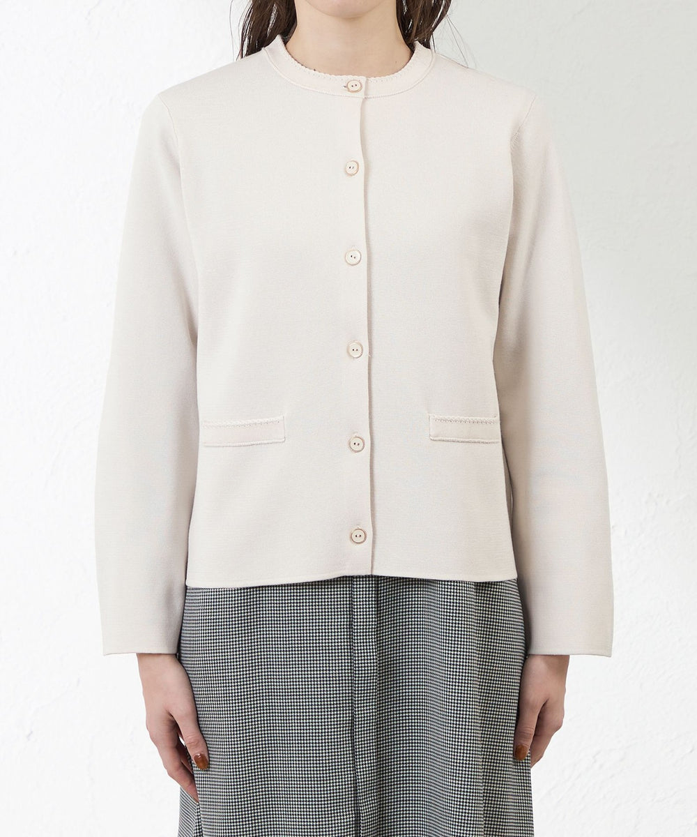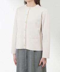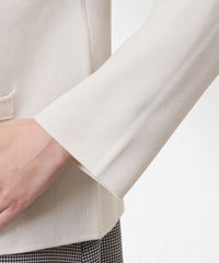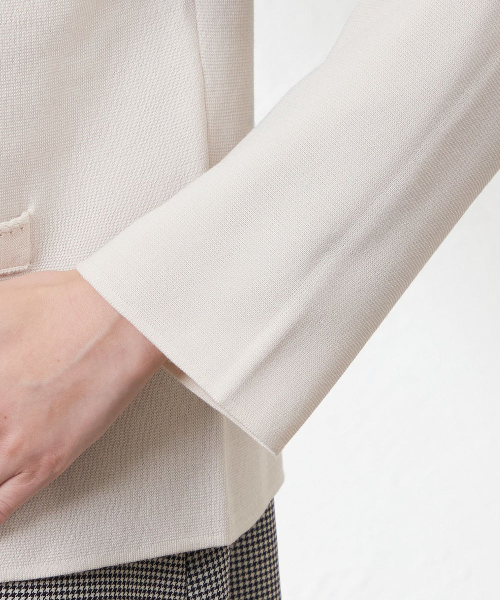 バストダーツを入れ、立体感のあるパターンで編み立てた、光電子を交編したミラノリブのニットジャケットです。