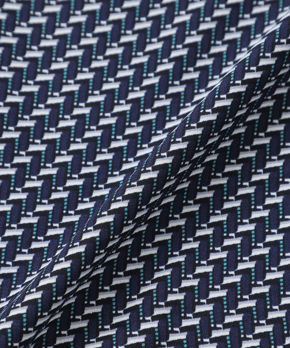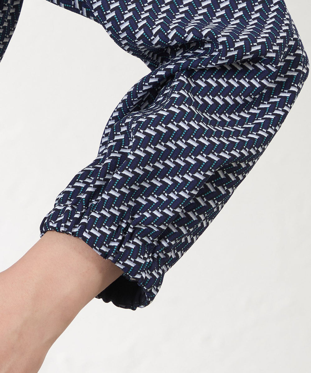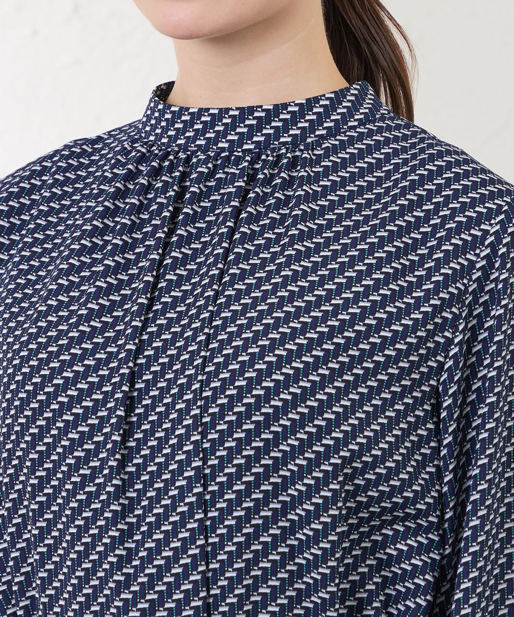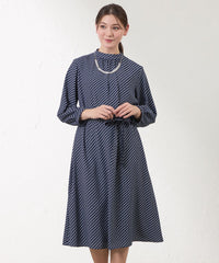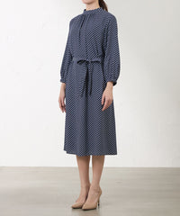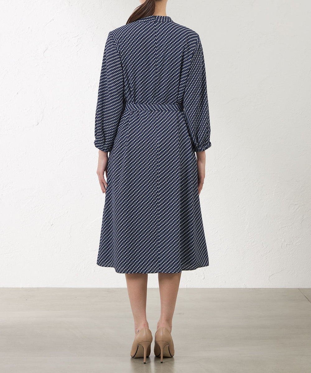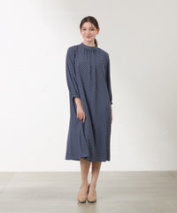 スタンドカラーが上品な印象のプリントドレス。
