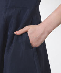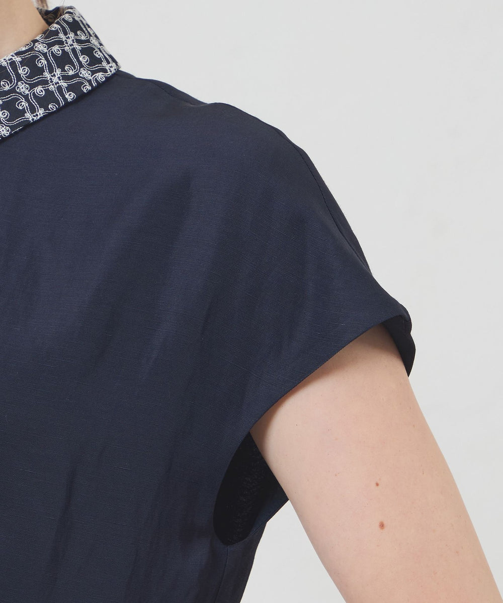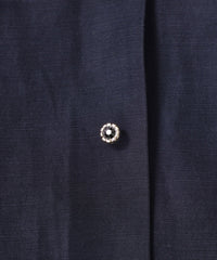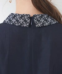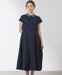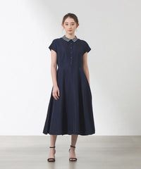 アマカ20周年を記念して作られたオリジナルプリント、リバティのRibbon medallionをモチーフに刺繍生地を襟に使用したワンピースです。ウエストで切り替えがあるので、ウエスト位置が高めに見えるのもうれしいポイント。ボディの素材はトリアセ混の落ち着いた光沢感のある素材を使用しており、フロントにはビジュー釦をつけ、アマカにしかないノーブルな夏のワンピースに仕上がりました。