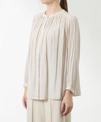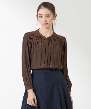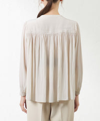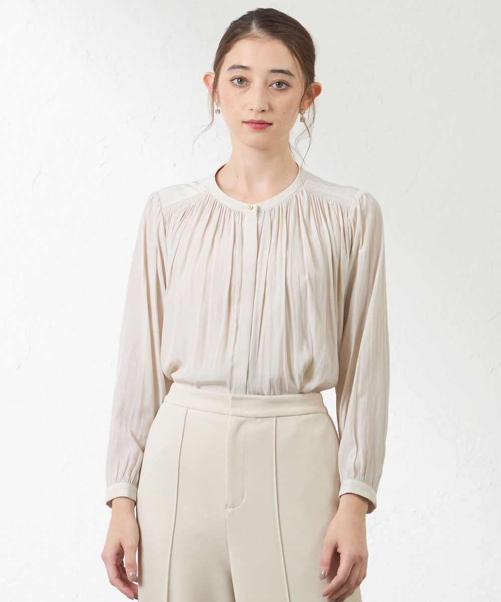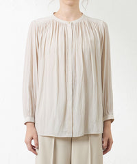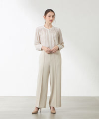 ブラウスのボタンをパールボタンにし、袖丈が7分袖でノーブルな印象を与えてくれるブラウスです。