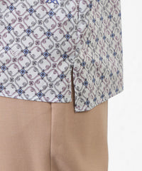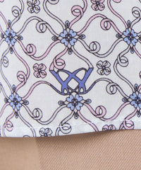 過去、AMACAで多くのお客様に人気だったという柄を参考に、LIBERTYの多くのアーカイブを掘り起こし、様々な異なるインスピレーションをコンバインして作った柄。贈り物を彷彿とさせるリボンを主軸に、フローラルとジオメトリーライクな柄ゆきをMIXさせ、アマカの優しいロゴのフローにフィットするように描きました。曲線美が美しい柄に仕上がっております。