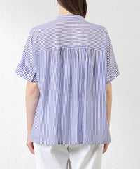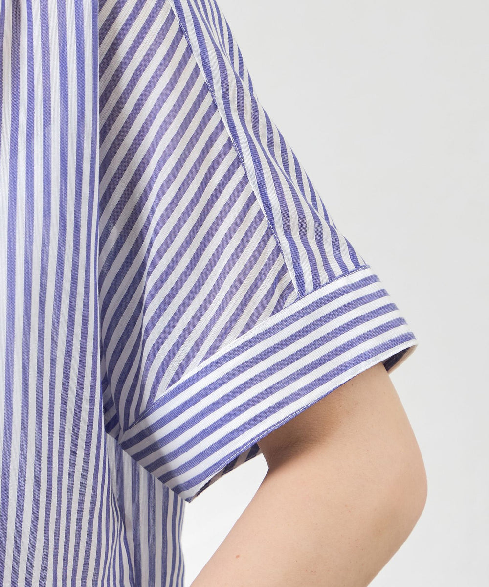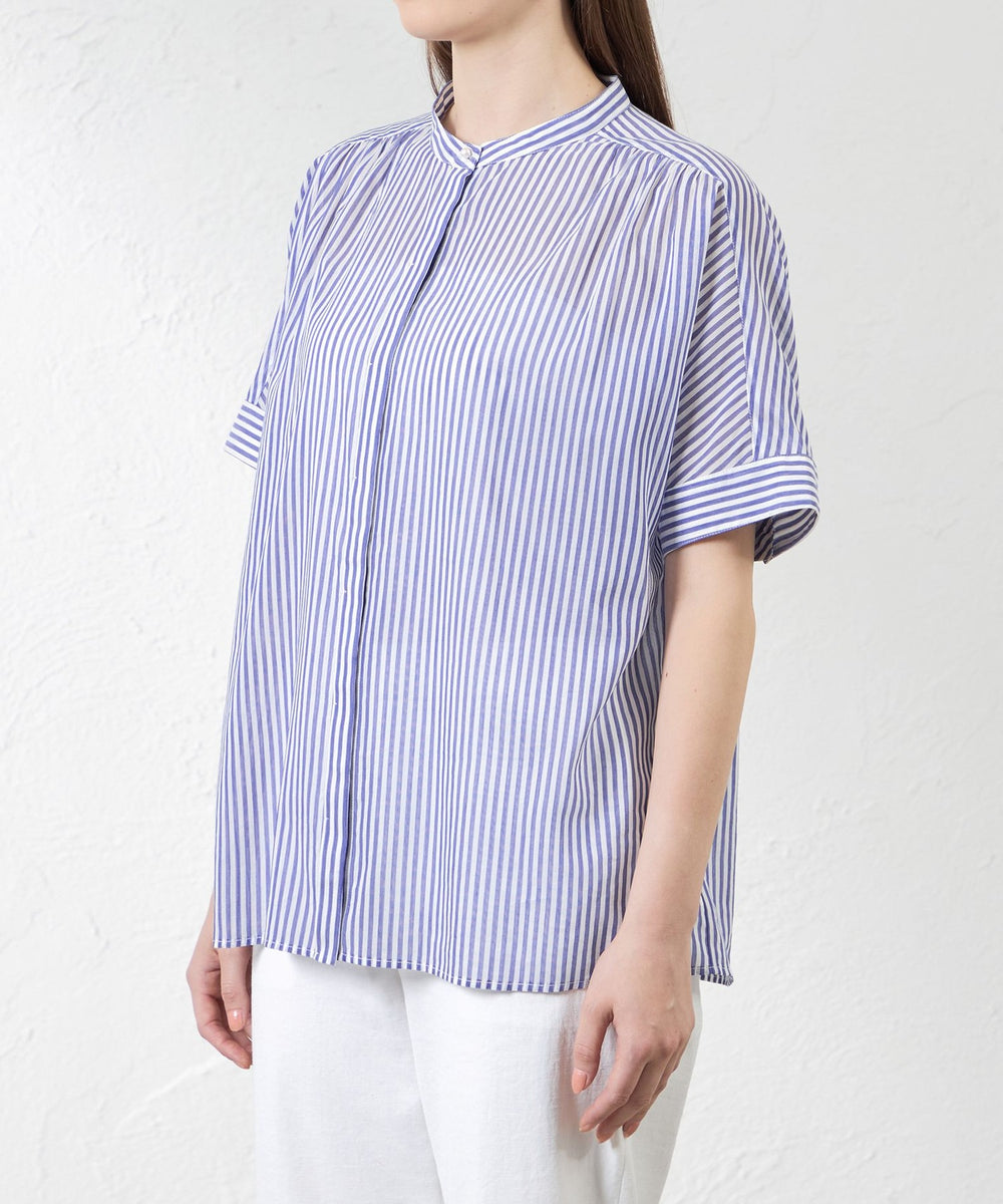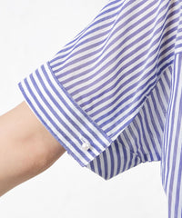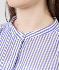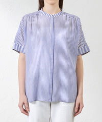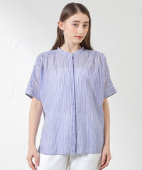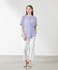 シアーな夏向けのブラウスです。シンプルなスタンドカラーですが、パールボタンを使用することで、女性らしい上品さをプラスした爽やかな印象に。透け感のある素材なので、展開中のニットのタンクトップ(V5N13532)とのコーディネートがお勧めです!