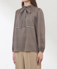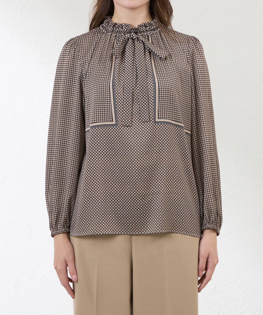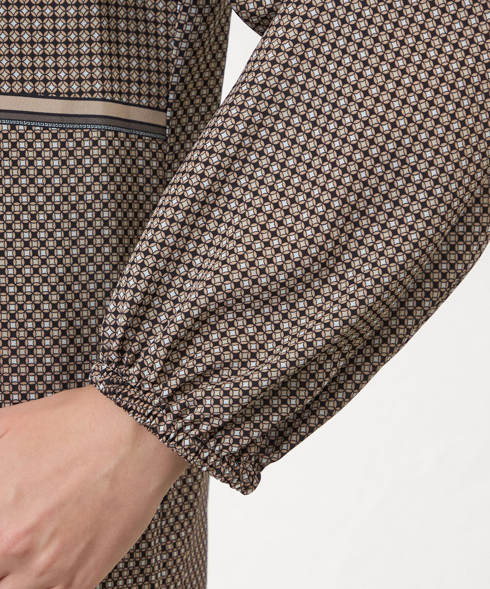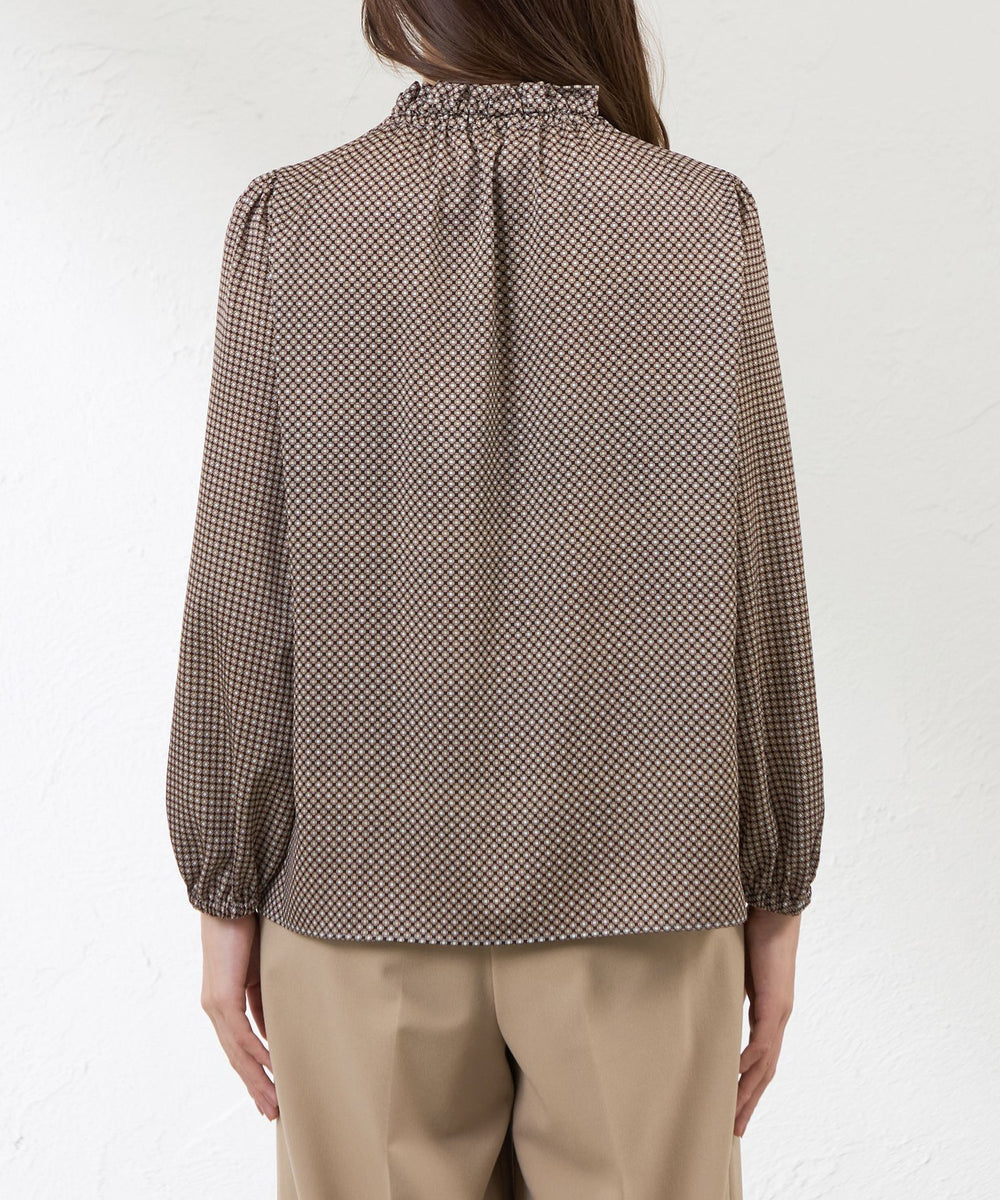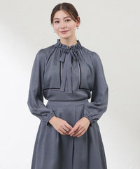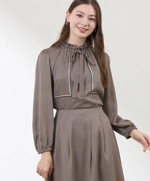 華やかさを感じる襟元が目を引くギャザーフリルブラウス。襟ぐりは着脱しやすいゴム仕様、細めのリボンと襟ぐりに入れたギャザーがエレガント。身頃の配色ラインが他にないプリントのブラウスです。