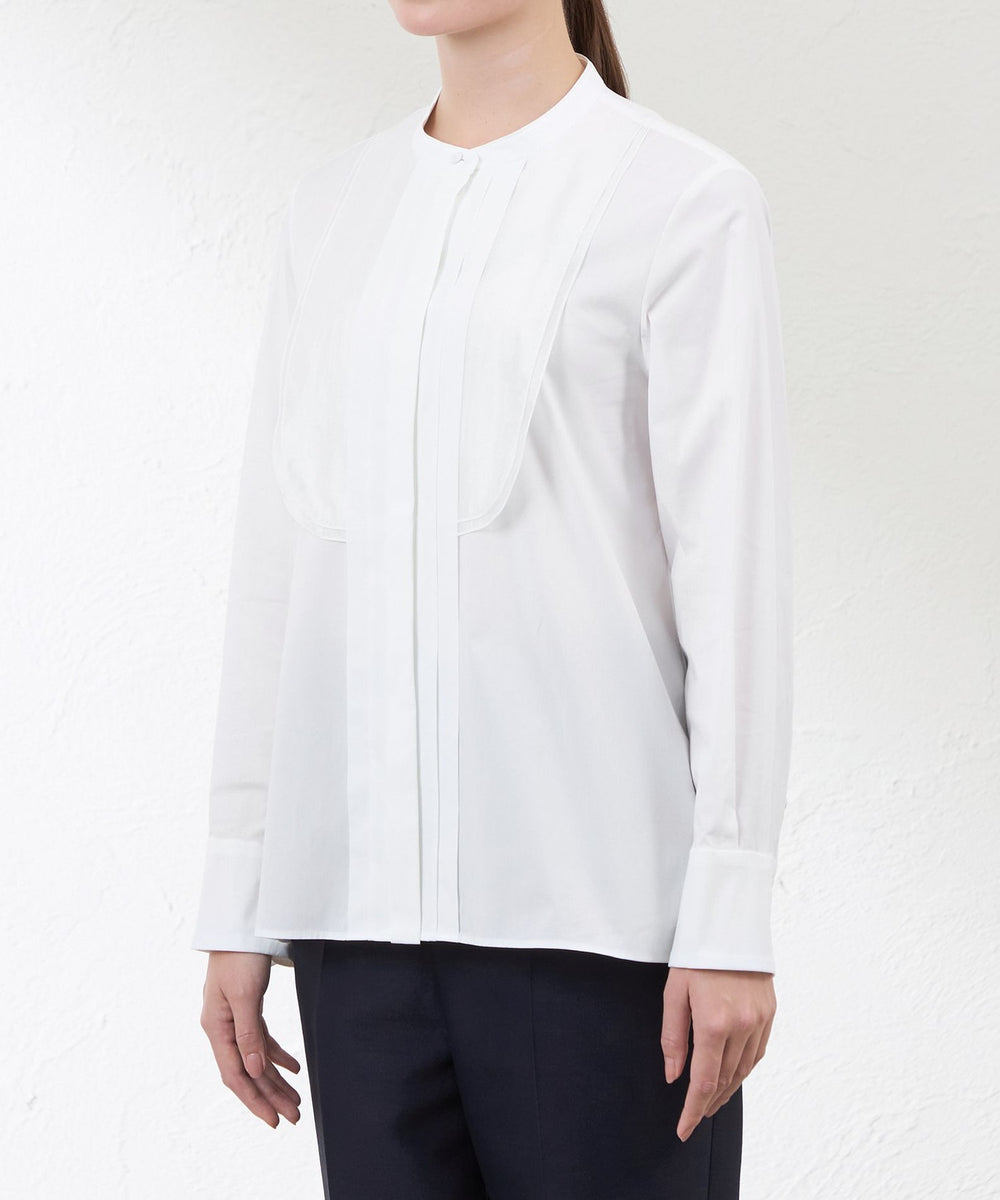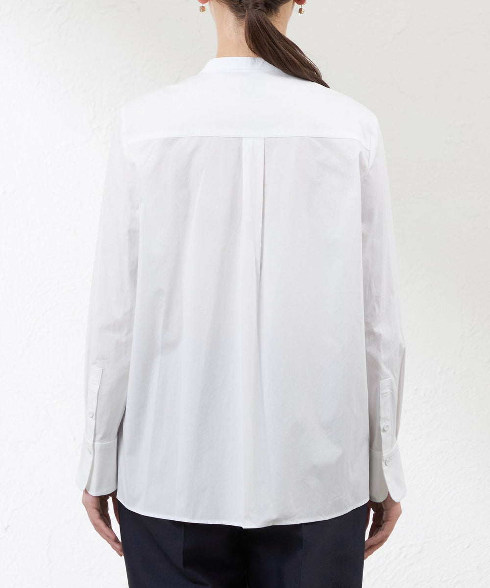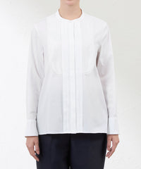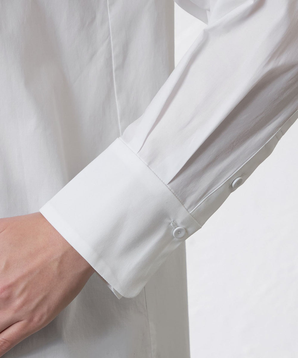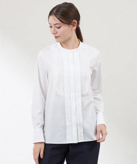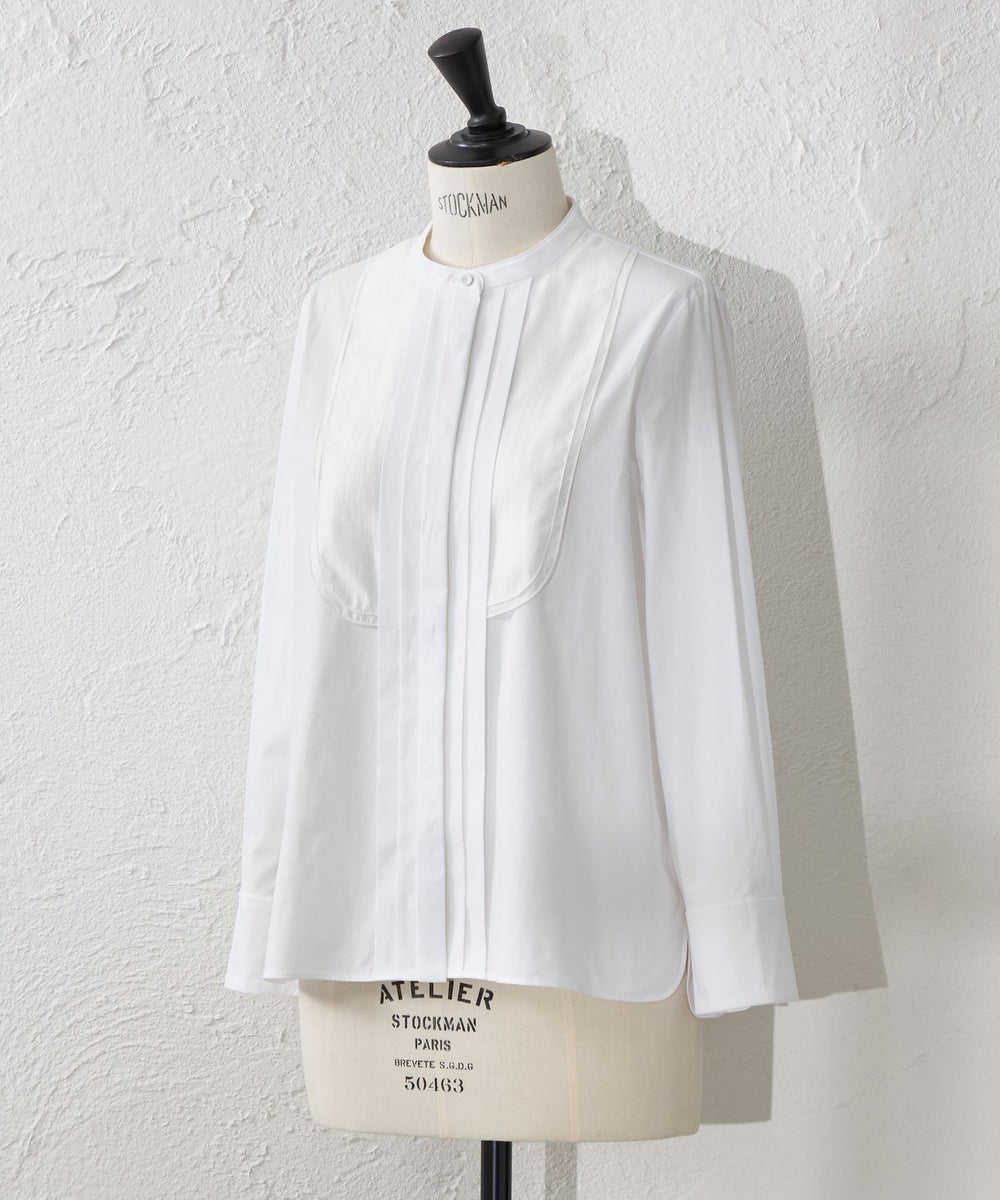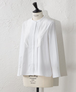 ビブヨークに透け感のあるオーガンジーを重ねたドレスシャツです。 バンドカラーの知的な印象やフロントタックディテール、裾のカッティングなどに凝り、クラシカルな雰囲気が漂います。ハンドワークで留め付ける共布のくるみ釦もアクセントです。