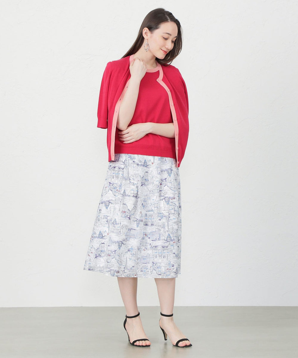細番手の綿とレーヨンを撚糸し、さらに追撚することにより目面がきれいでハリコシのあるさらっとした風合いが特長の素材です。UV対策機能付きで手洗い可能な素材のため、暑いシーズンにもピッタリなアンサンブルです。