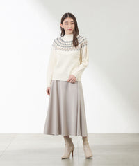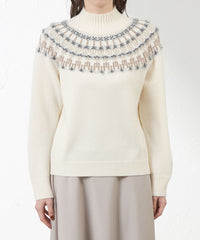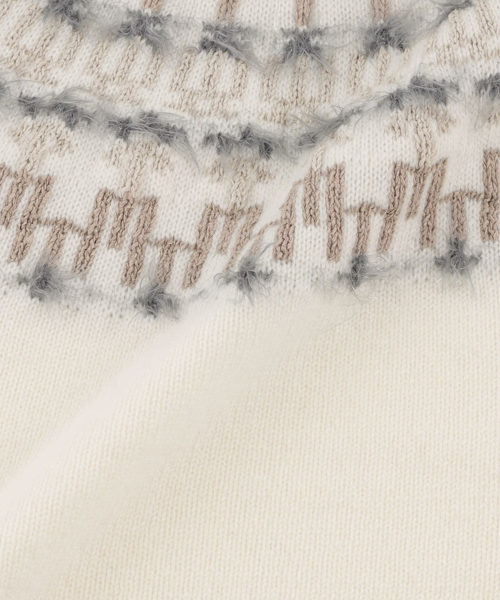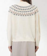 身頃はジャカード柄を2種類の表面感のある異素材で求心状に編み込み、伝統的なフェアアイルニットをモダンな印象に仕上げました。