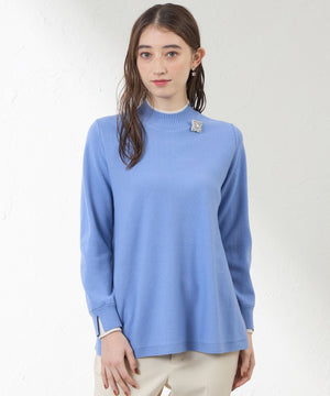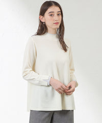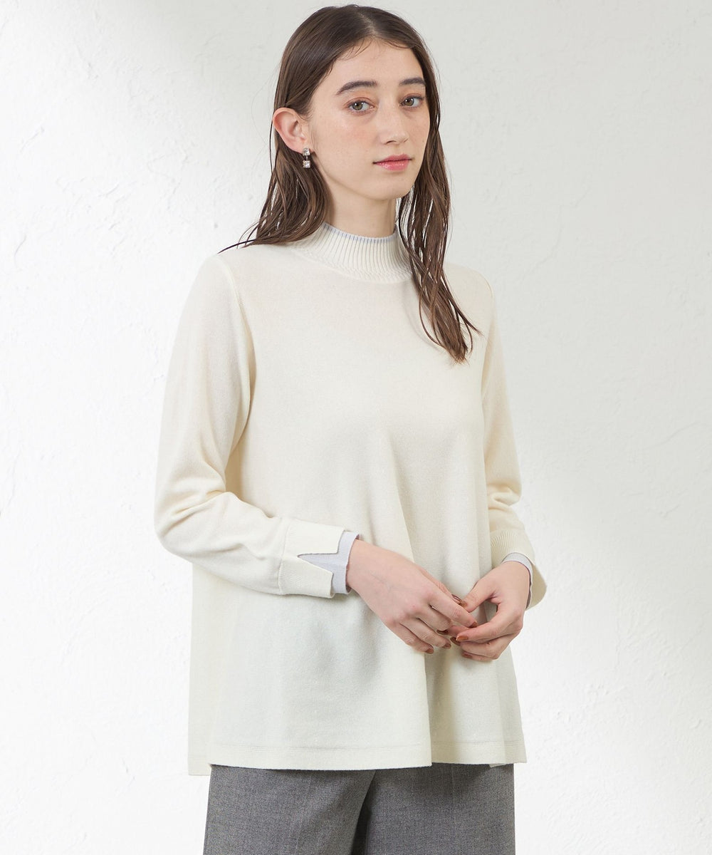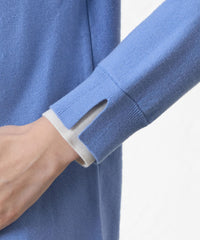 袖口リブは配色のハイゲージのリブと重なったデザインで、襟もさりげなく配色使いになっています。