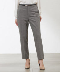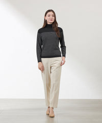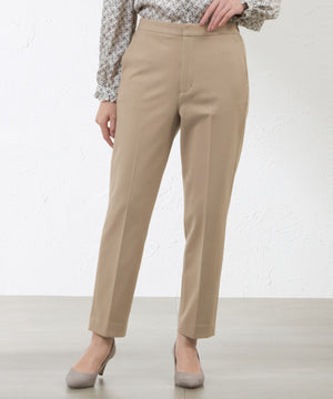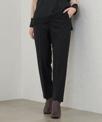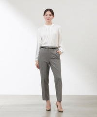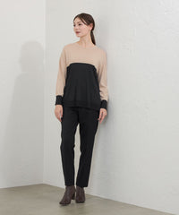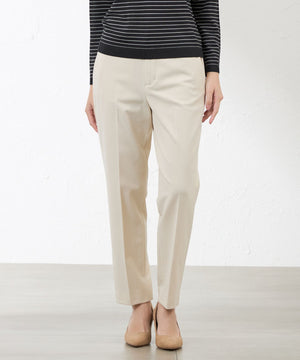 脇シームを前側にし、前巾を狭くすることによってすっきり見えするデザインです。ウエストは脇から後ろにかけてゴムギャザーを入れた伸縮性のある仕様で楽ちんです。