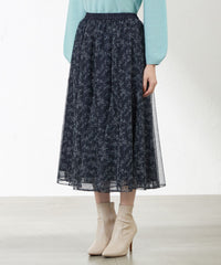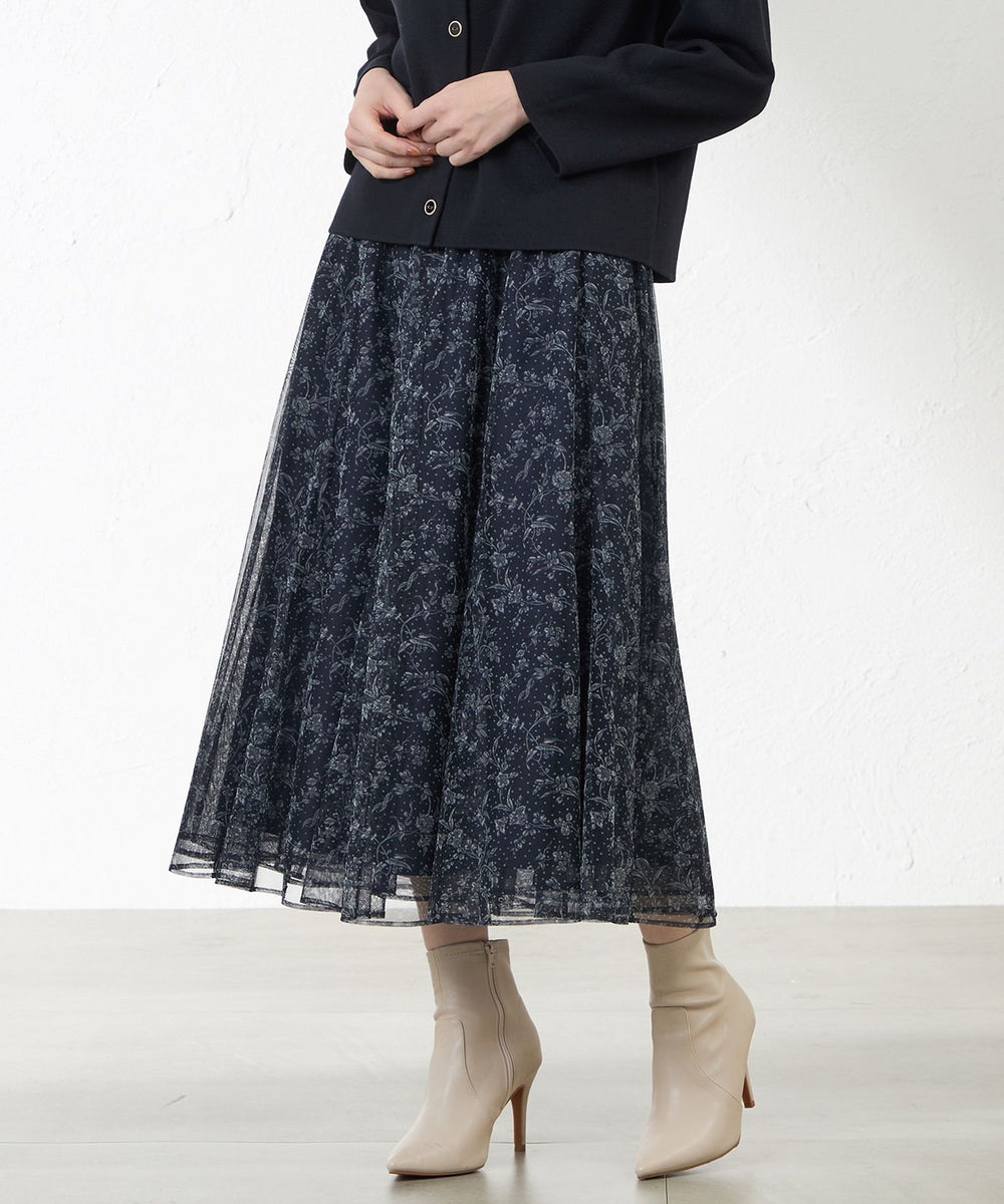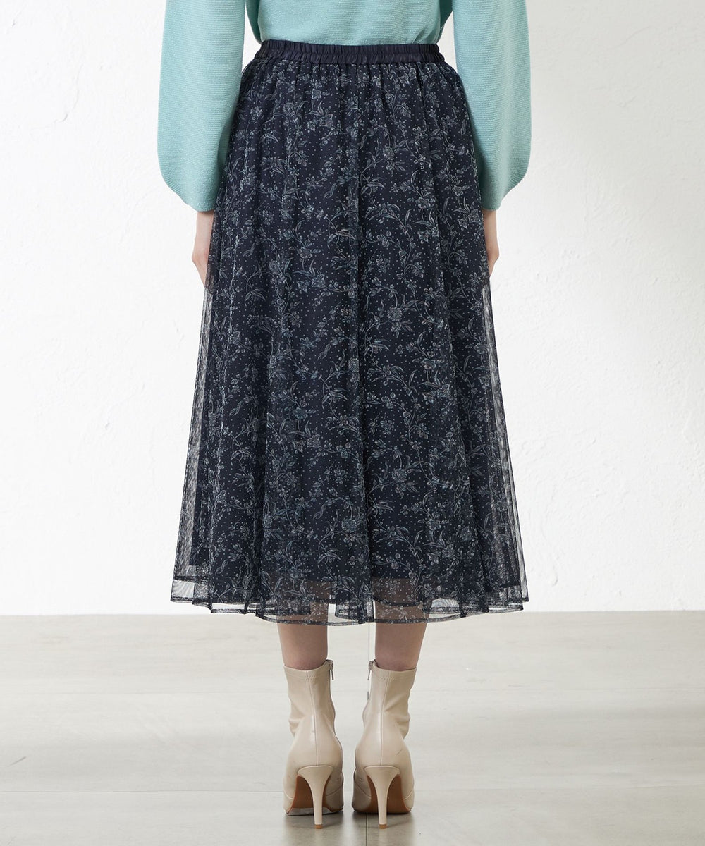 リバティプリントを繊細なポリエステルチュールにのせた華やかなフレアスカート。