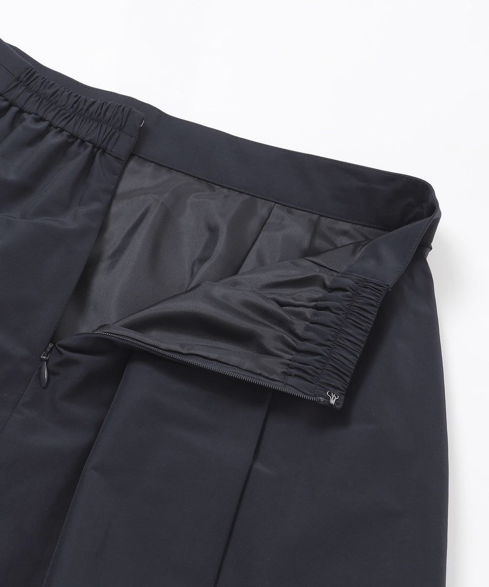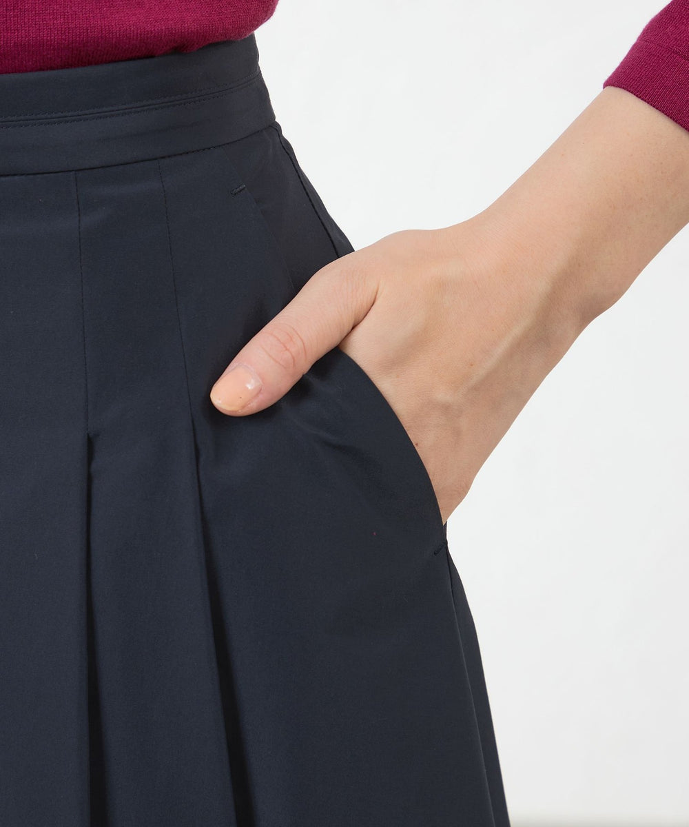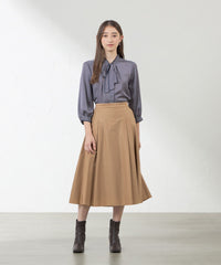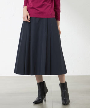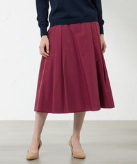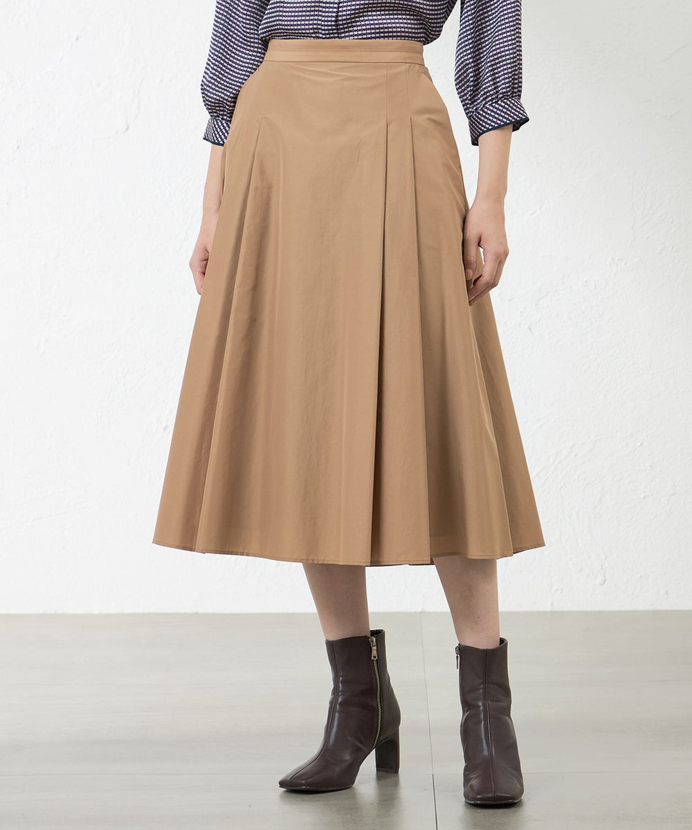 タックデザインのフレアスカートです。光沢感が美しく、ハリ感のある素材でふんわりと広がるシルエットのフレアスカート。程よい分量で、様々なトップスに合わせやすく着回し力抜群のスカートです。後ろベルトがゴムギャザー仕様なのでウエストにフィットし、伸縮性も兼ね備えたデザインで上品さと動きやすさを兼ね備えた万能アイテムです。