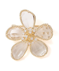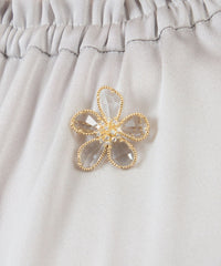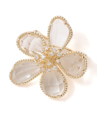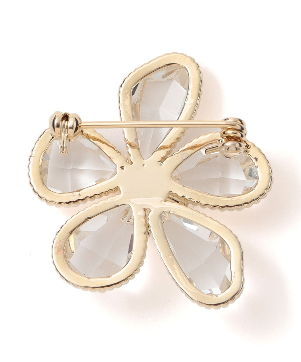 繊維で華奢なフレームの中に反射が美しいカットガラスをセットしたフラワーブローチです。どの花びらも形をかえて動きのあるシェイプになっています。クリスタルガラスが涼し気なブローチ。