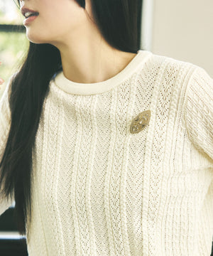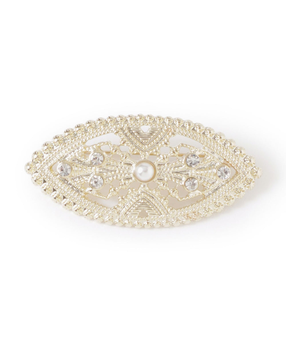 ヴェネツィア刺?からインスピレーションを得てデザインしたブローチ。緩やかなアールを描いて透かしを入れた繊細なベースに、パール調のパーツやビジューで華やかに仕上げました。シンプルなトップスにはもちろん、秋冬の毛足のあるニットにも映えるブローチです。