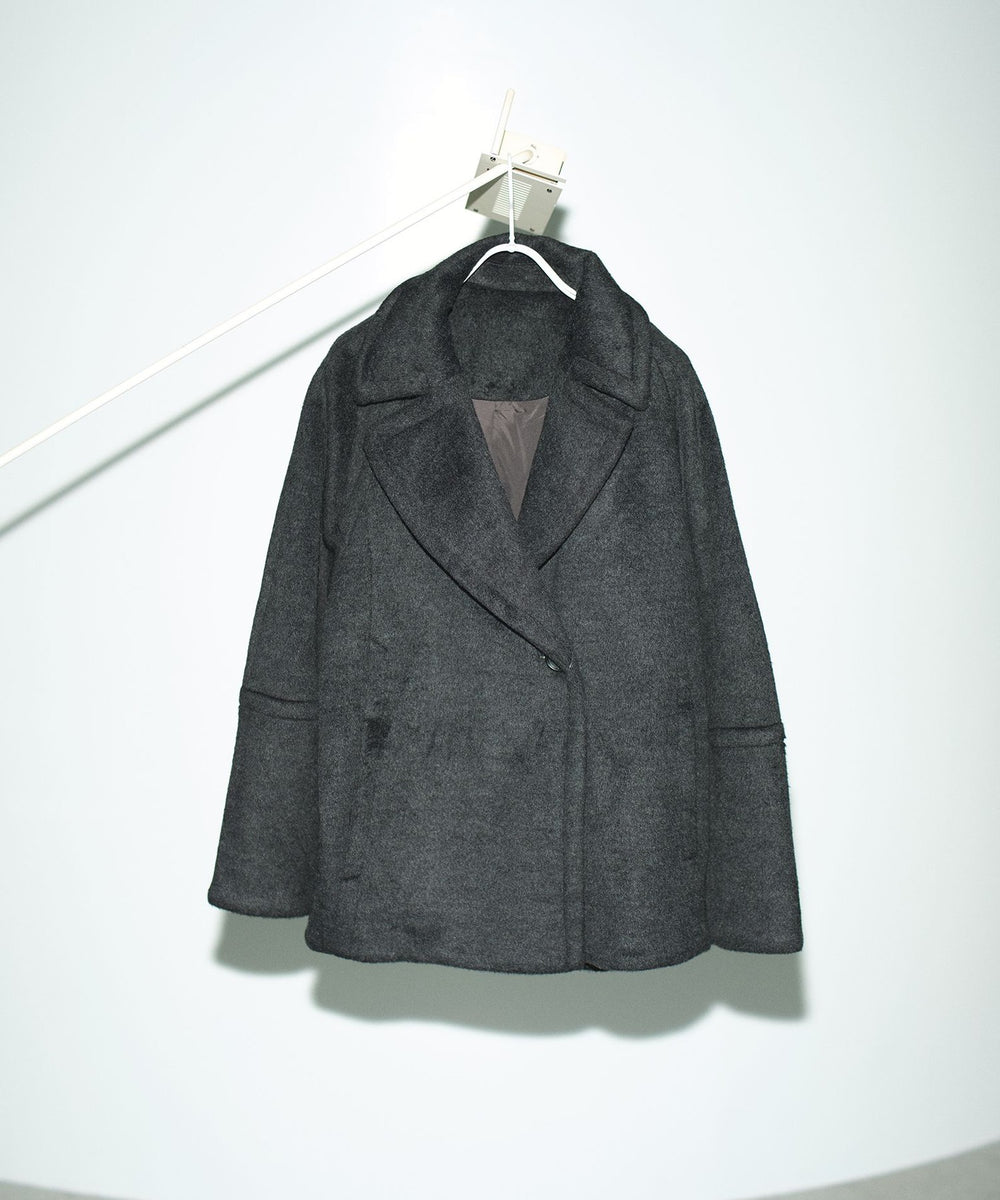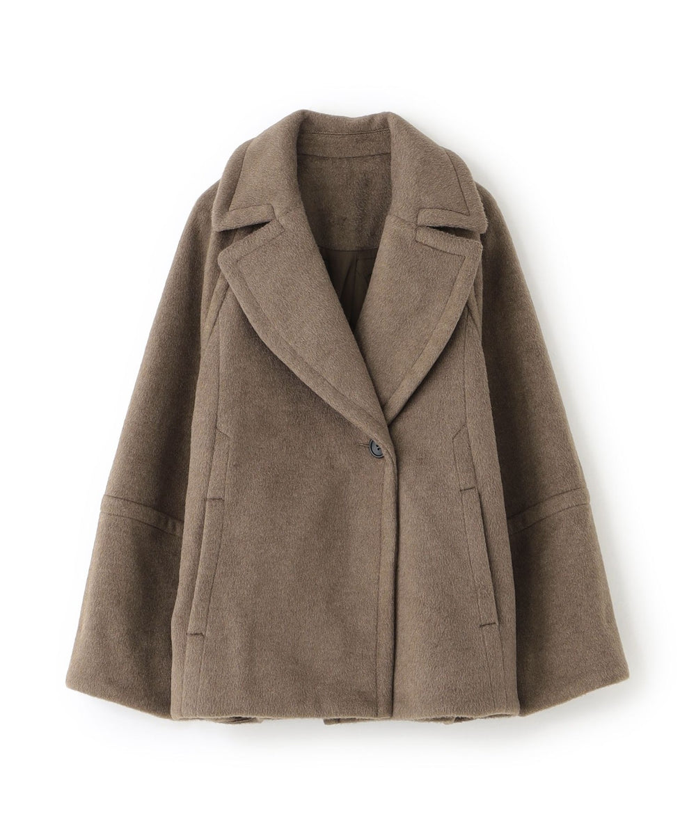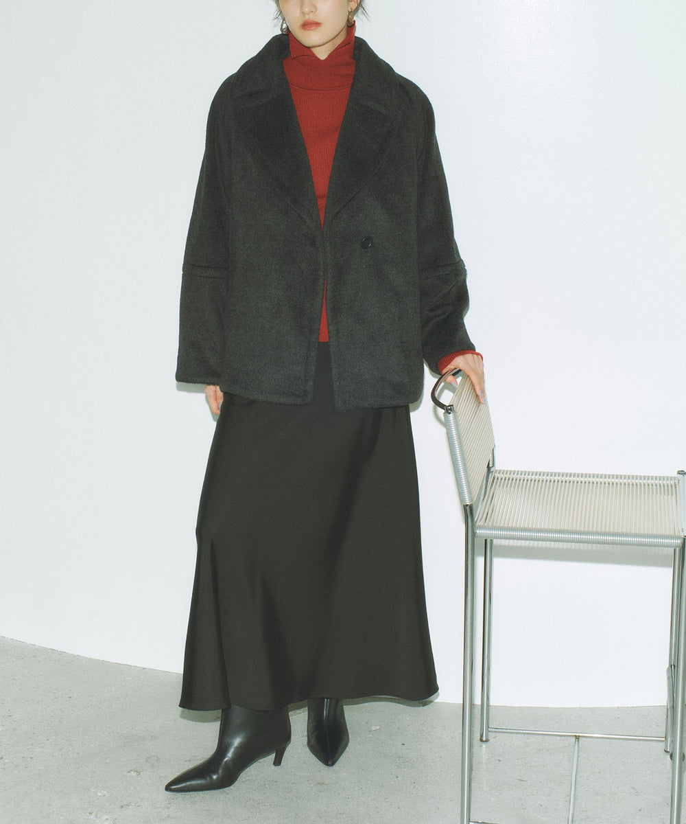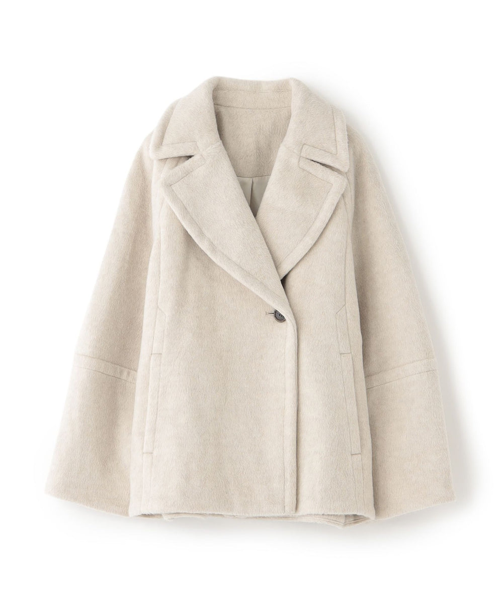 ややAラインに広がったシルエットと、丸みのあるフォルムがポイントのショートコート。大き目の襟とややボリュームのある袖のフォルム感も、デザインポイントになっています。ヒップにかかる70㎝丈で、スカートにもパンツにもバランスよく合わせられます。