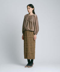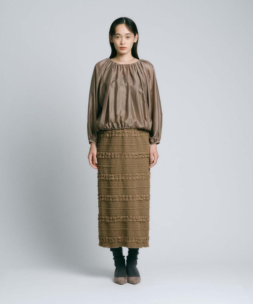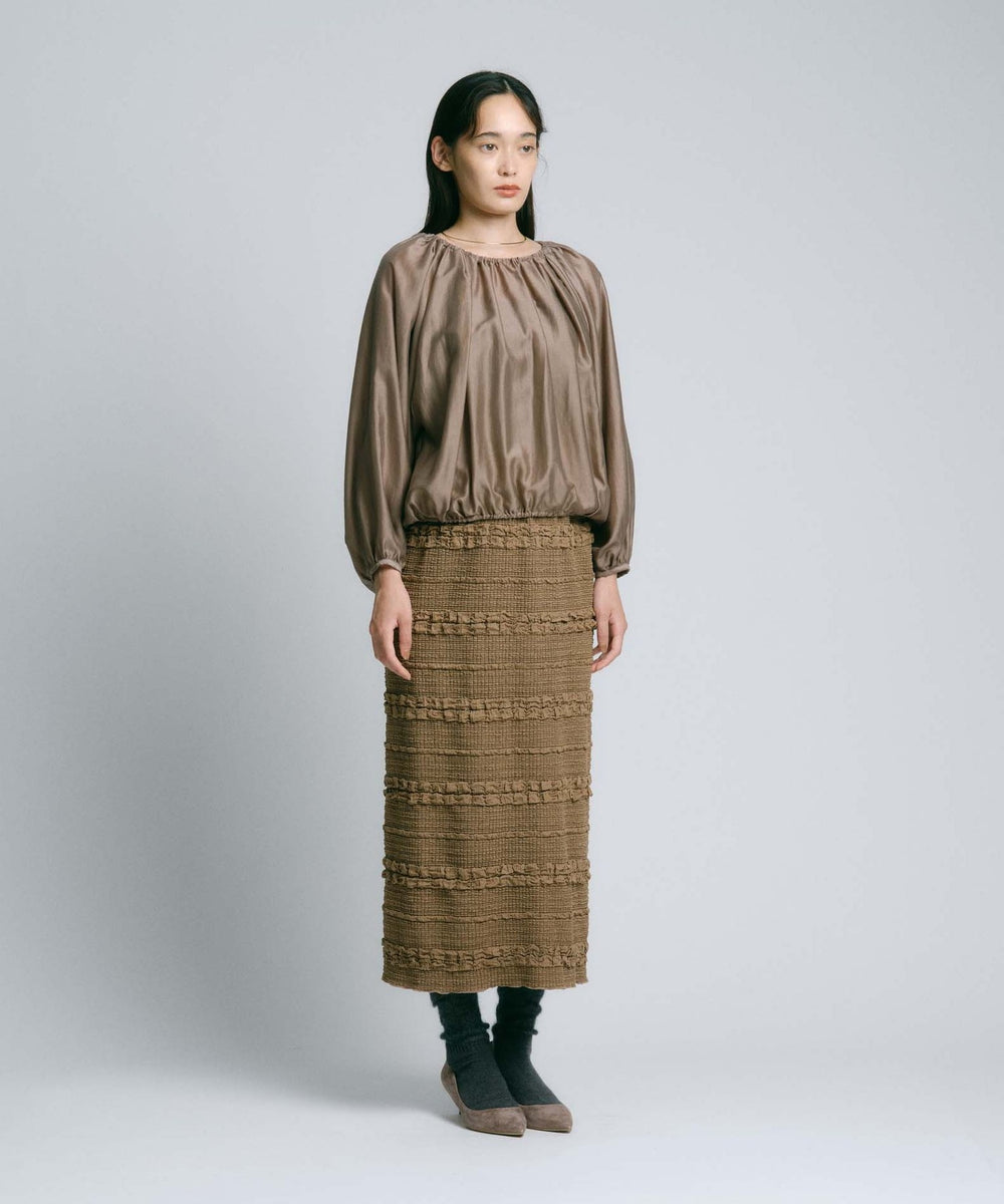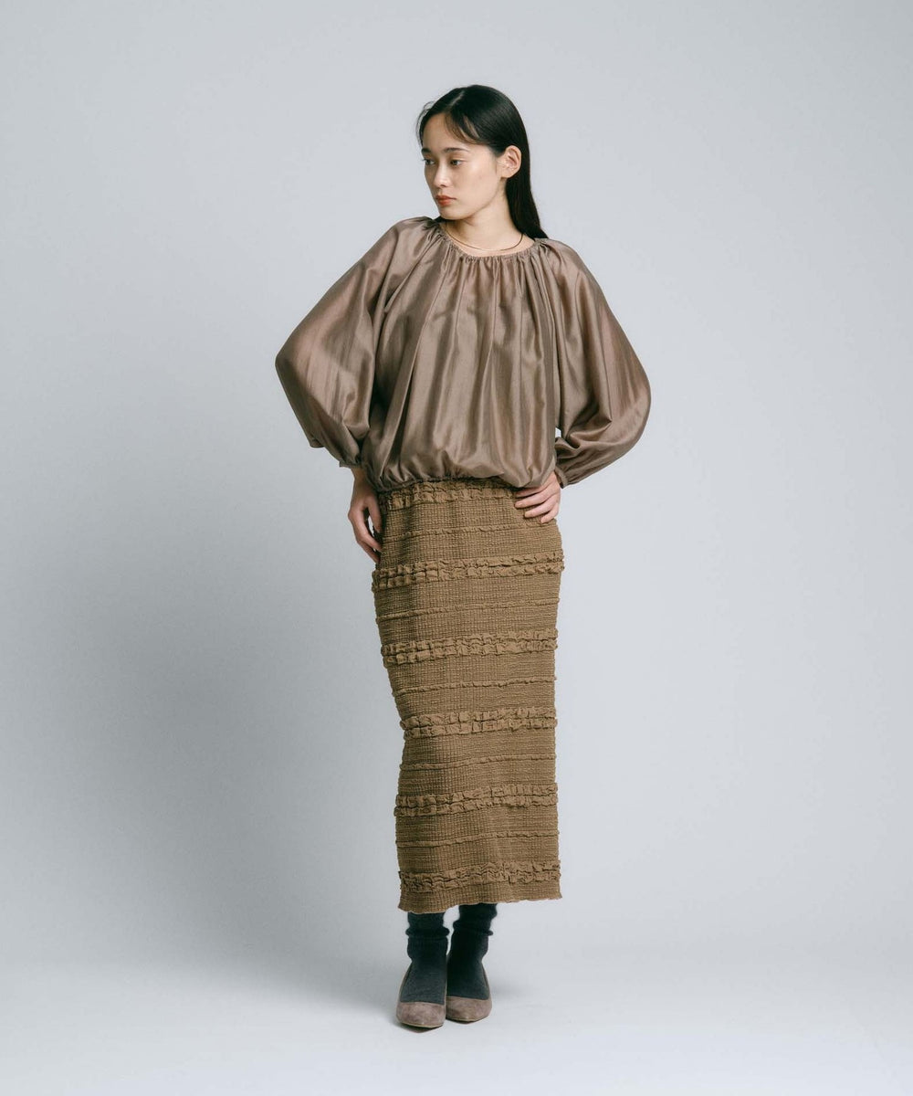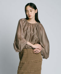なめらかでやわらかな肌触りと、上品な微光沢が特徴のシアー素材を使用しています。ほどよいハリ感があるため、美しいドレープが生まれ、シルエットの美しさを引き立てます。ニュアンスのあるカラーは、季節感を取り入れつつも長く愛用できる絶妙なカラー展開です。