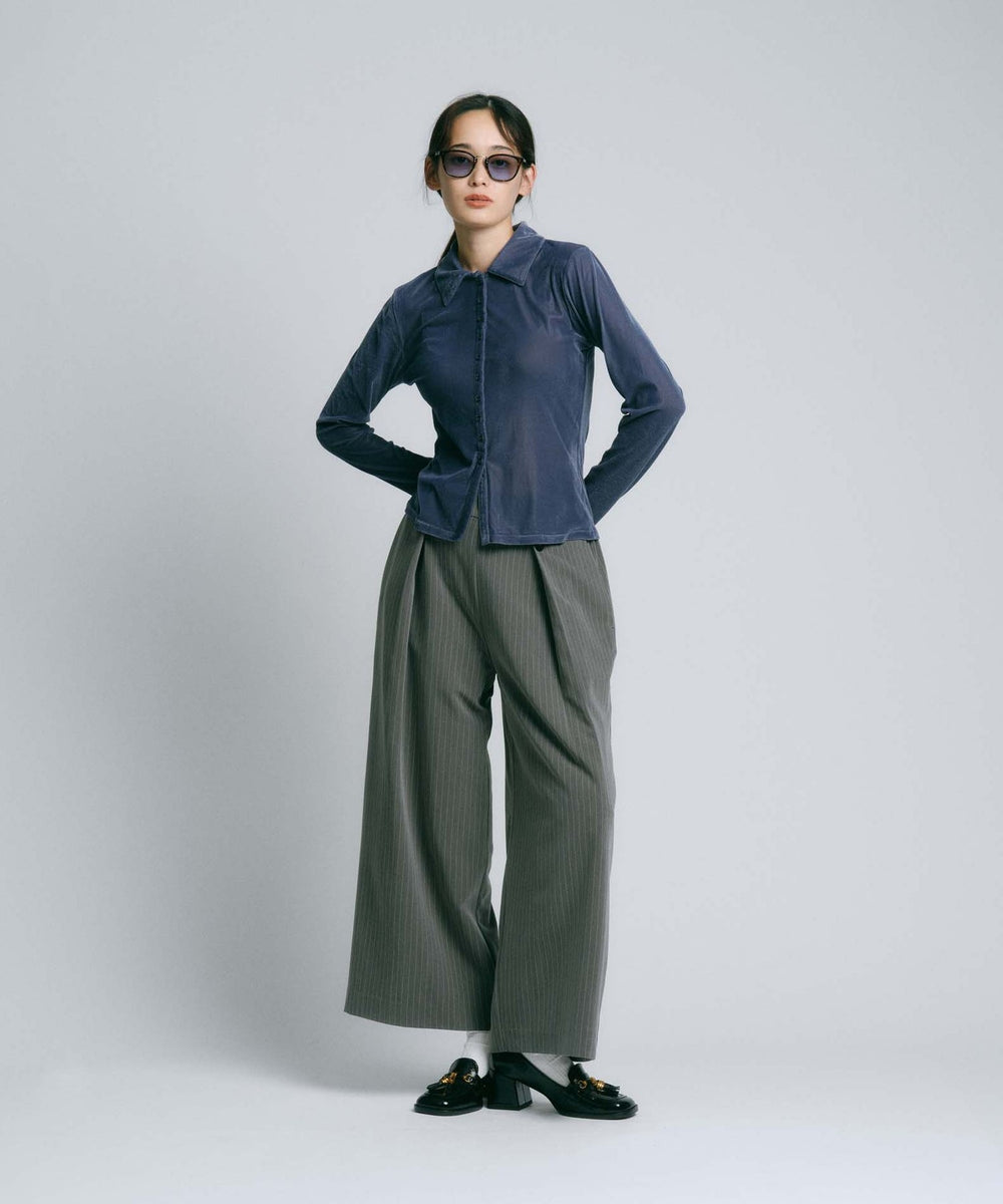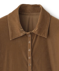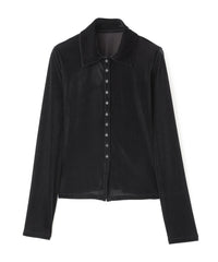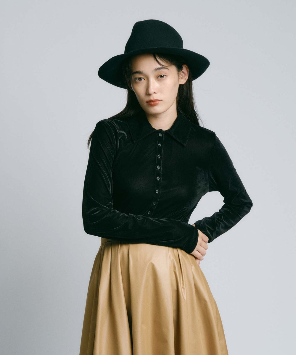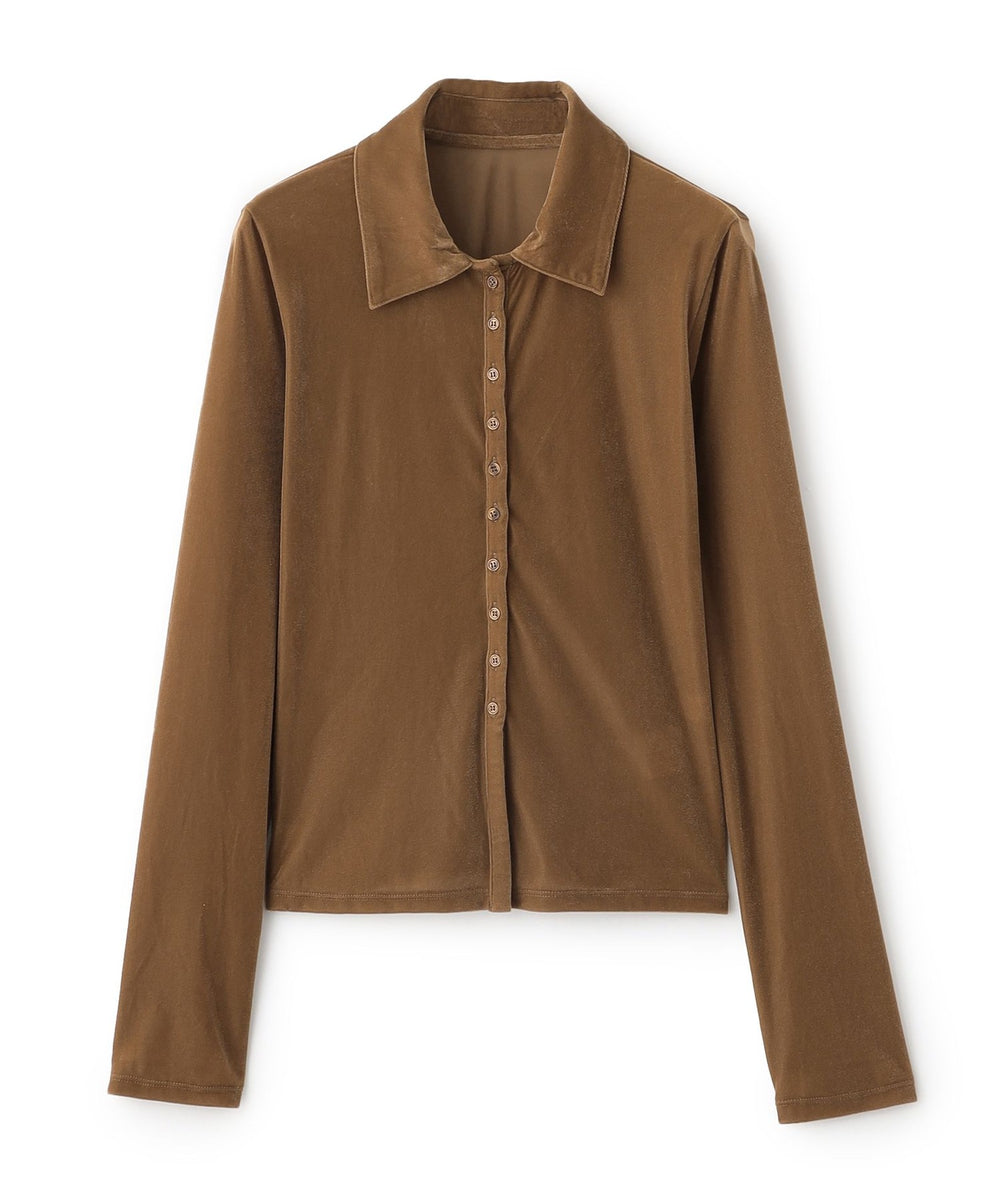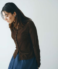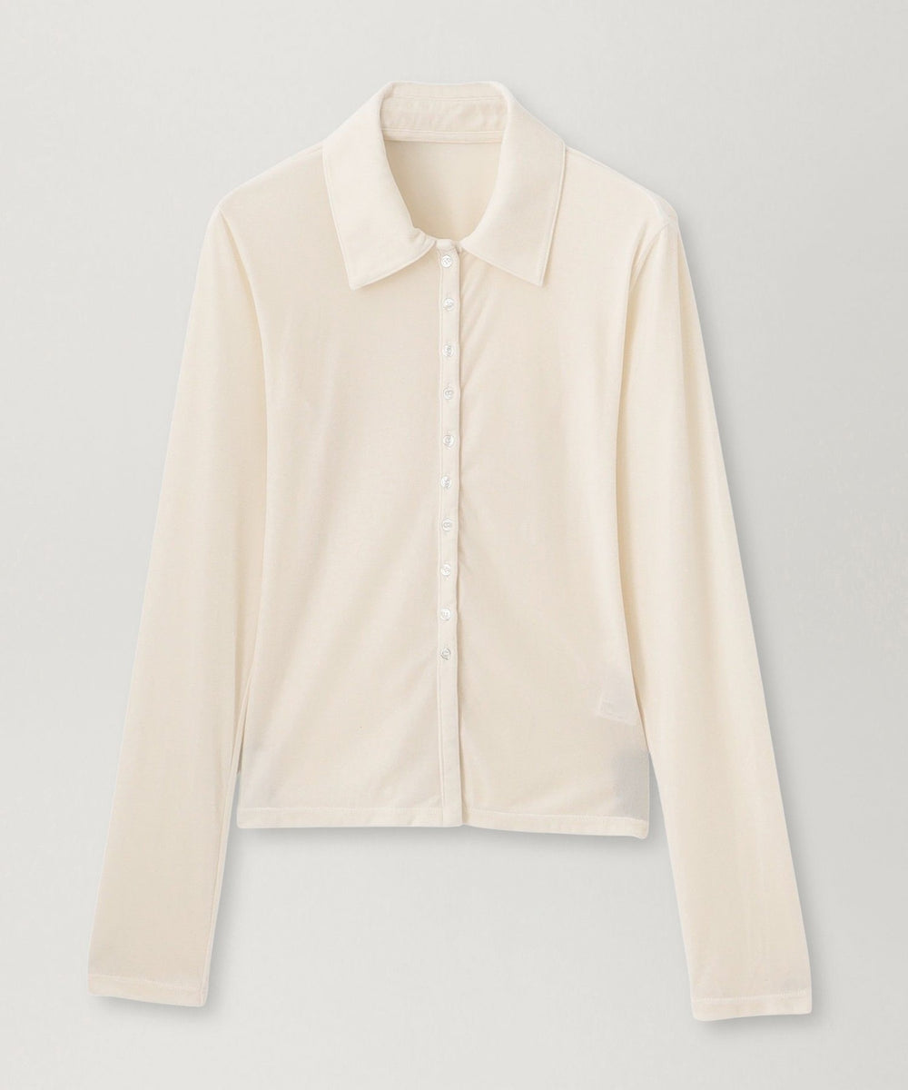 トレンドのシアーとベロアを掛け合わせ、ぐっと秋冬のムードを引き出すシャツブラウス。多めのボタンがクラシカルな印象を与えながらも、コンパクトなシルエットで洗練された雰囲気に。ボタンを全て留めればきちんと感のあるブラウスとして、開ければカーディガン風の軽やかな着こなしも。ベロア特有の起毛感の強い素材感ではないので、暑い時期からでも着やすくレイヤードスタイルのインナーとしても活躍する優秀アイテムです。