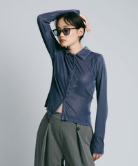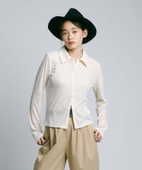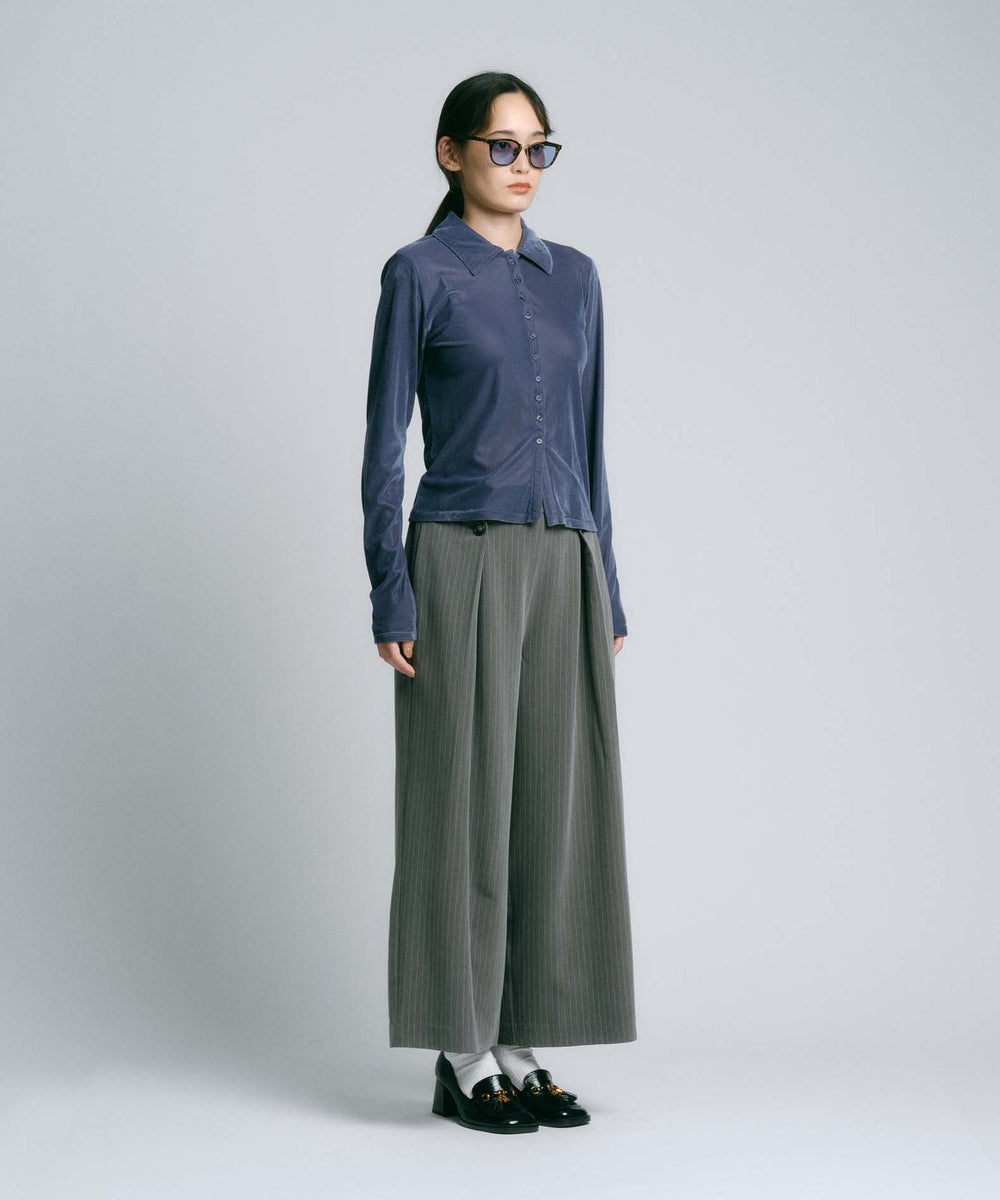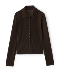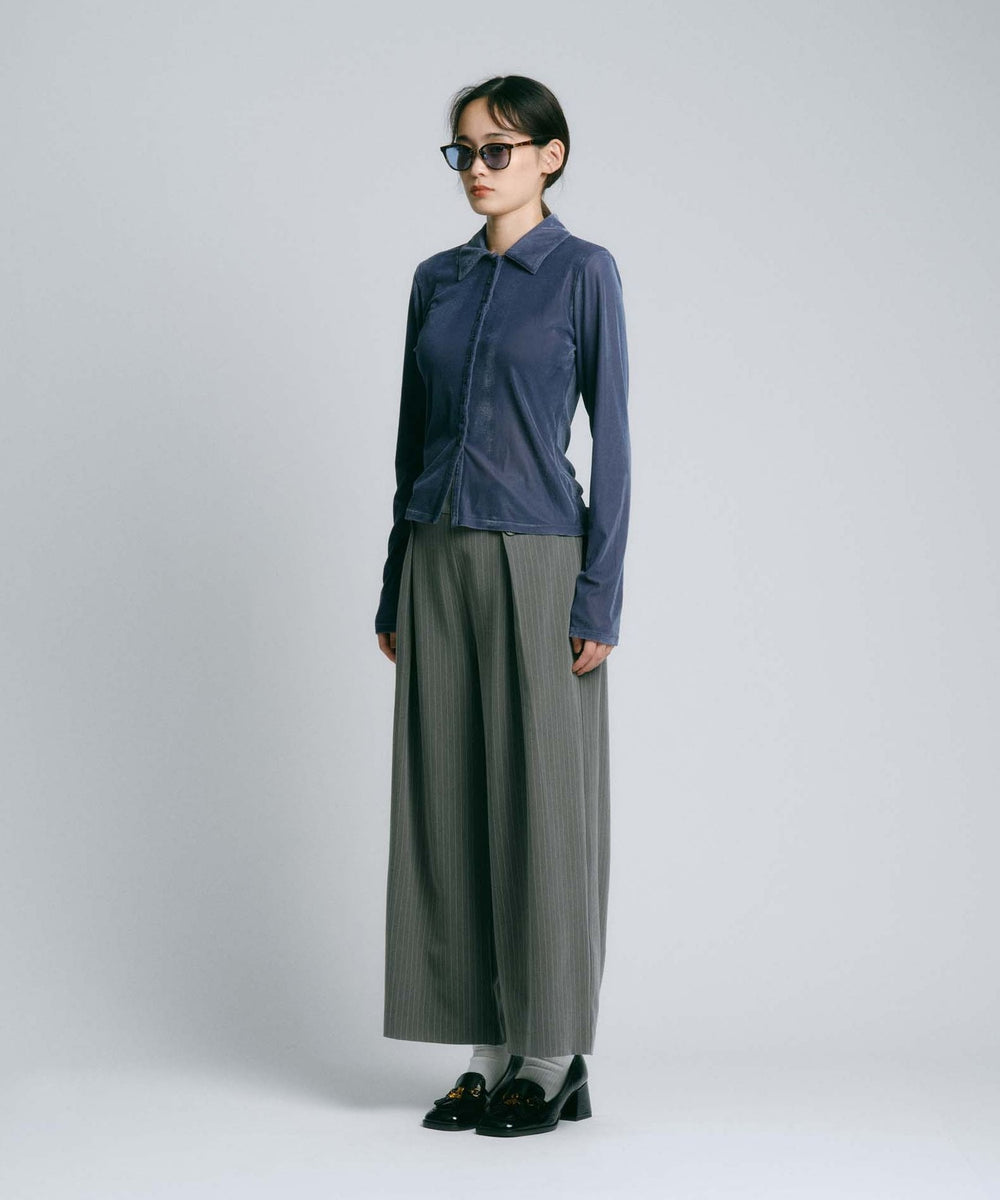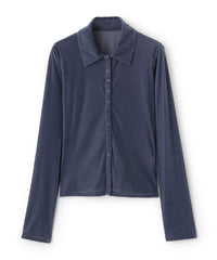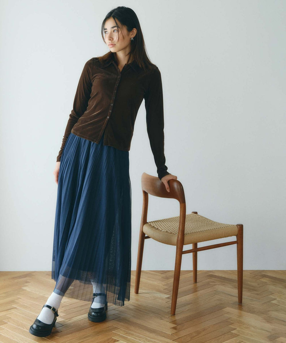 トレンドのシアーとベロアを掛け合わせ、ぐっと秋冬のムードを引き出すシャツブラウス。多めのボタンがクラシカルな印象を与えながらも、コンパクトなシルエットで洗練された雰囲気に。ボタンを全て留めればきちんと感のあるブラウスとして、開ければカーディガン風の軽やかな着こなしも。ベロア特有の起毛感の強い素材感ではないので、暑い時期からでも着やすくレイヤードスタイルのインナーとしても活躍する優秀アイテムです。