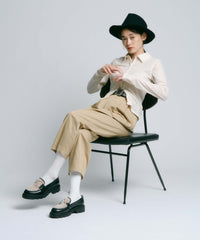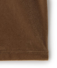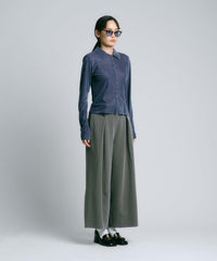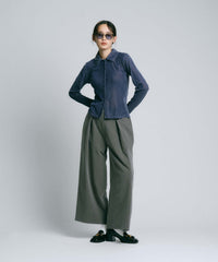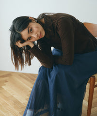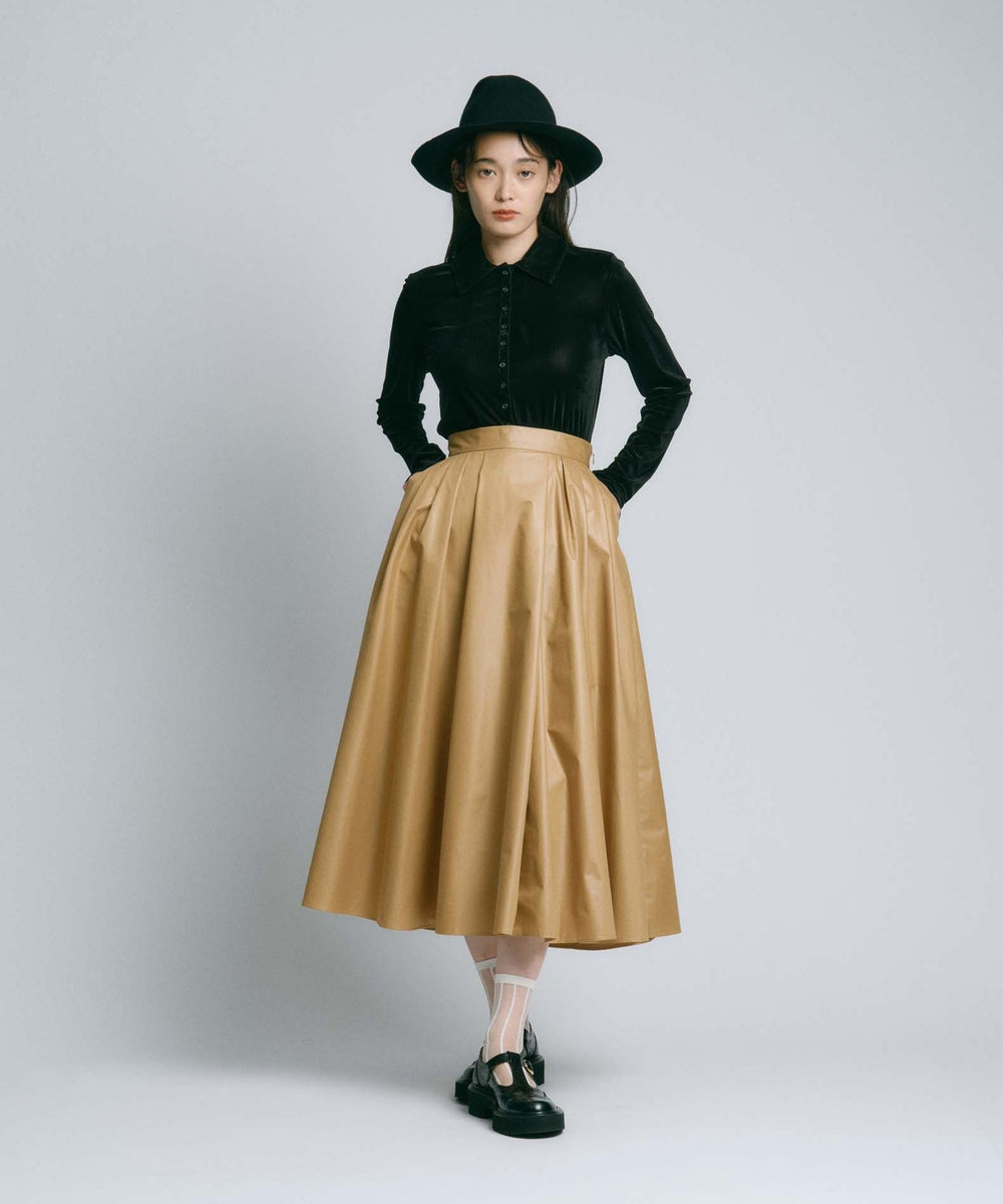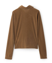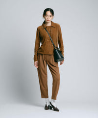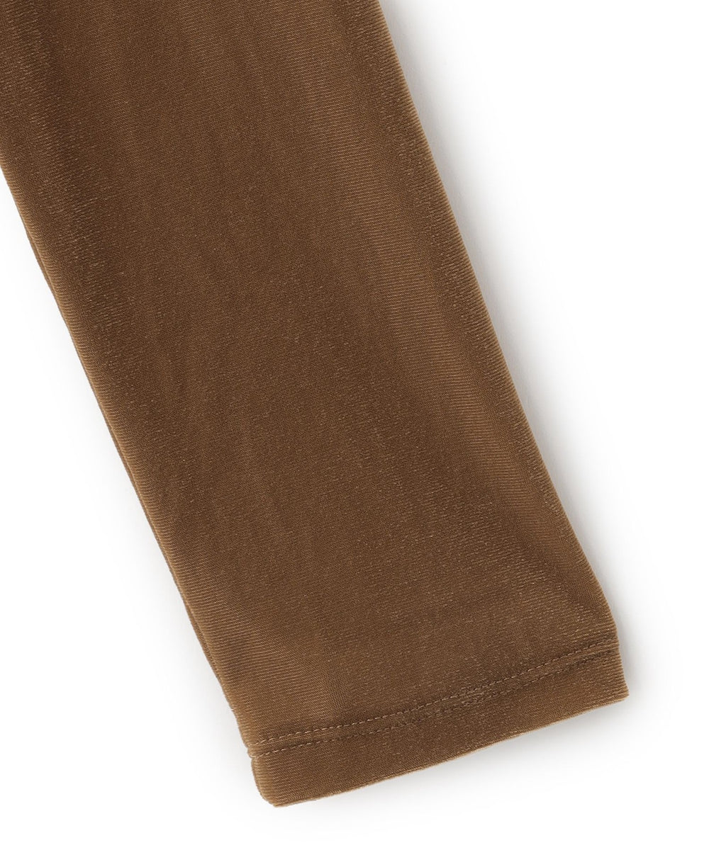 軽やかなシアーベロアのジャージー素材が、上質な光沢と絶妙な透け感を演出。重くなりがちなベロア素材を軽やかに仕上げることで、季節の変わり目にも快適に着用できます。光の当たり方で表情が変わる素材感が、大人の魅力を引き立てます。