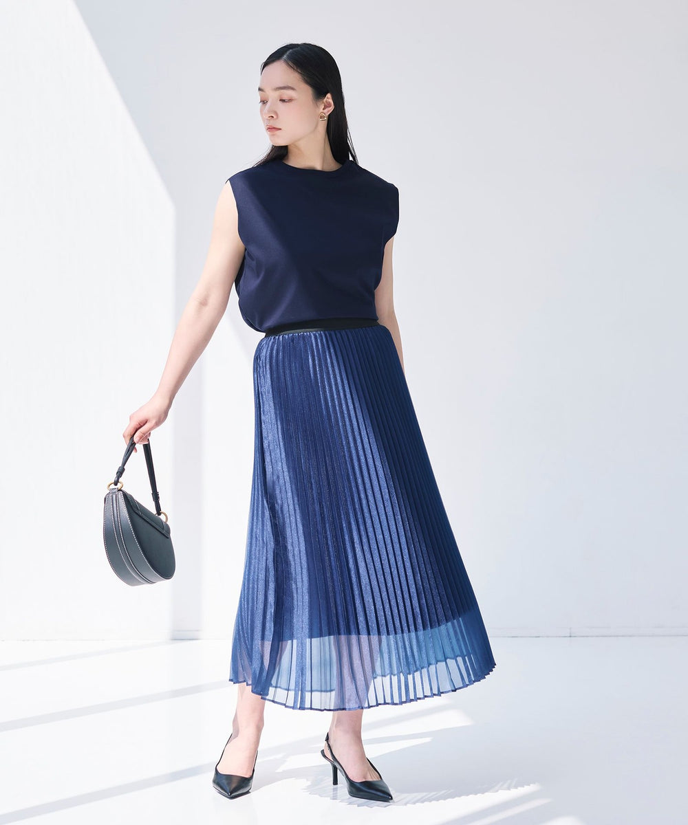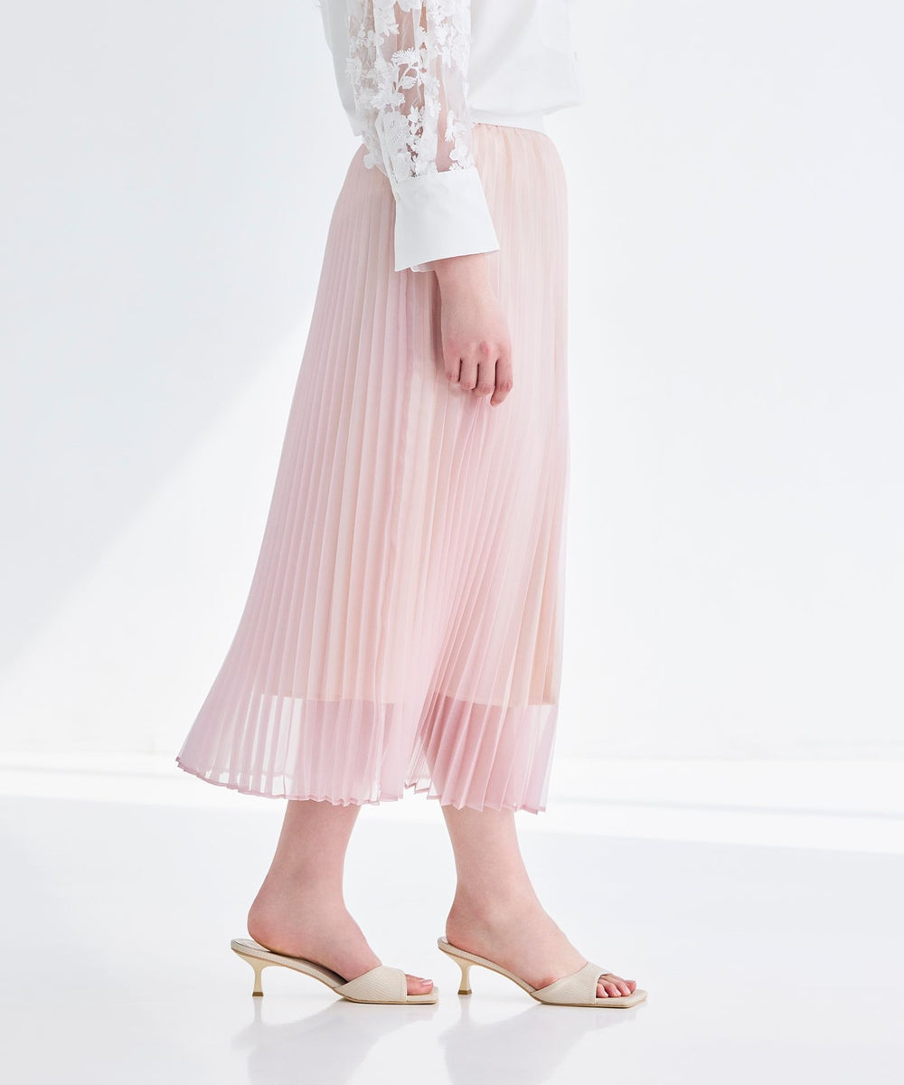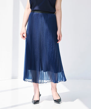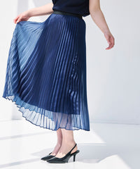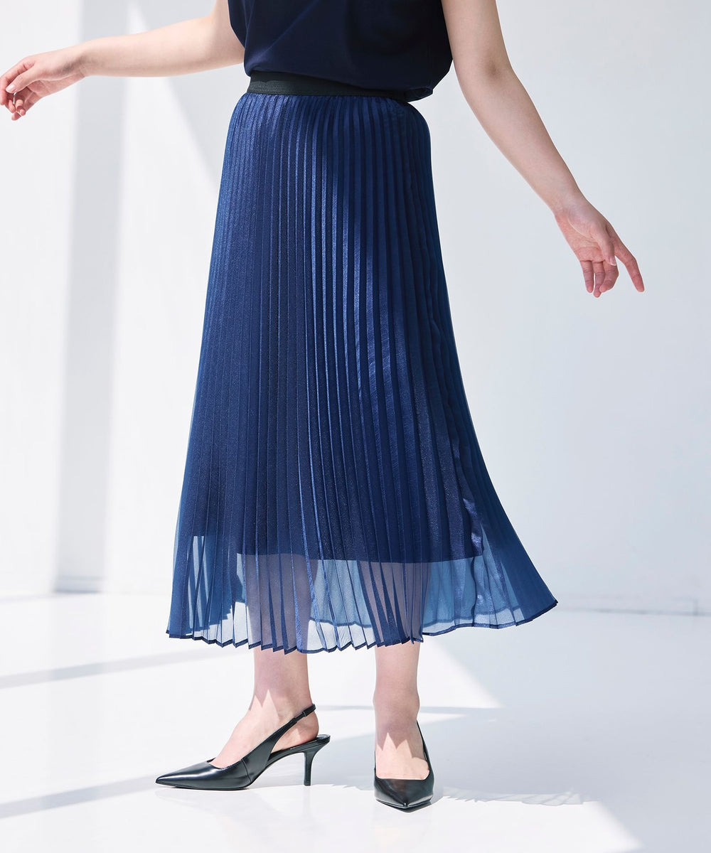 エレガントな透け感と光沢が魅力的なプリーツスカートです。軽量な素材ととウエストゴムで着心地は抜群。オフィスカジュアルからちょっとしたお出かけまで、幅広いシーンで活躍する一枚です。