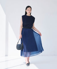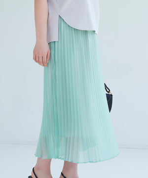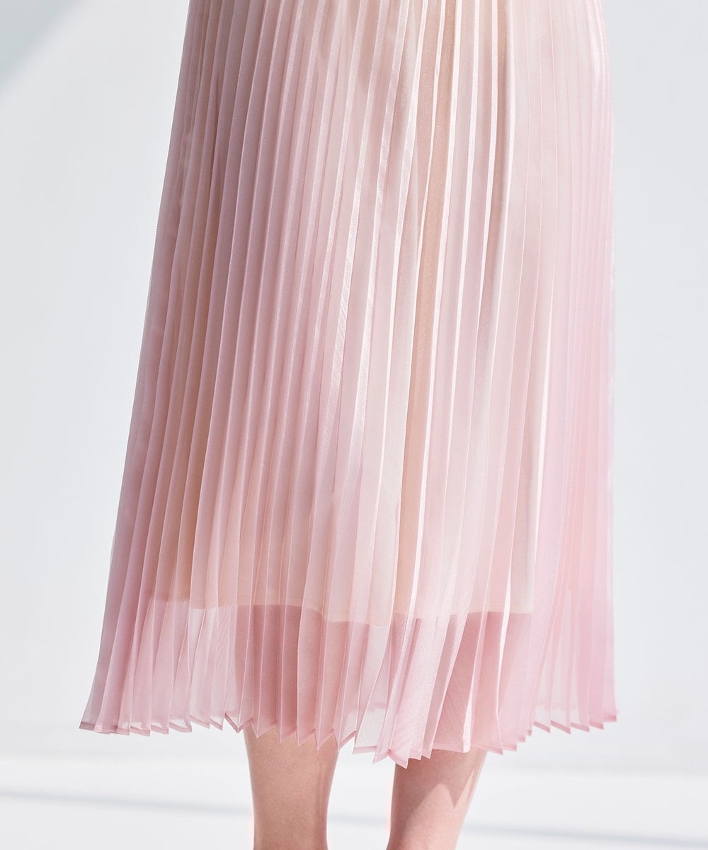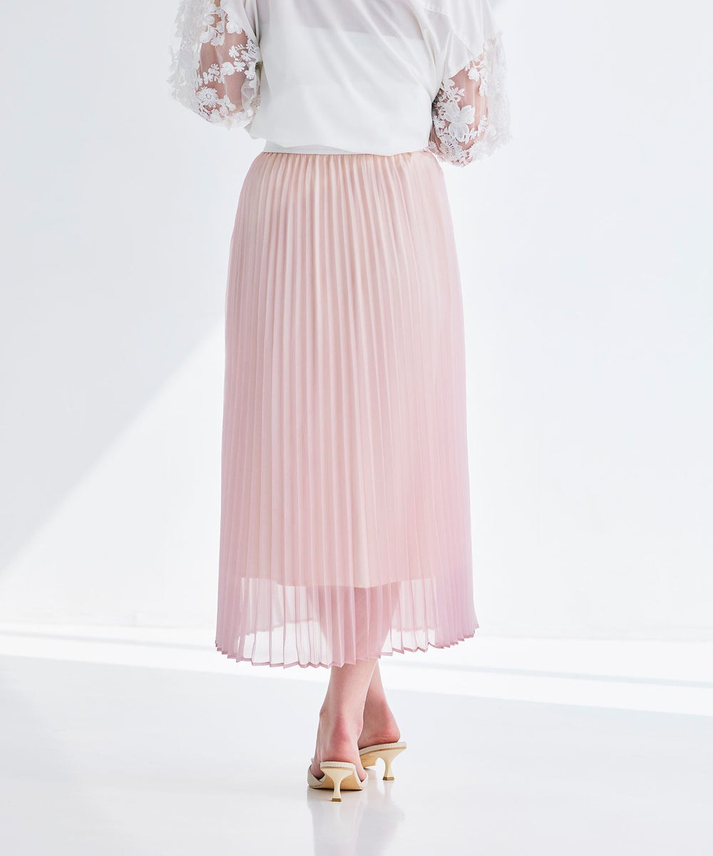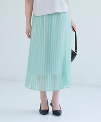 エレガントな透け感と光沢が魅力的なプリーツスカートです。軽量な素材ととウエストゴムで着心地は抜群。オフィスカジュアルからちょっとしたお出かけまで、幅広いシーンで活躍する一枚です。