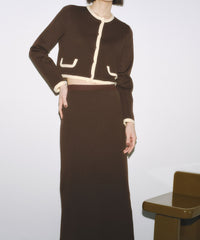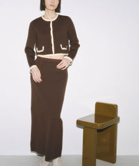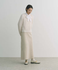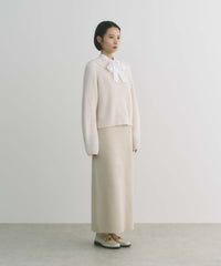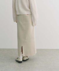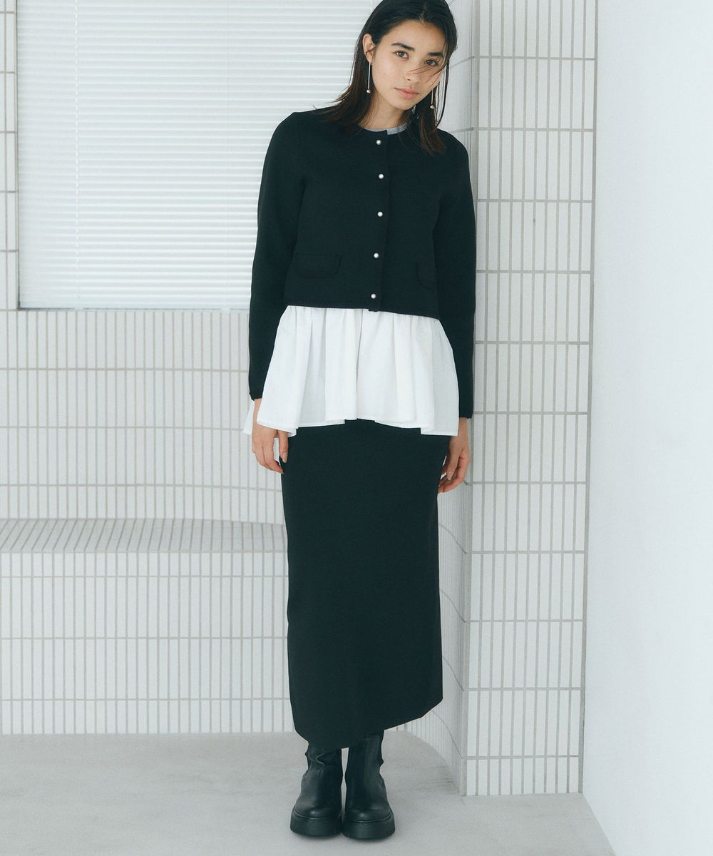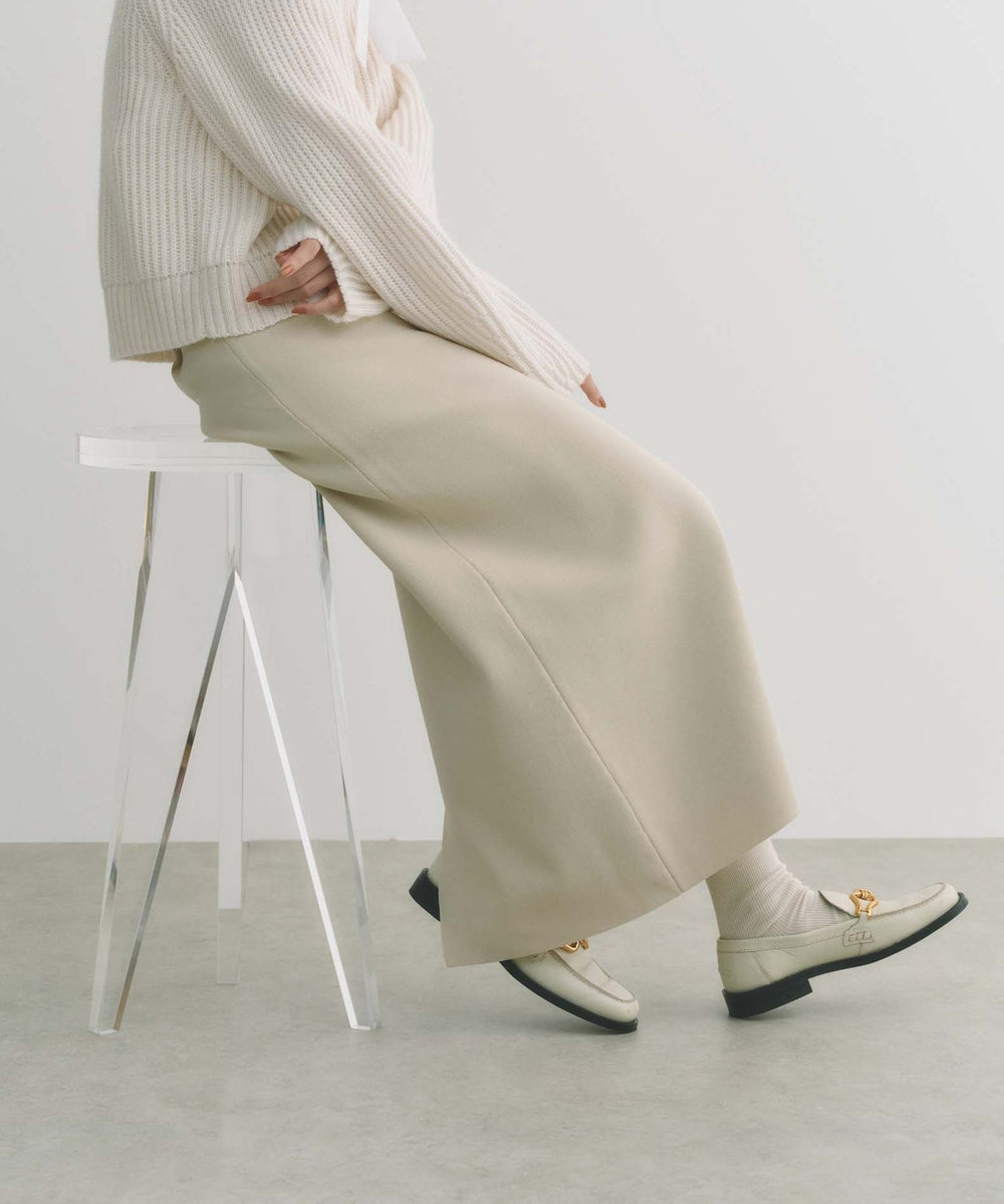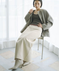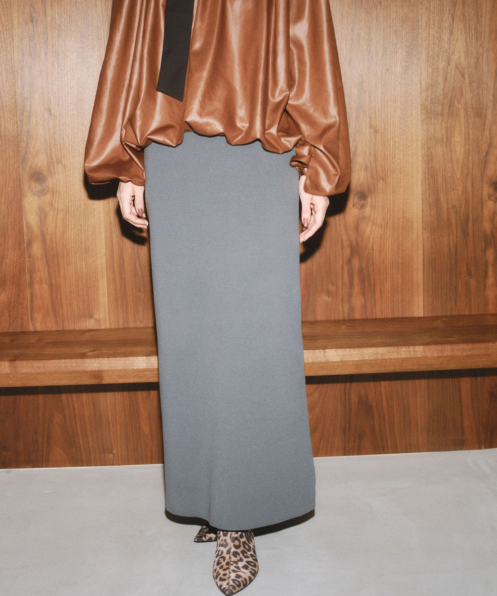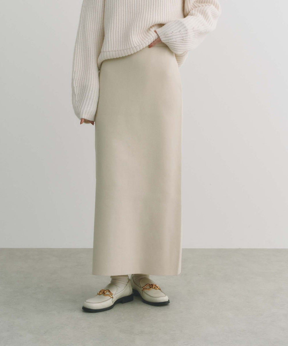 ナローシルエットでも程よいハリ感のある素材で、ヒップラインが気になりにくく着用できるのが嬉しいポイントです。ストレッチ性と裾スリットデザインで動きやすさも問題なく、オフィスでも快適に過ごせます。同素材のジャケットと合わせるとセットアップとしての統一感がありながらも、ニット素材ならではの柔らかな印象になります。