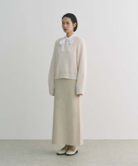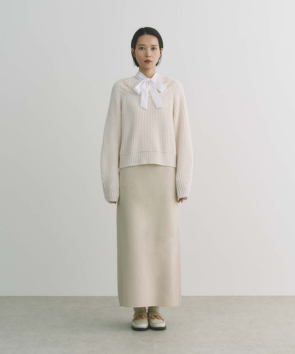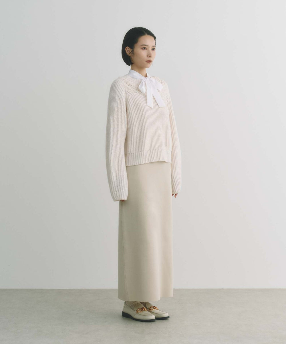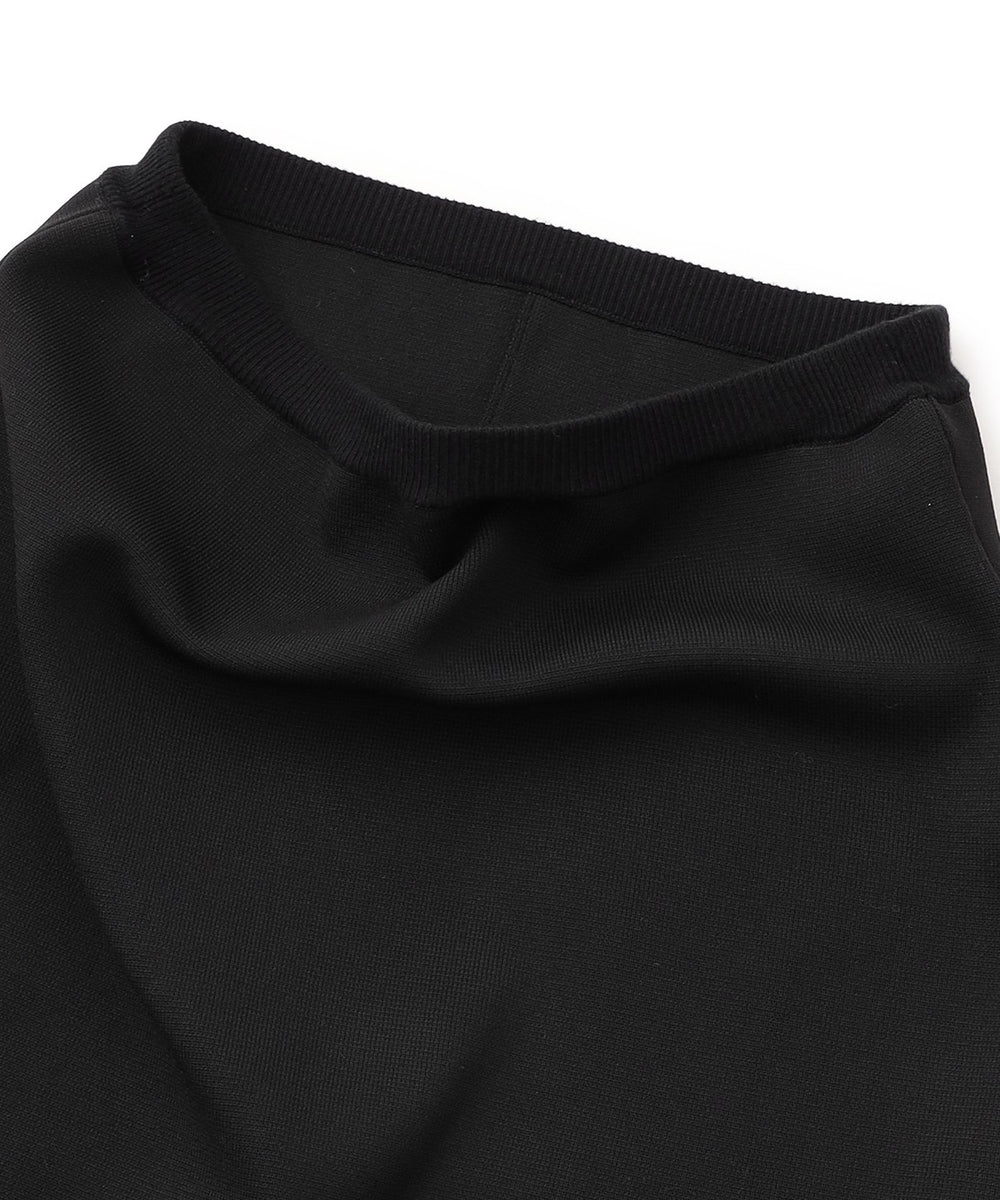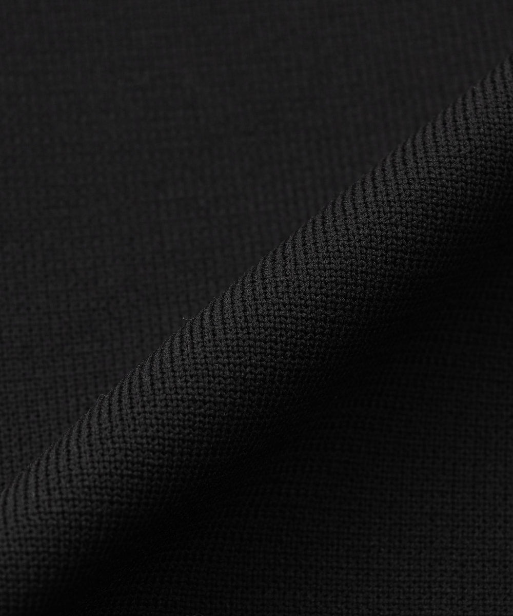 ウーリーポリエステルを使用した、着心地の良さと程よいハリ、軽さを兼ね備えた素材を使用しています。リブ編みと袋編みを組み合わせた高密度なミラノリブ組織が、目が詰まったハリと微光沢のある上質な素材感に仕上げています。型崩れしにくい特性により、長時間着用しても美しいシルエットをキープ。ポリエステルベースの素材を採用しているため、3シーズン活用可能な実用性の高さも魅力です。