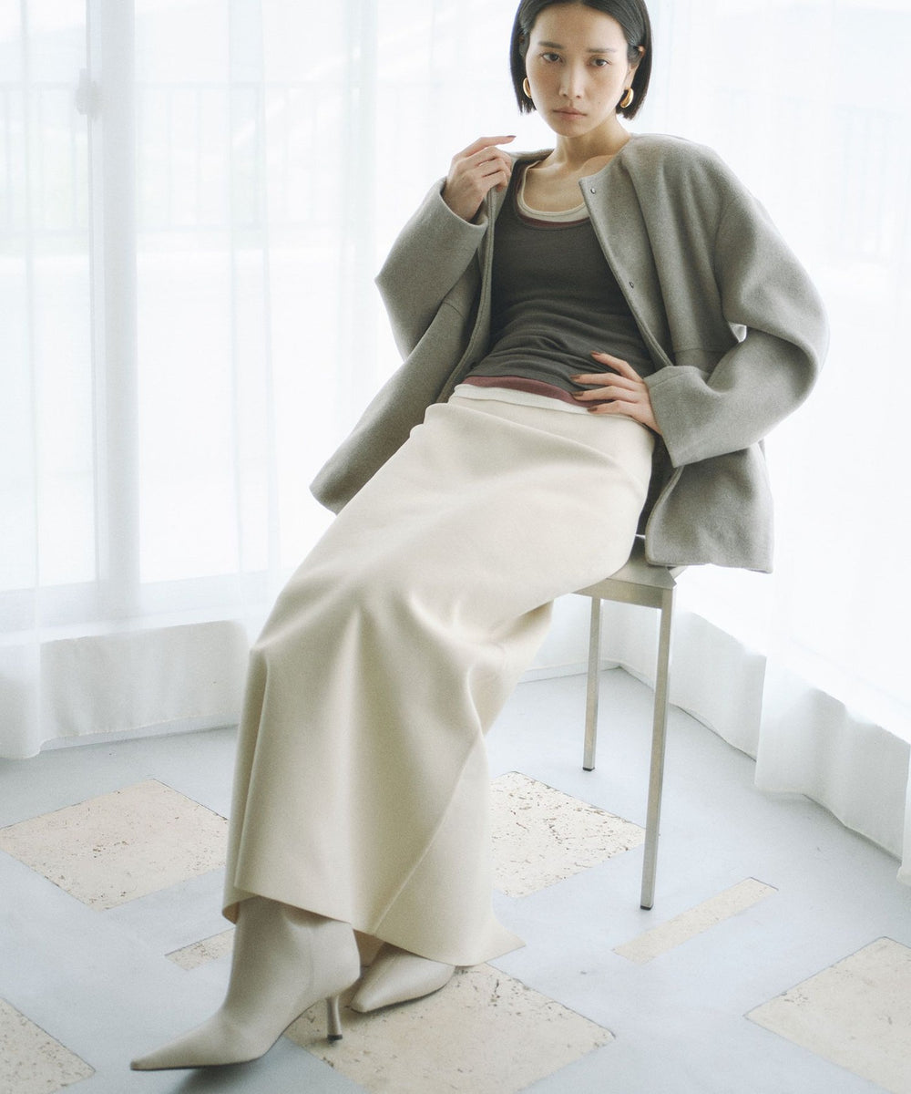 洗練されたナローシルエットが、品格を引き立てるロングスカート。程よいハリ感のある素材で、ヒップラインを拾いにくいきれいなシルエットです。裾に入ったスリットが足さばきをスムーズにし、見た目の美しさと機能性を両立。飽きのこないデザインで、ワードローブに一着あると安心の定番アイテムです。単品使いはもちろん、同素材のジャケット(品番:W1E29625)とセットアップで着用すれば、ONシーンにも対応できる上品なスタイリングが完成します。