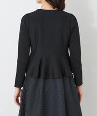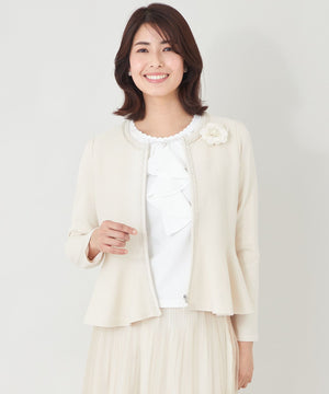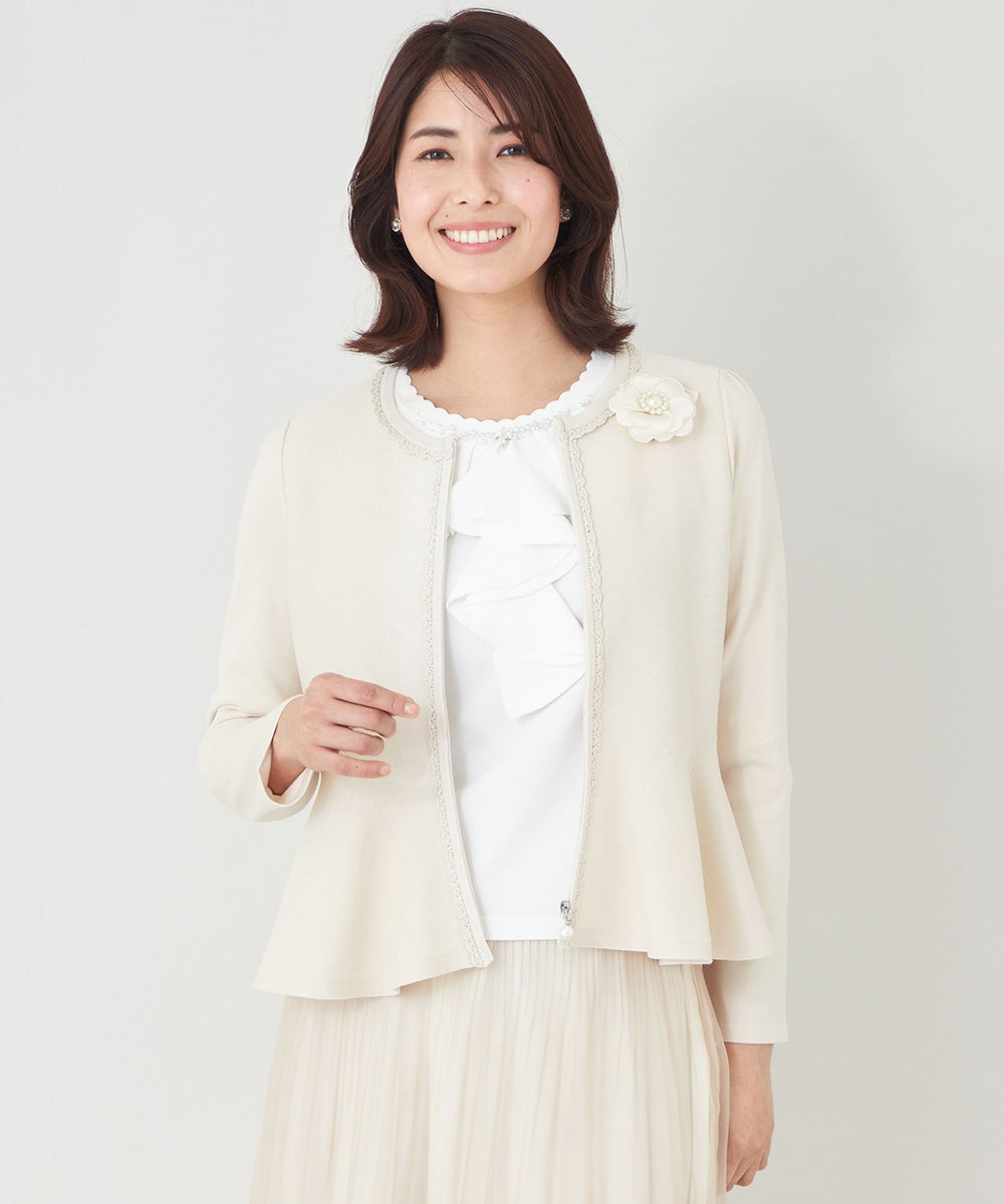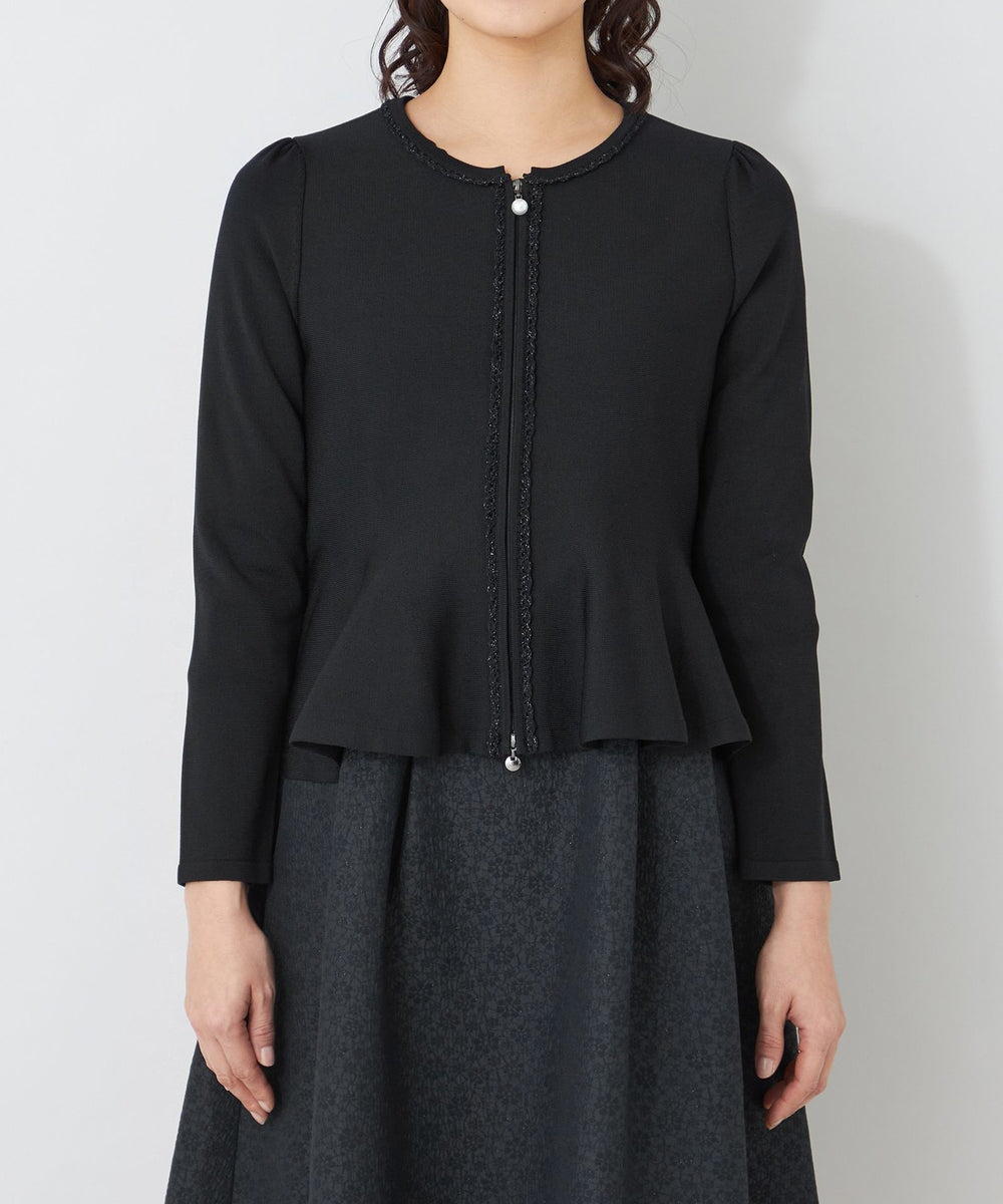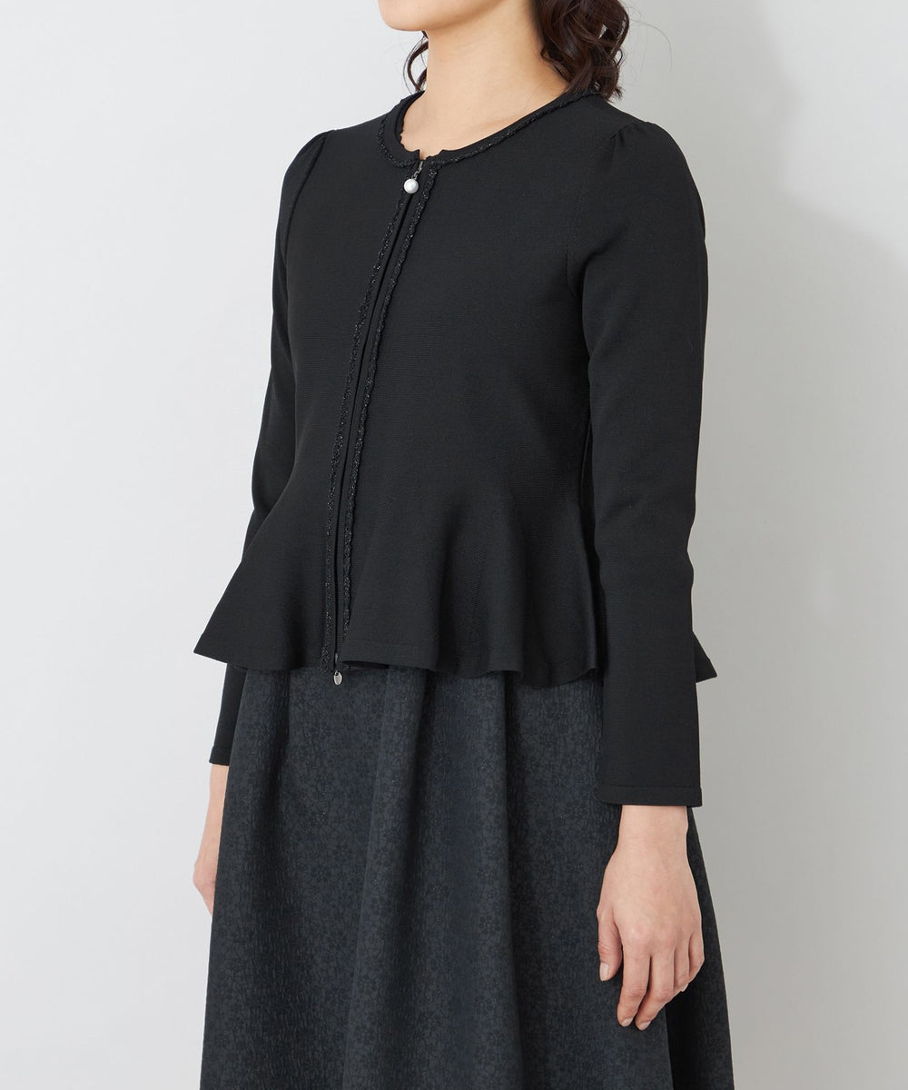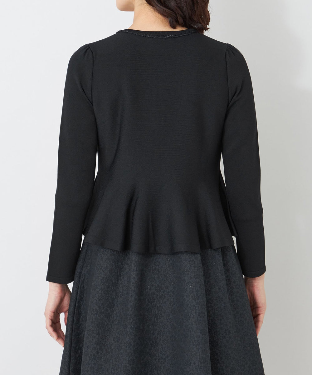 衿から前立てにかけてラメ糸を引き揃えたクロッシェ編みをあしらい、シンプルなデザインの中に上品な甘さを添えました。切り替えのない横編みで仕立てたペプラムフレアが、TO BE CHICらしいエレガントな印象を演出し、羽織るだけで華やぎをまとうニットアウターに仕上がっています。