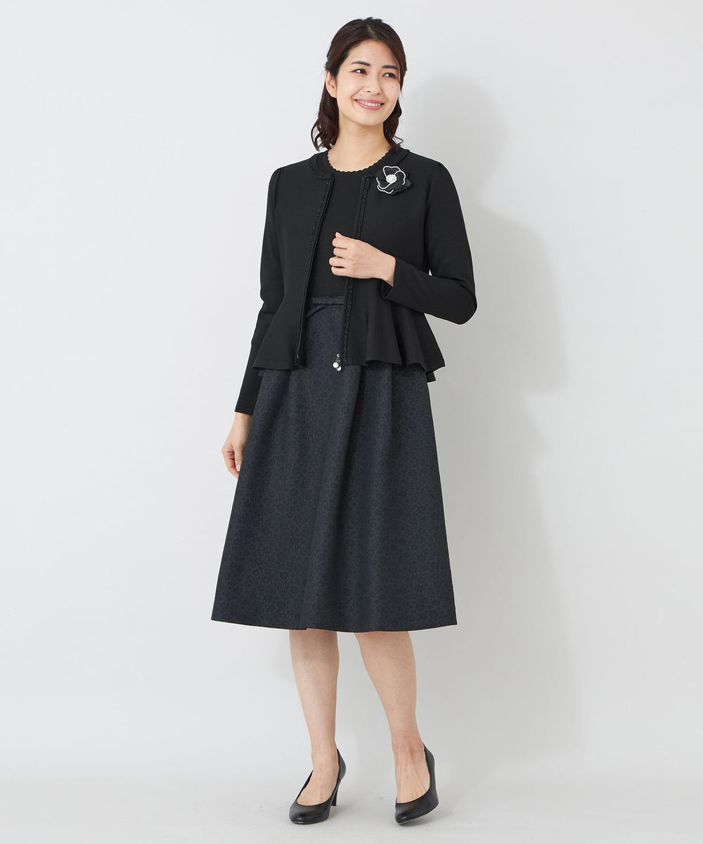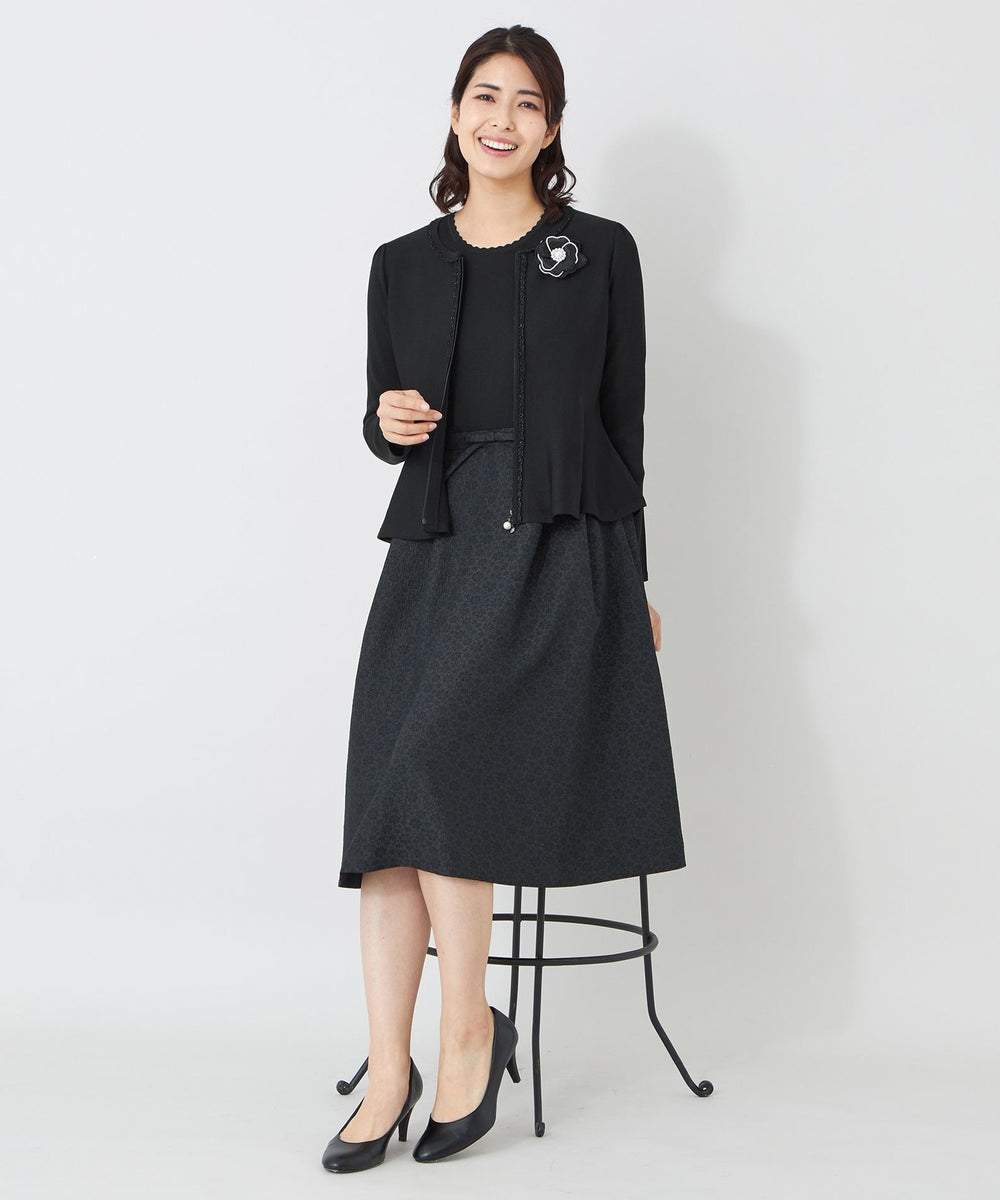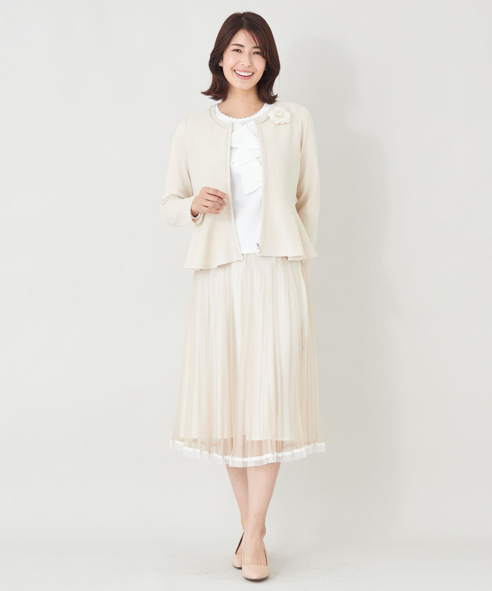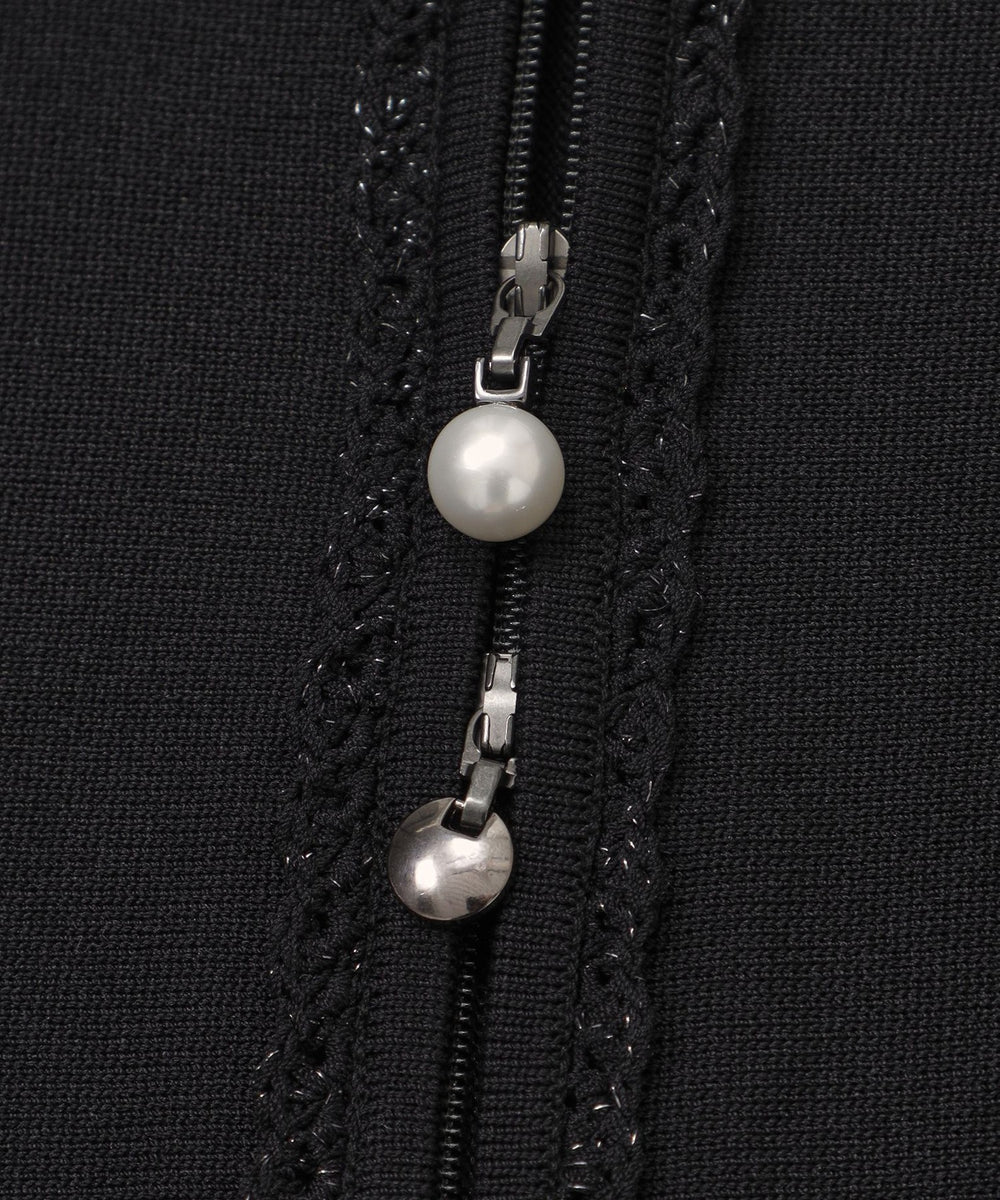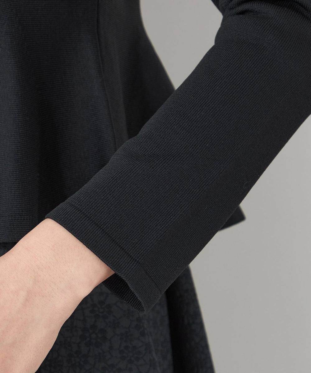 衿から前立てにかけてラメ糸を引き揃えたクロッシェ編みをあしらい、シンプルなデザインの中に上品な甘さを添えました。切り替えのない横編みで仕立てたペプラムフレアが、TO BE CHICらしいエレガントな印象を演出し、羽織るだけで華やぎをまとうニットアウターに仕上がっています。