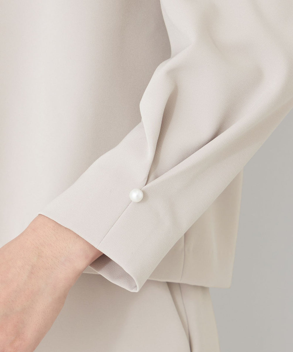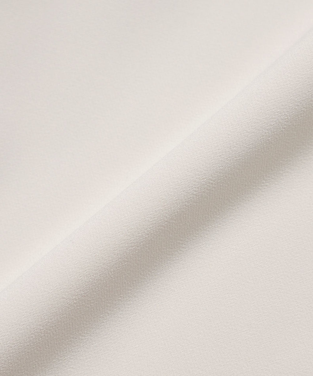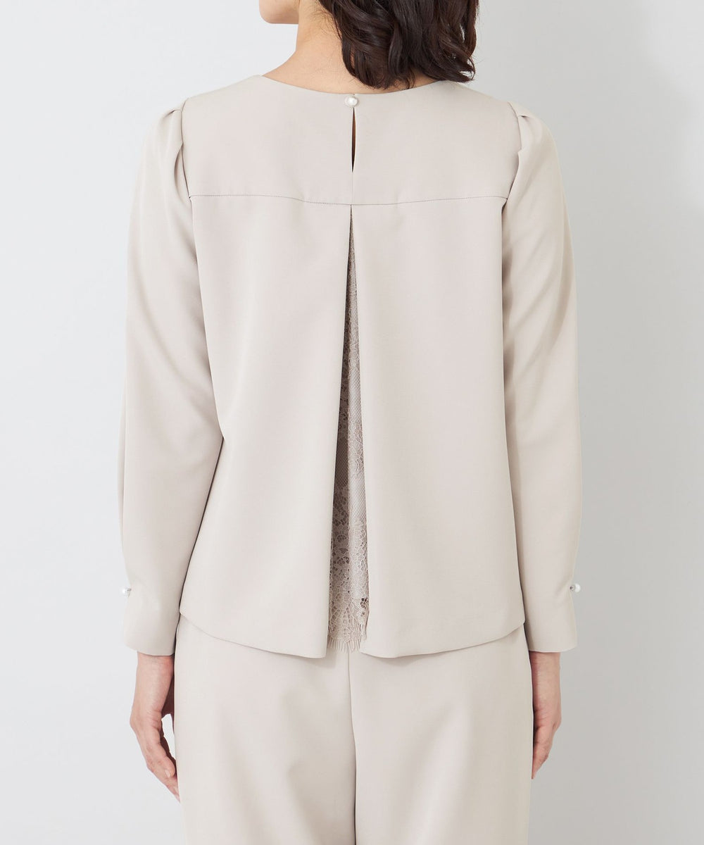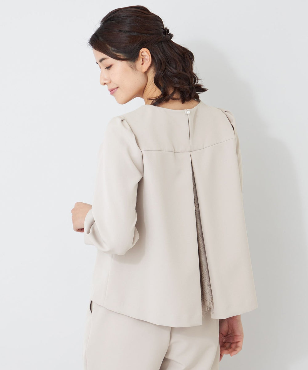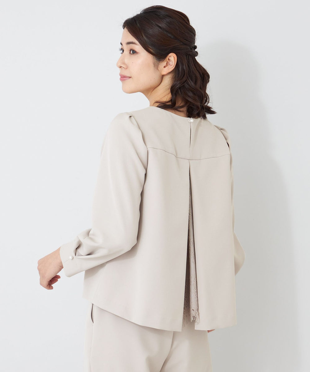ボックスシルエットのショートブラウスで、フロントはシンプルでスッキリとしたデザインに仕上げています。バックスタイルは、中心にボックスタックを施し、奥に裾スカラップ付きのラッセルレースを挟み込むことで、後ろ姿に上品なアクセントをプラスしました。袖口にはタックを寄せ、ポイントとしてパールボタンをあしらい、上品な印象を演出しています。
