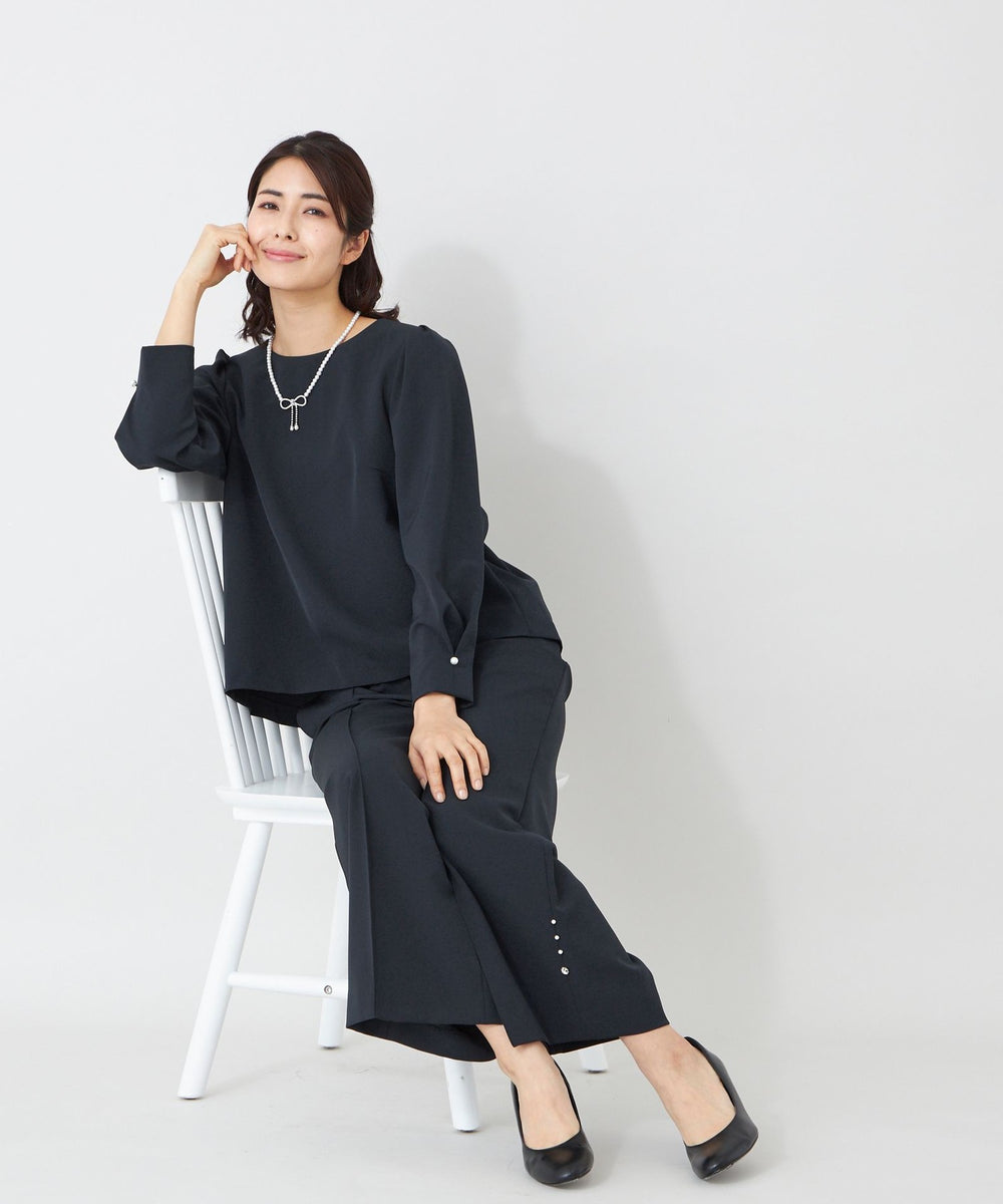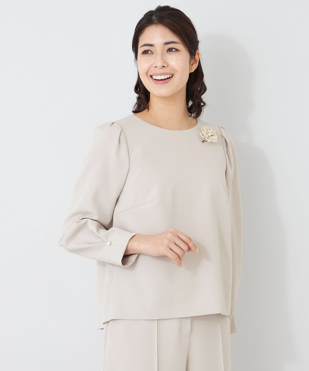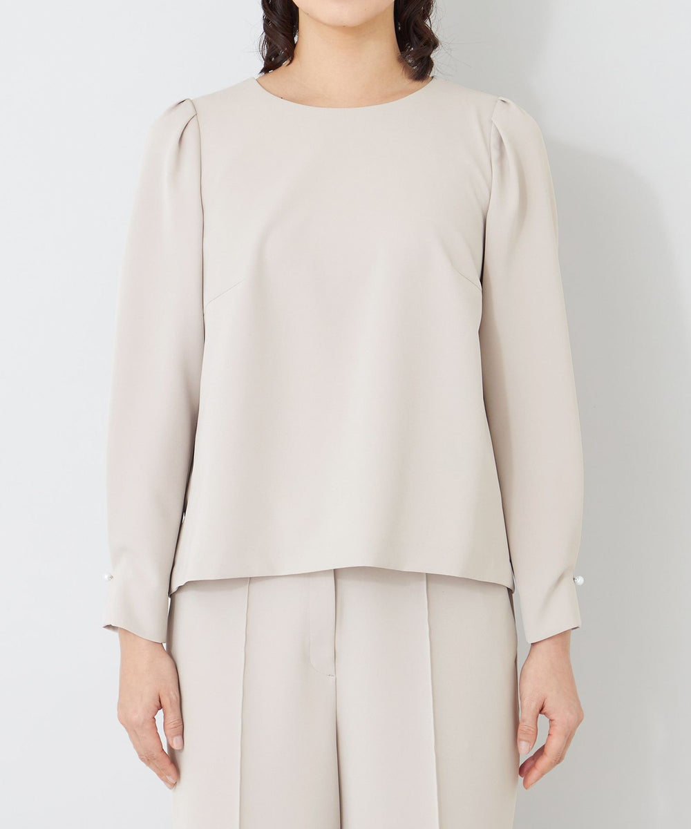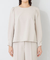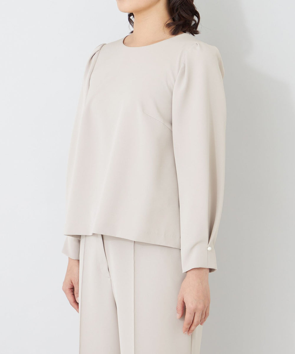 ボックスシルエットのショートブラウスで、フロントはシンプルでスッキリとしたデザインに仕上げています。バックスタイルは、中心にボックスタックを施し、奥に裾スカラップ付きのラッセルレースを挟み込むことで、後ろ姿に上品なアクセントをプラスしました。袖口にはタックを寄せ、ポイントとしてパールボタンをあしらい、上品な印象を演出しています。