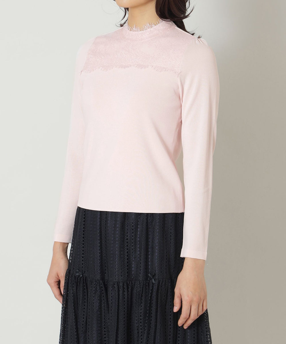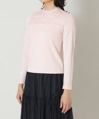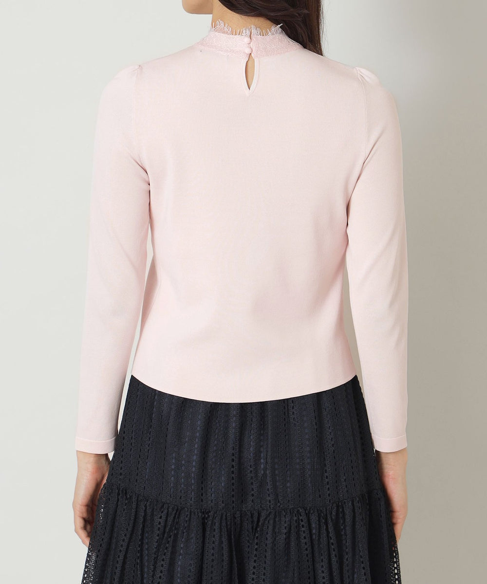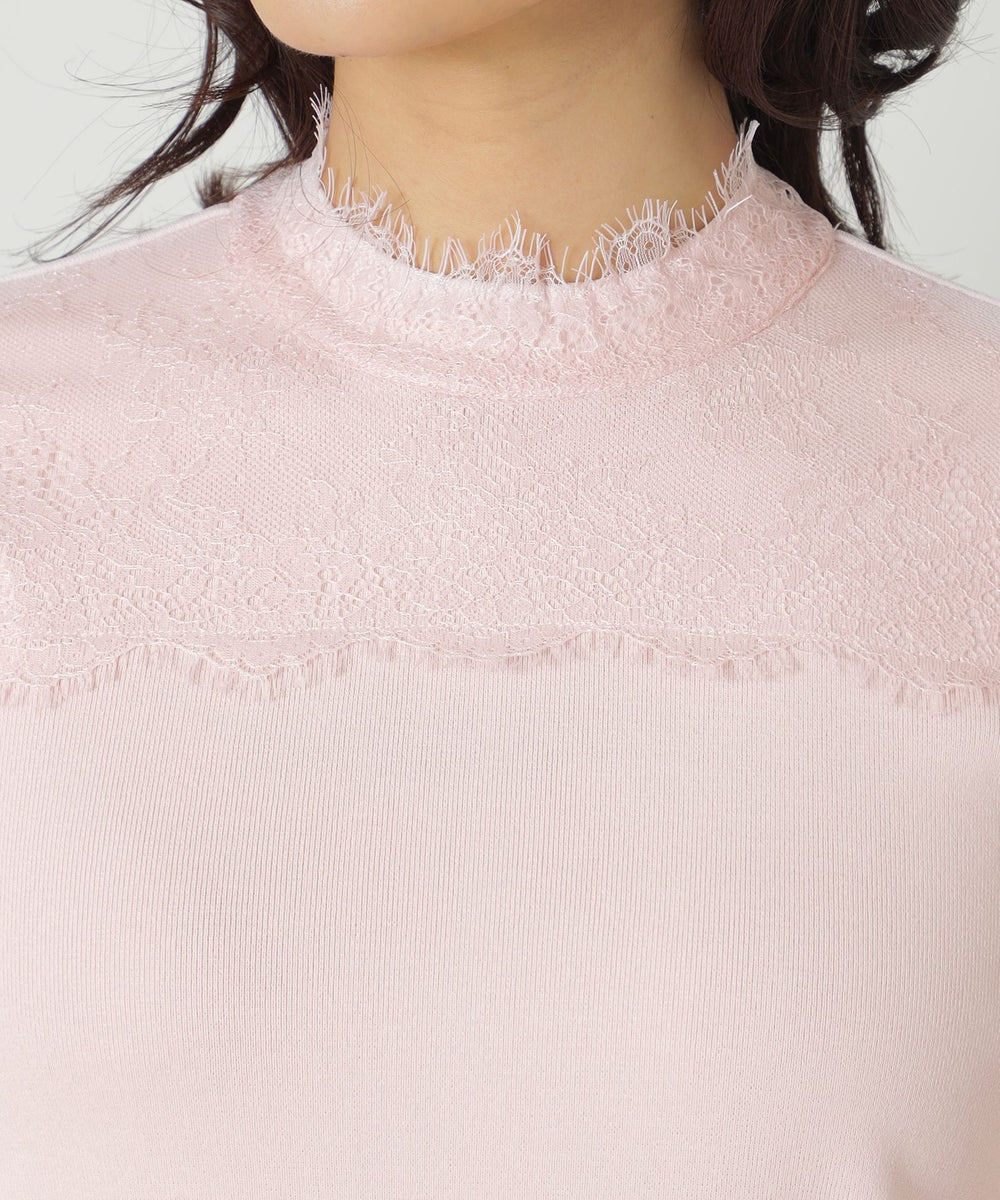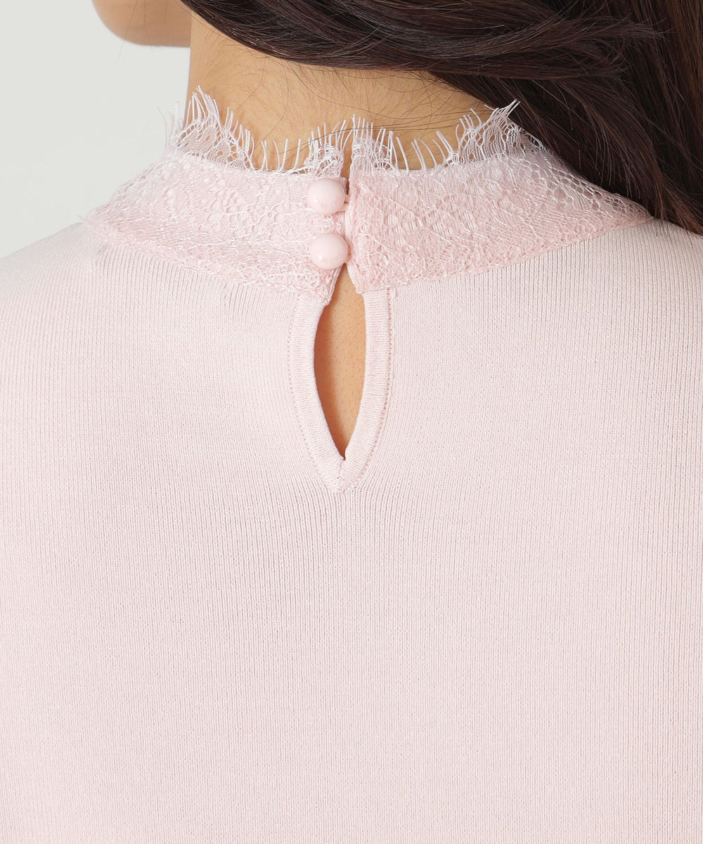 衿から肩ヨークまで薄いラッセルレースをあしらったジャケットのインナー使いにも最適なニットです。