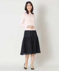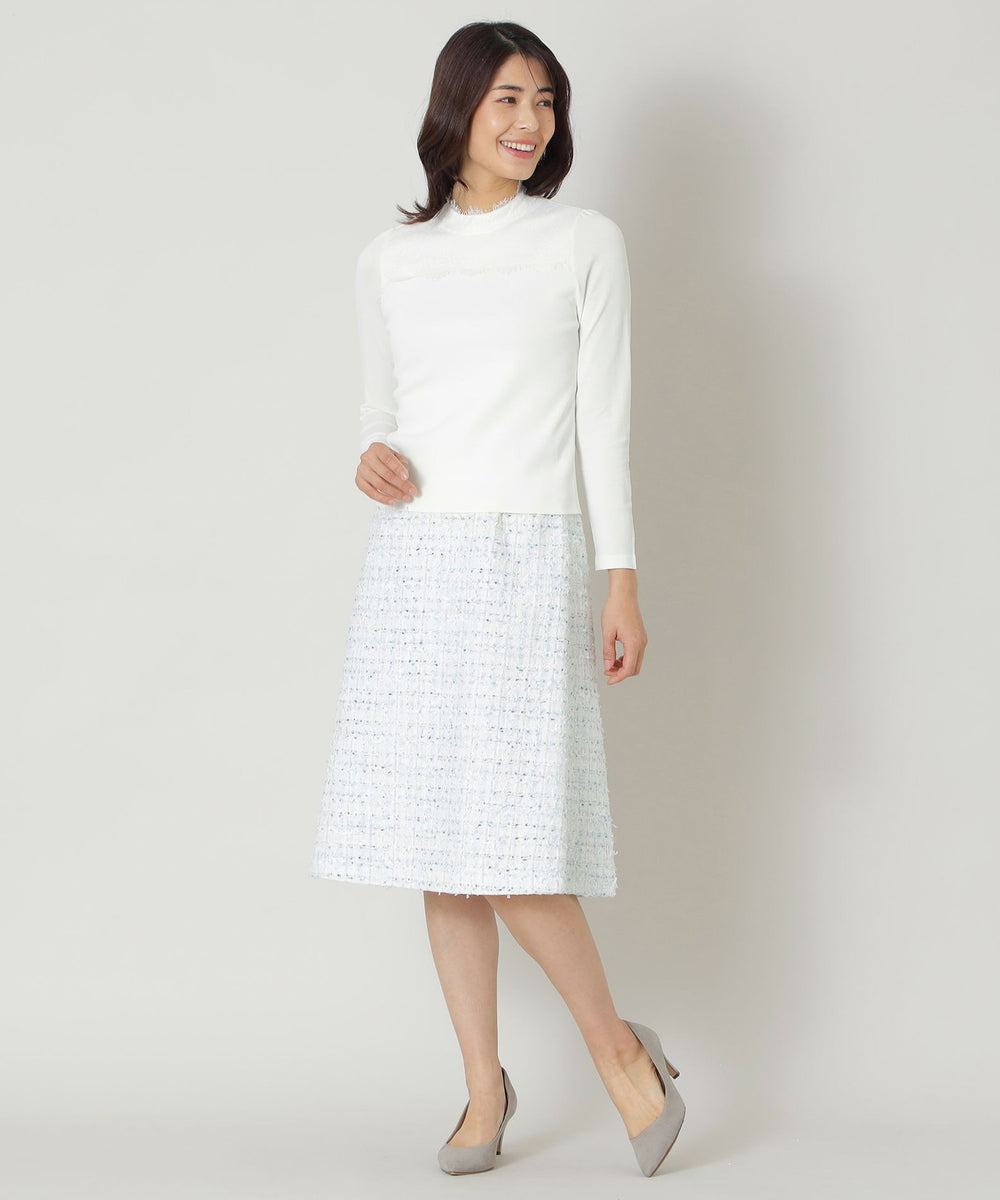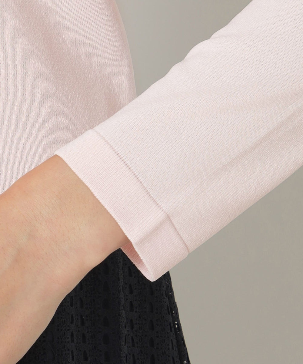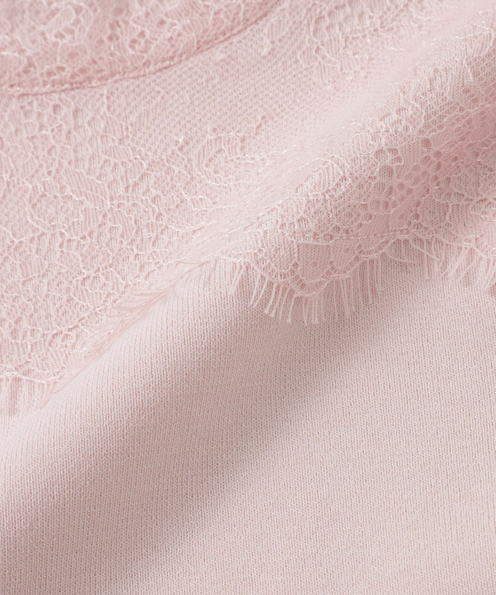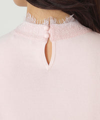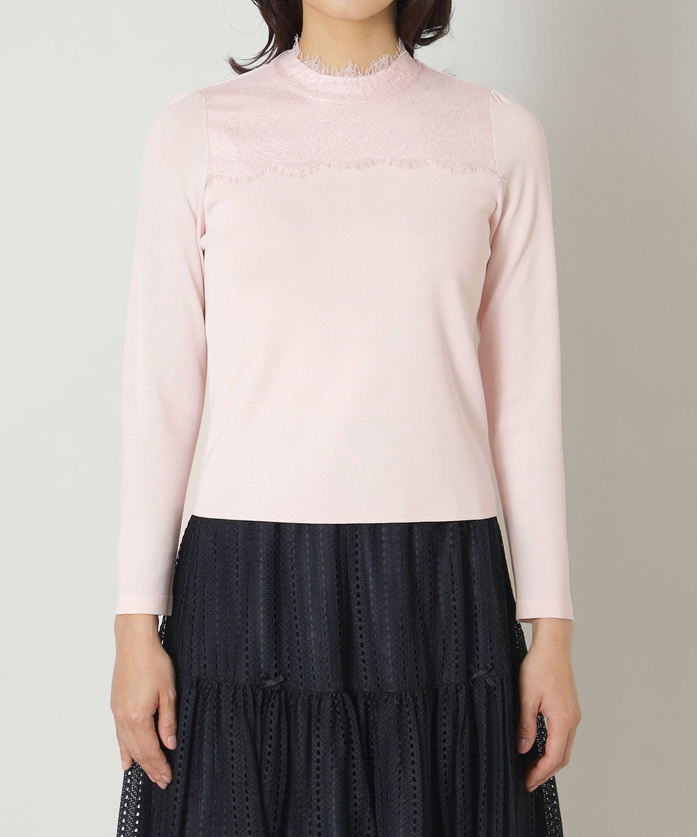 衿から肩ヨークまで薄いラッセルレースをあしらったジャケットのインナー使いにも最適なニットです。