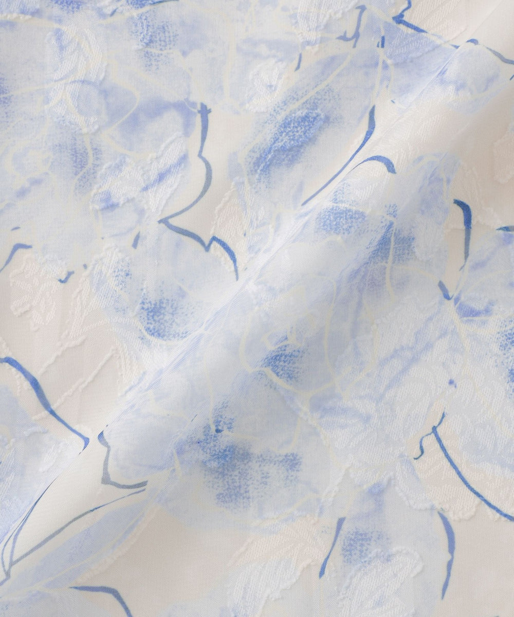 カットジャカードを下地に用いることで、ローズ柄のプリントに繊細な凹凸と奥行きが生まれ、優雅な立体感が際立つ上品な素材です。