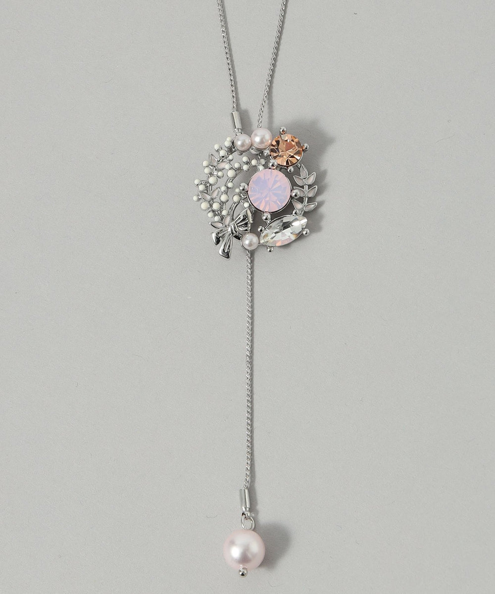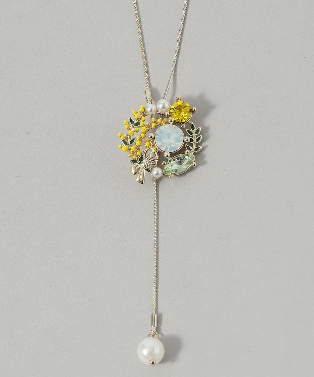 サイドから中心にかけてミモザに模したフラワーブーケを配置して、リボンやビジューで華やかに彩ったスライドタイプのネックレス。スライドしてパーツを異動してお好みの位置で着用していただけます。